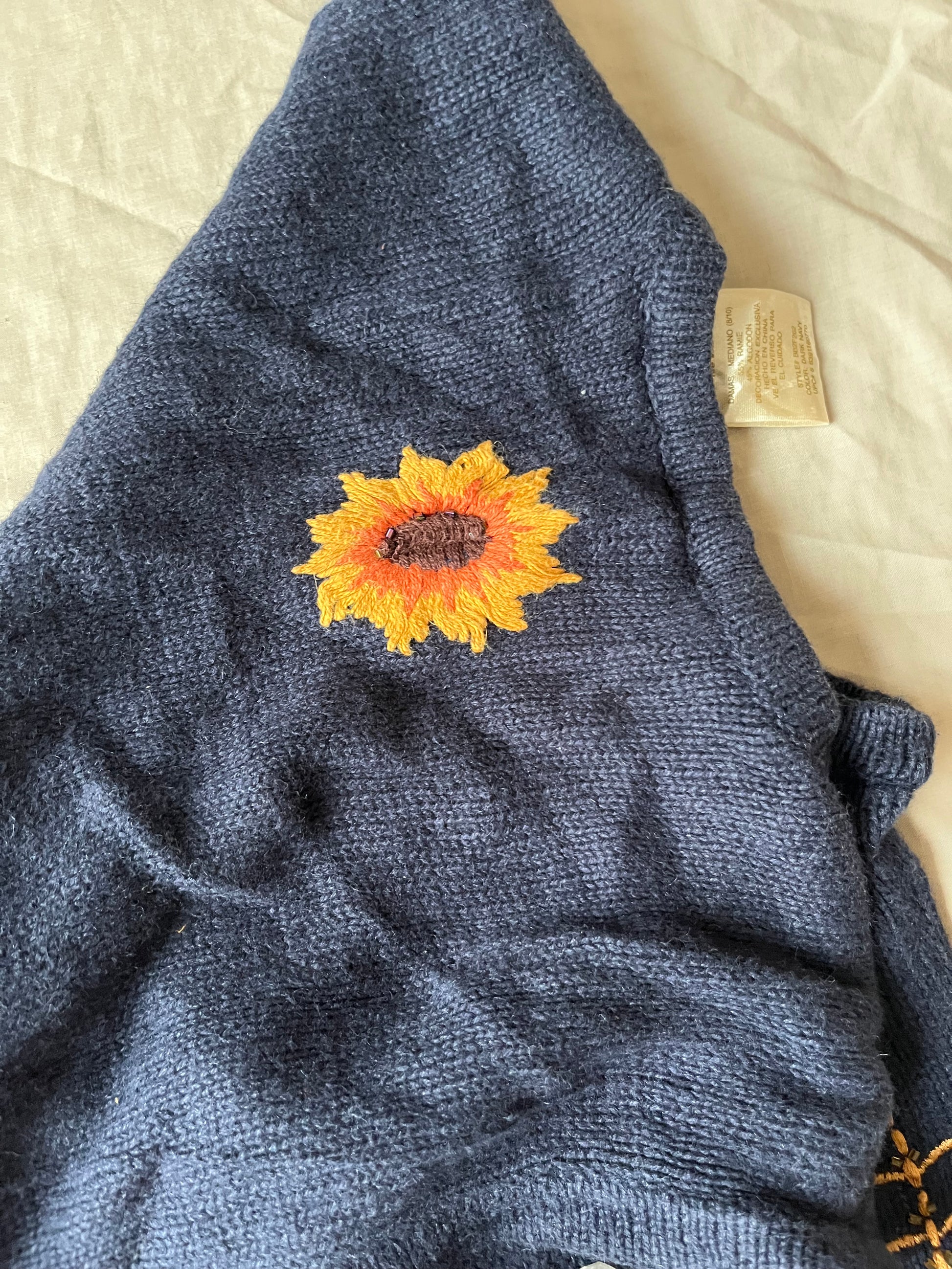 Adorable 1990s blue sweater vest with a scarecrow and pumpkin patch scene on it! Button up front with a comfy fit. Made from ramie and cotton.