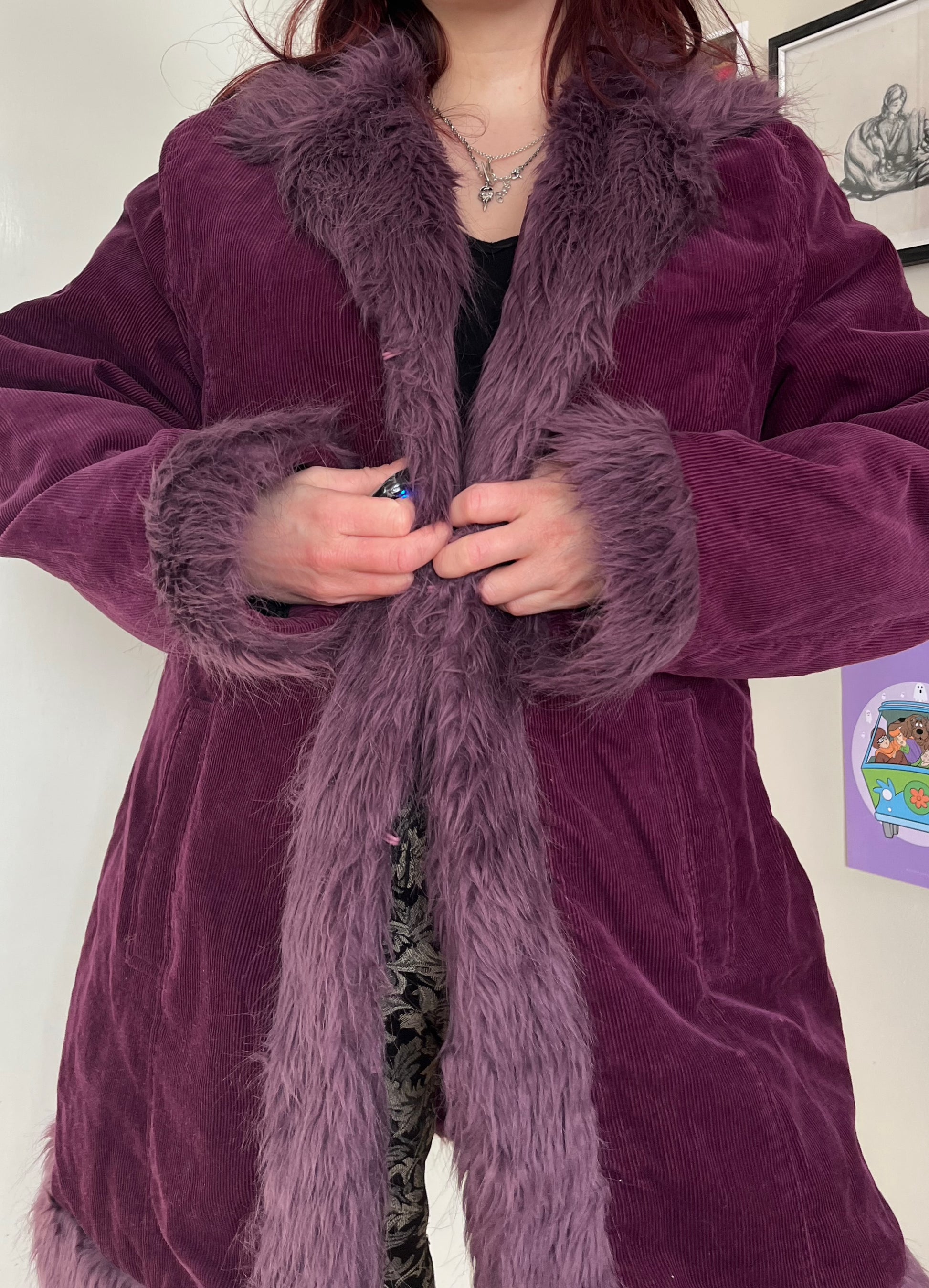 2000s purple corduroy afghan coat! This has clasps on the front, faux fur trim and a lining on the inside.