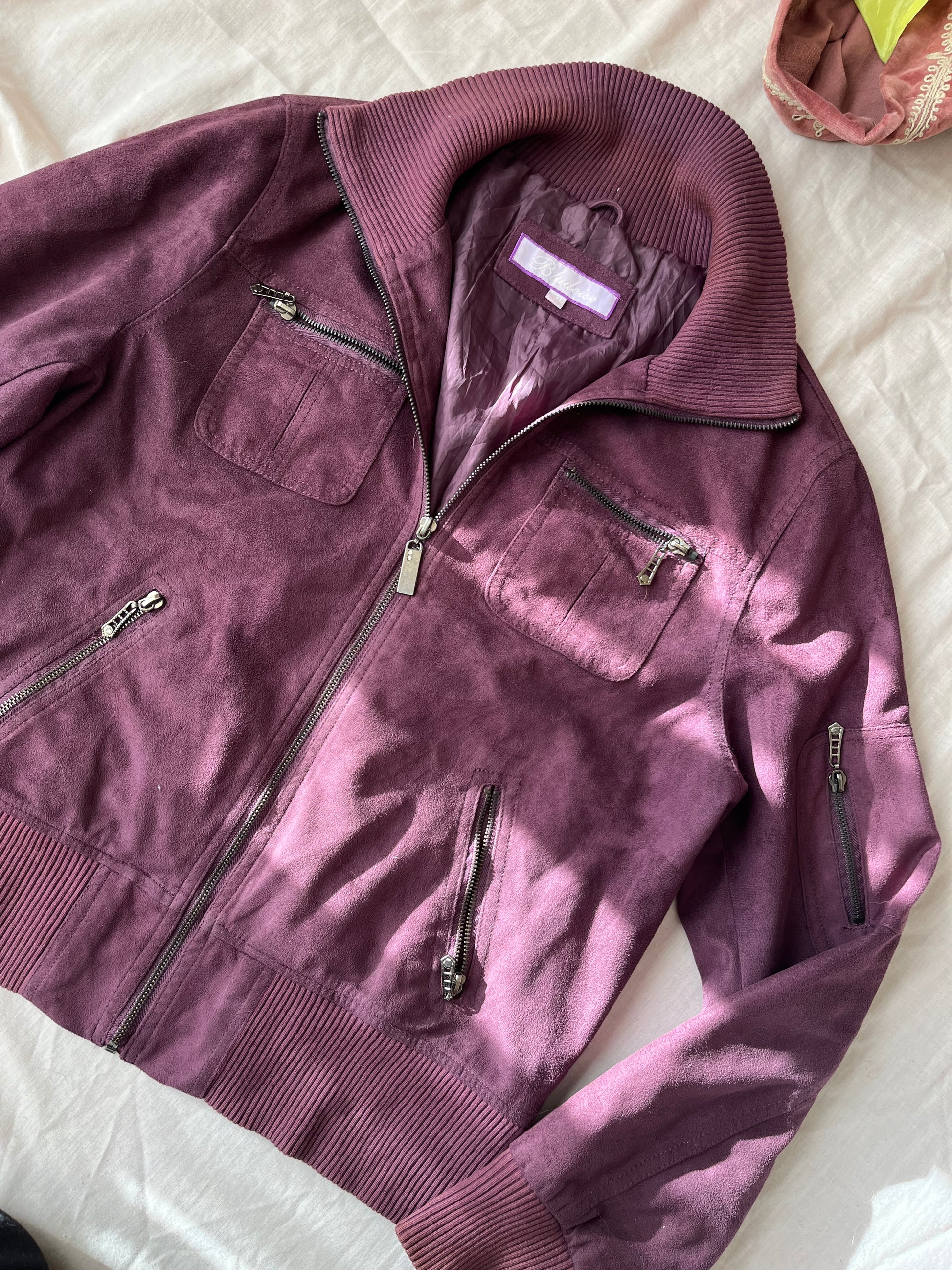 1990s purple bomber jacket! This has a flattering fit and a zip up front.