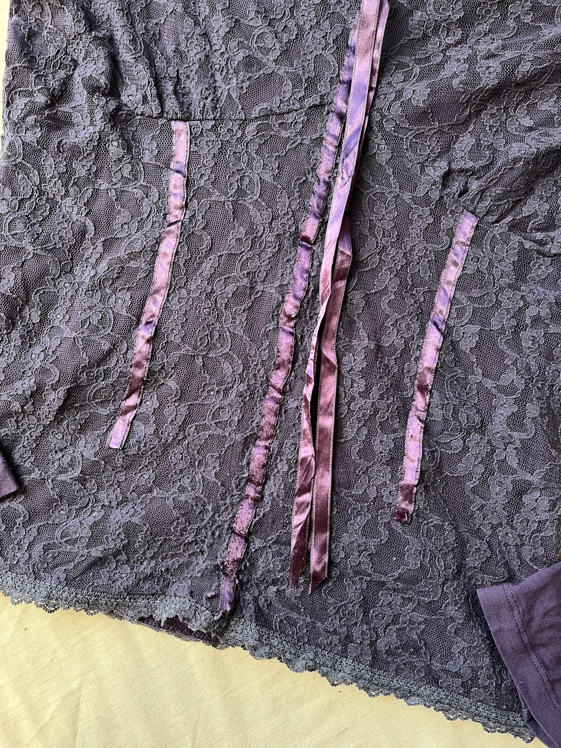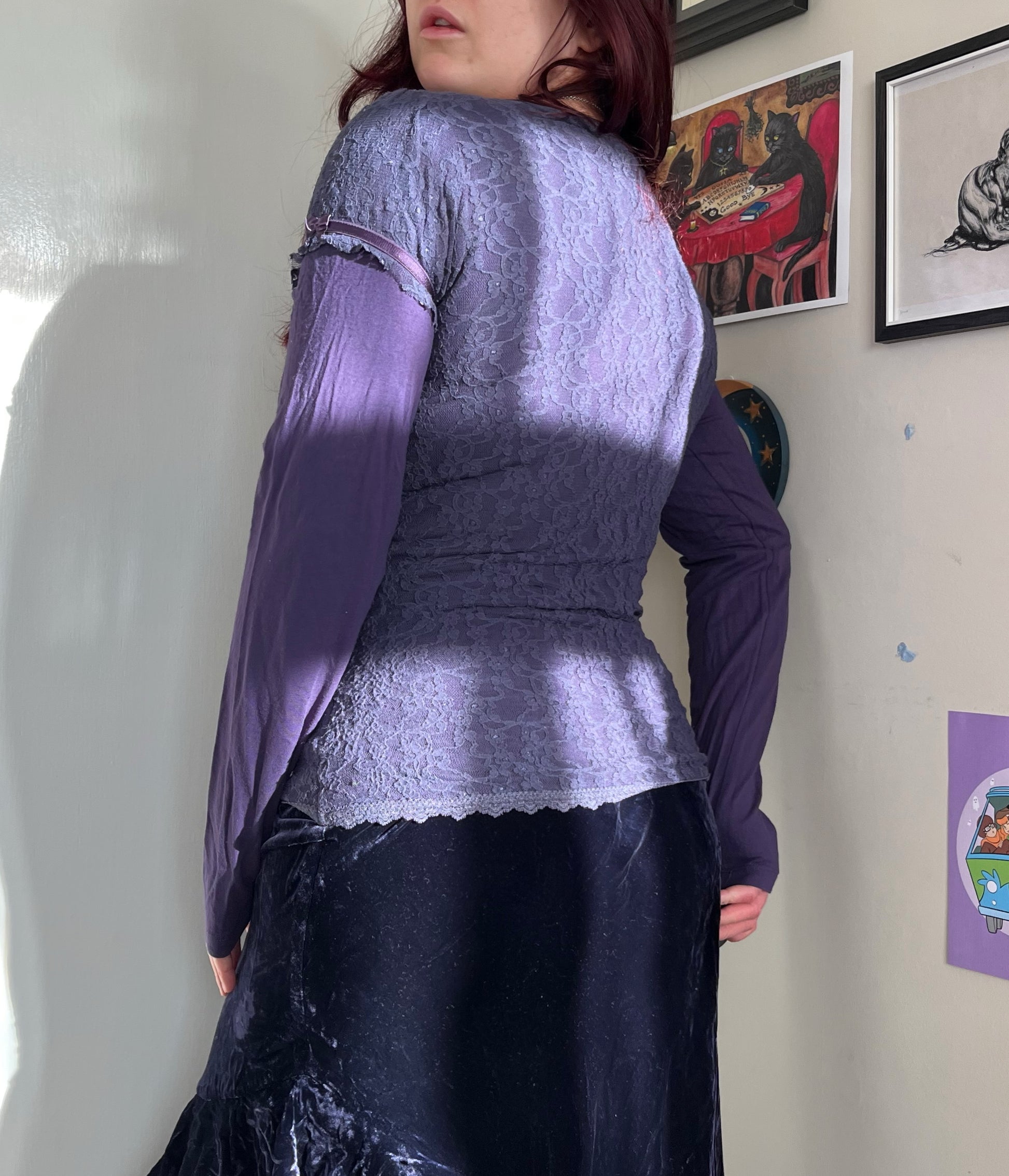 2000s purple lace top with long sleeves! This is meant to look like two tops layered over each other. Stretchy fit