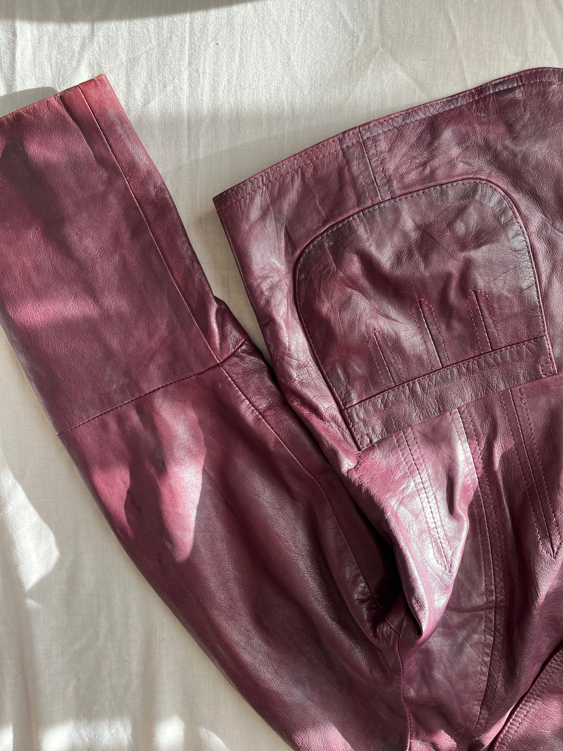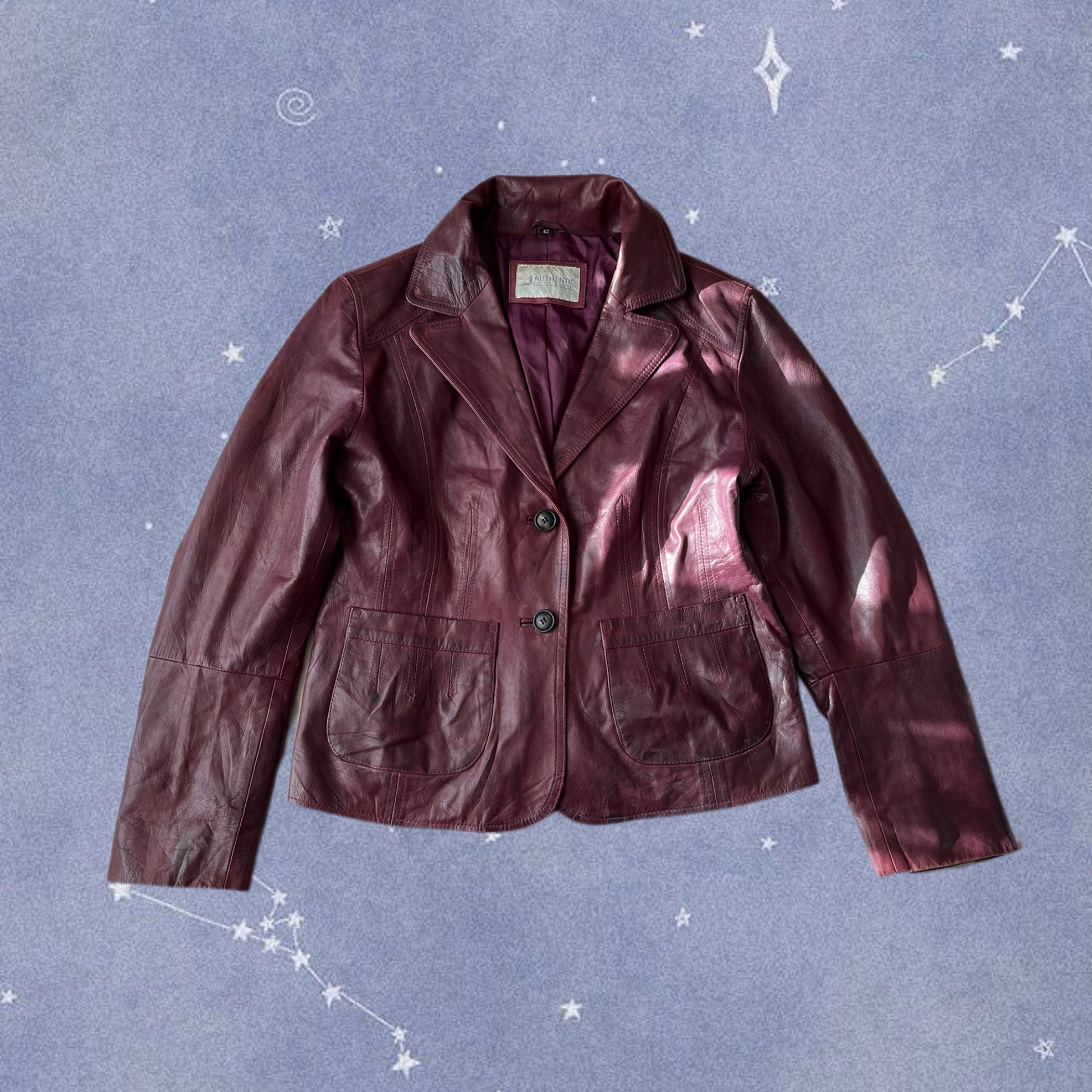 Beautiful 1990s purple leather jacket. This has buttons on the front and a flattering fit.