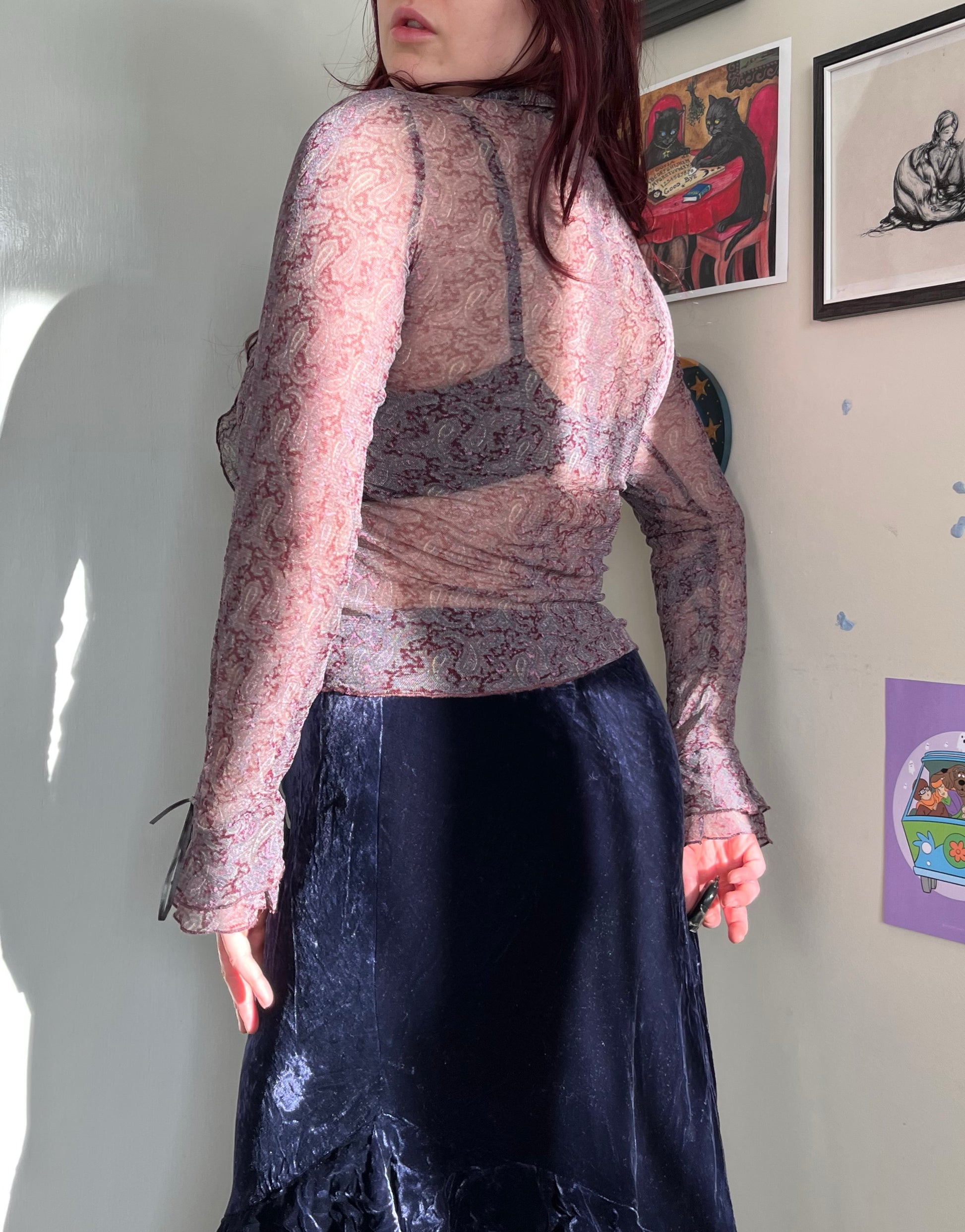 Gorgeous 2000s purple paisley mesh top! Has flared sleeves, a stretchy fit and ruffles on the front.
