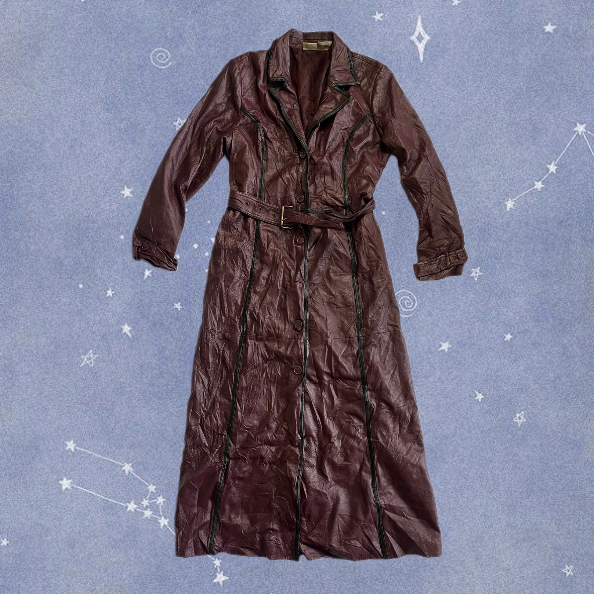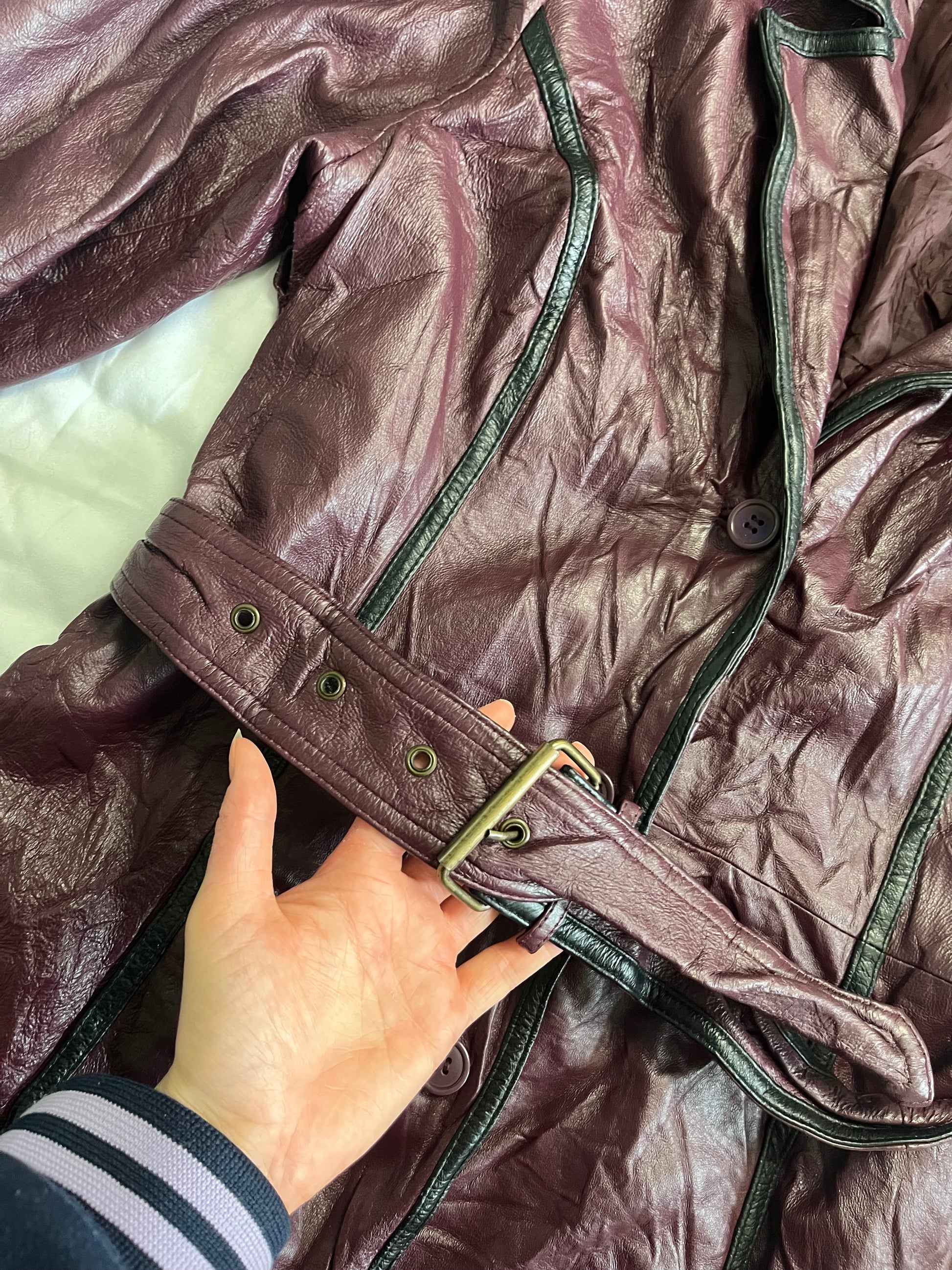 1990s burgundy/plum leather trench style coat! This has buttons on the front, a belt at the waist and is made from real leather.