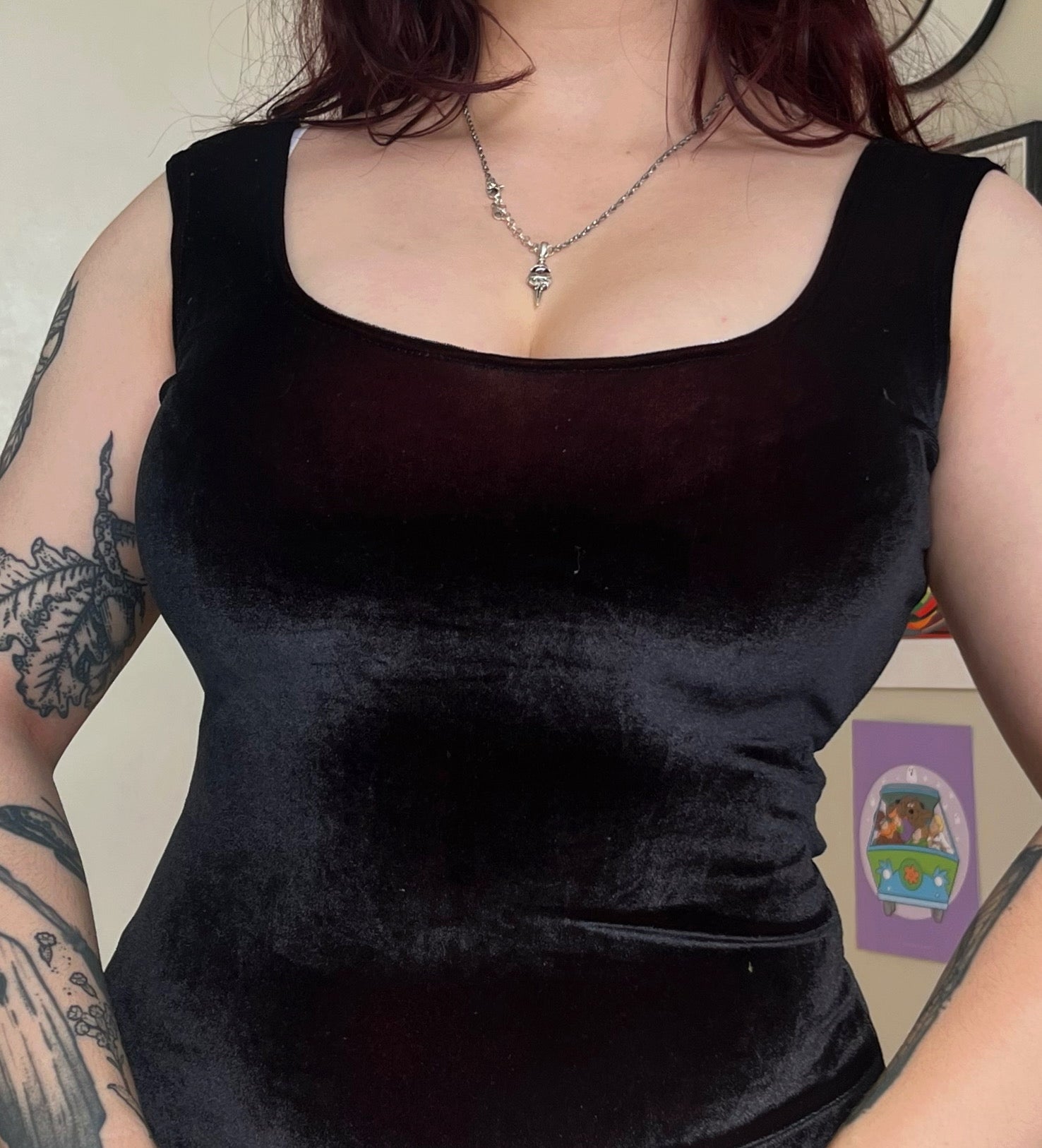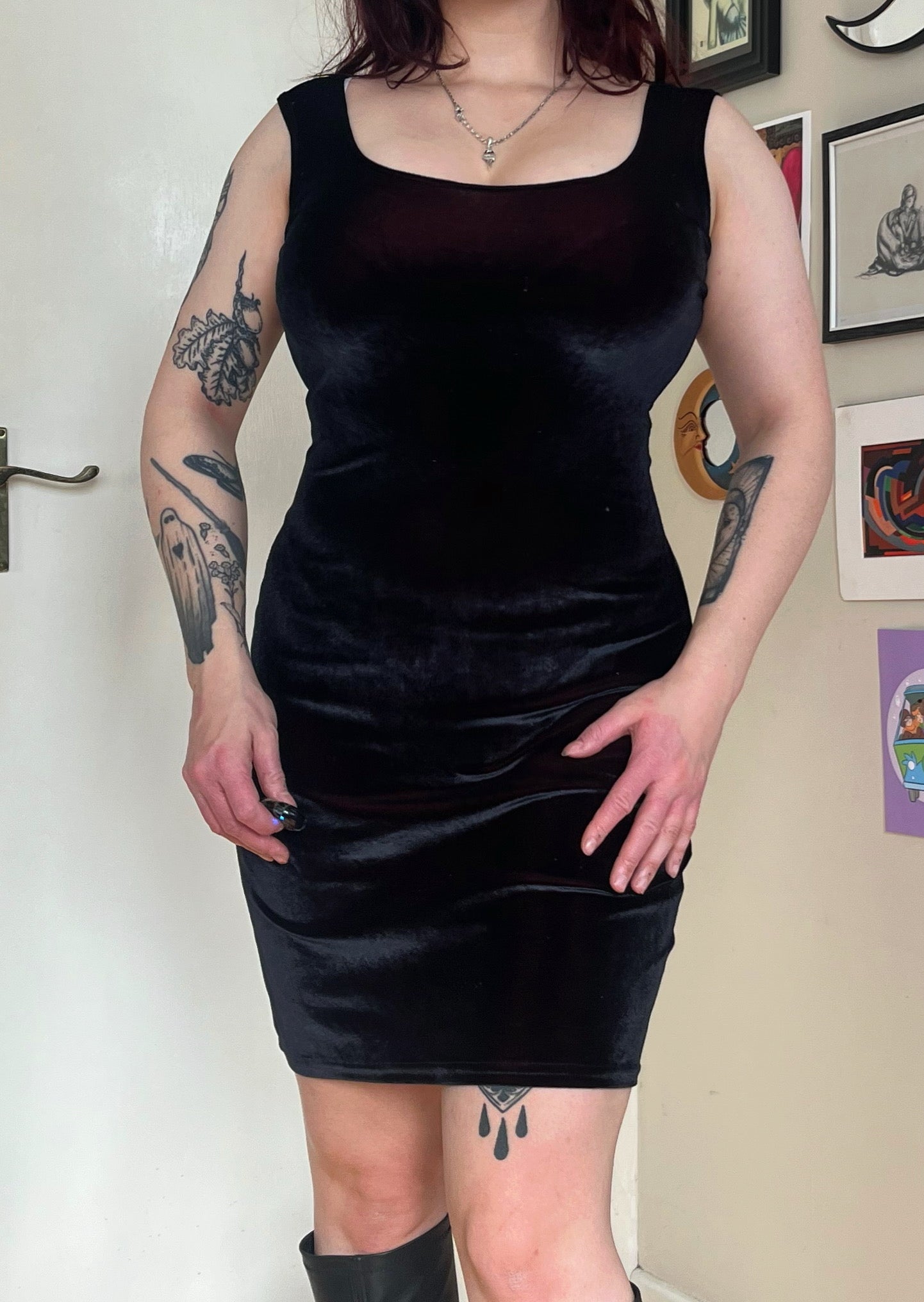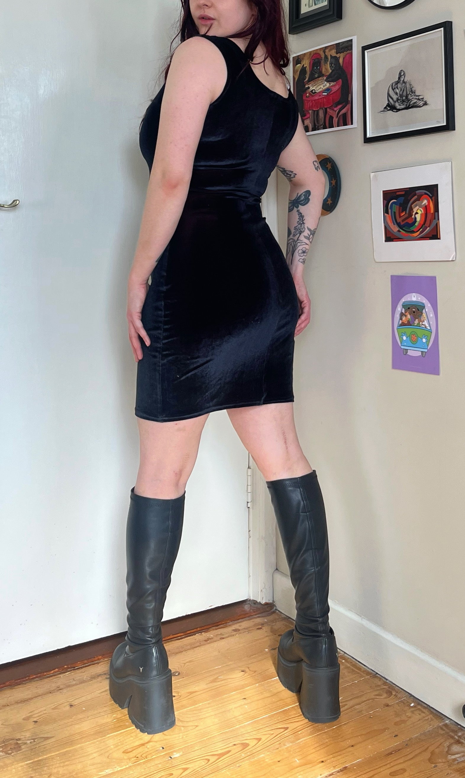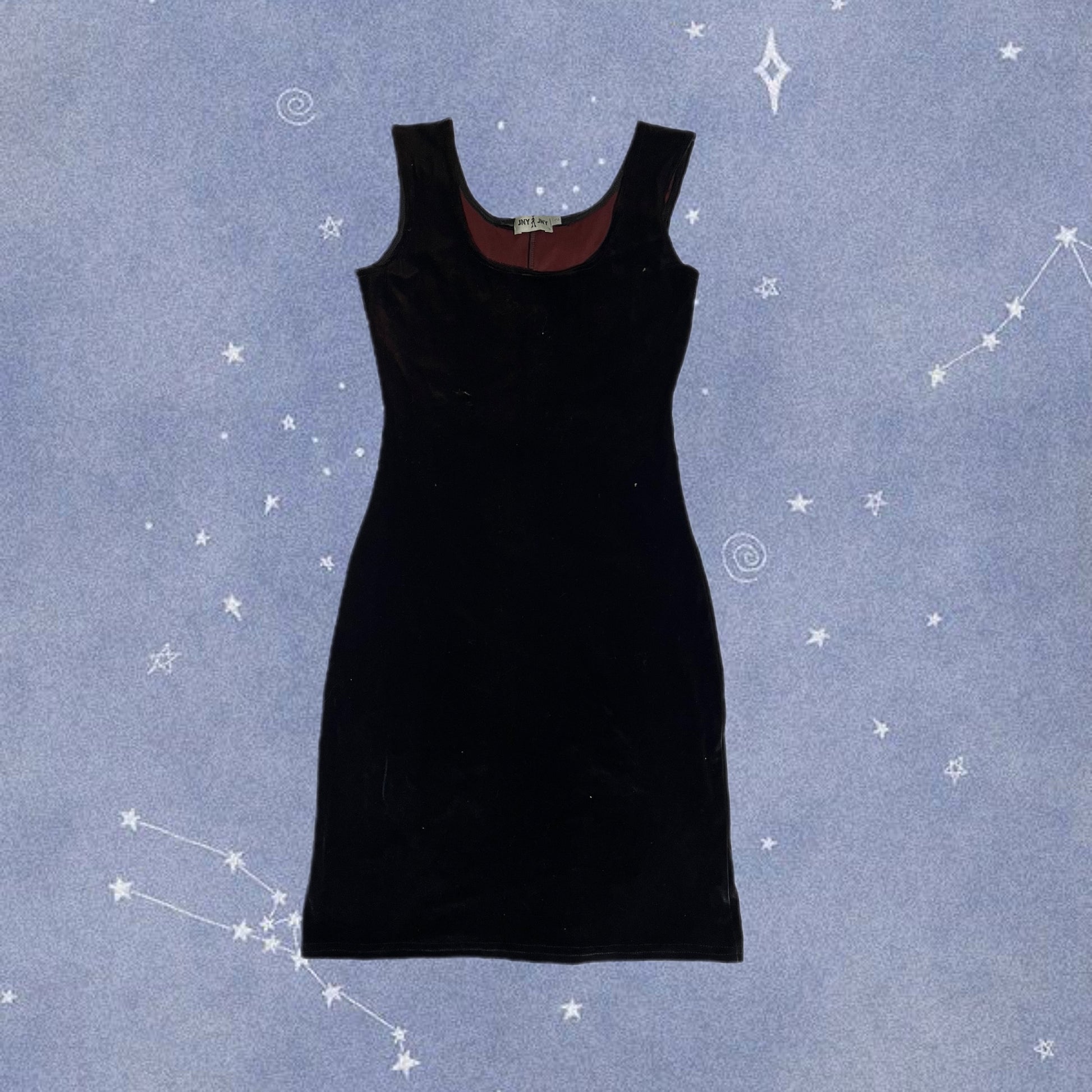 1990/2000s black velvet mini dress! Form fitting with a stretchy fit and red hues to it.