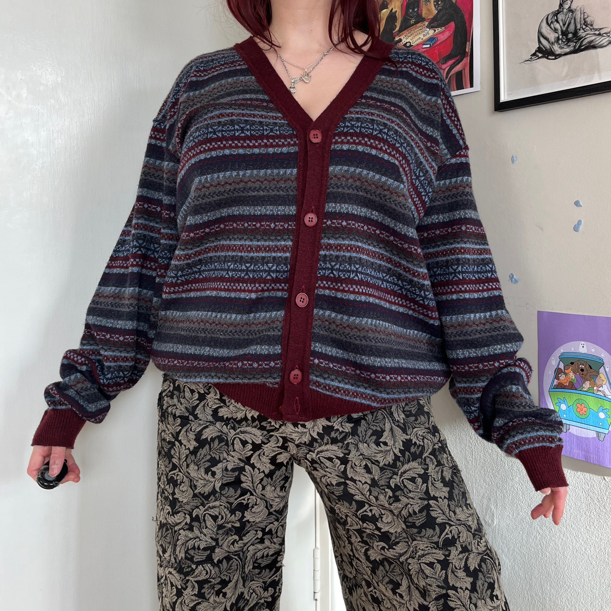 1990s red and blue cardigan! Lovely slouchy fit with a button up front and gorgeous design. Made from wool and acrylic materials.