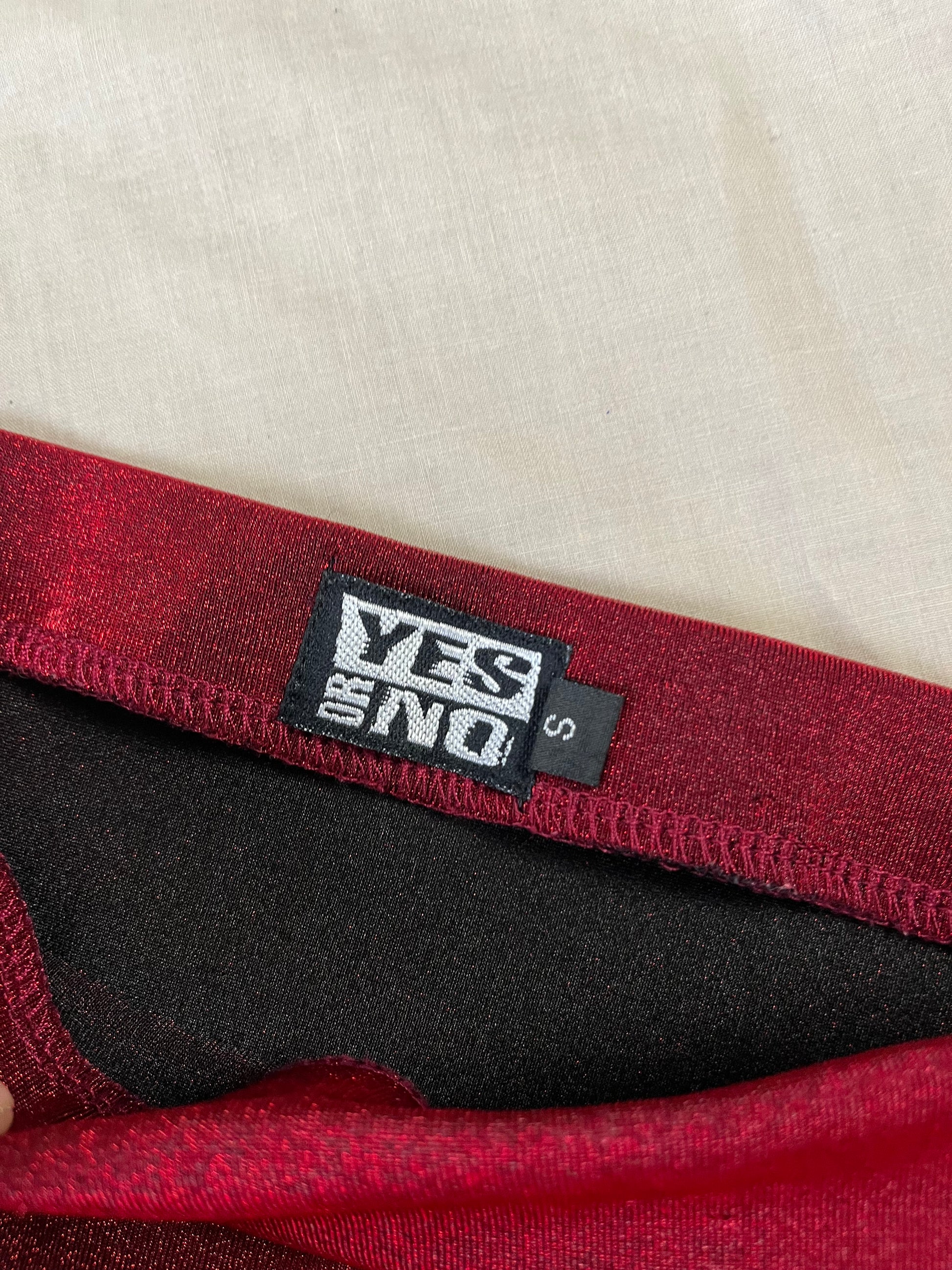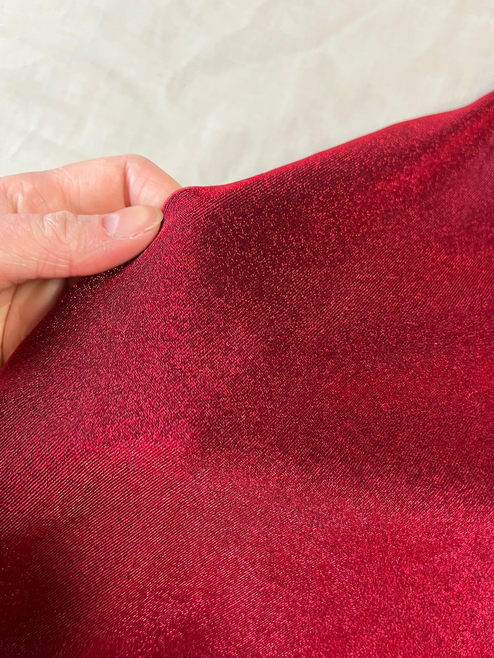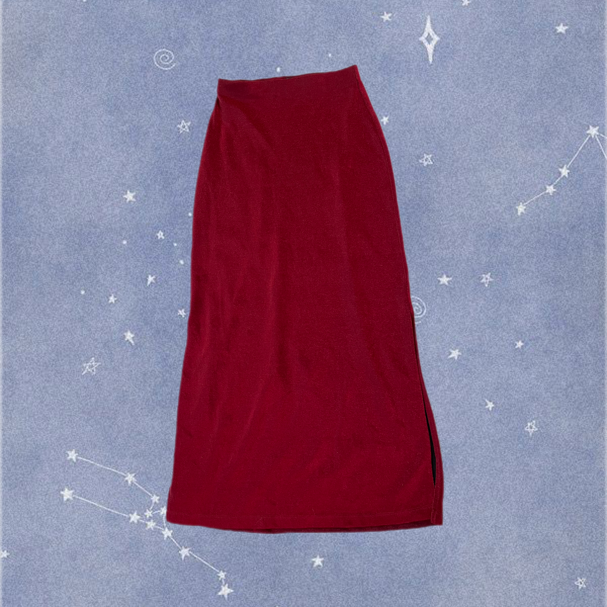Gorgeous 1990s red long skirt! This has a shimmery design and a leg slit with a stretchy waist.