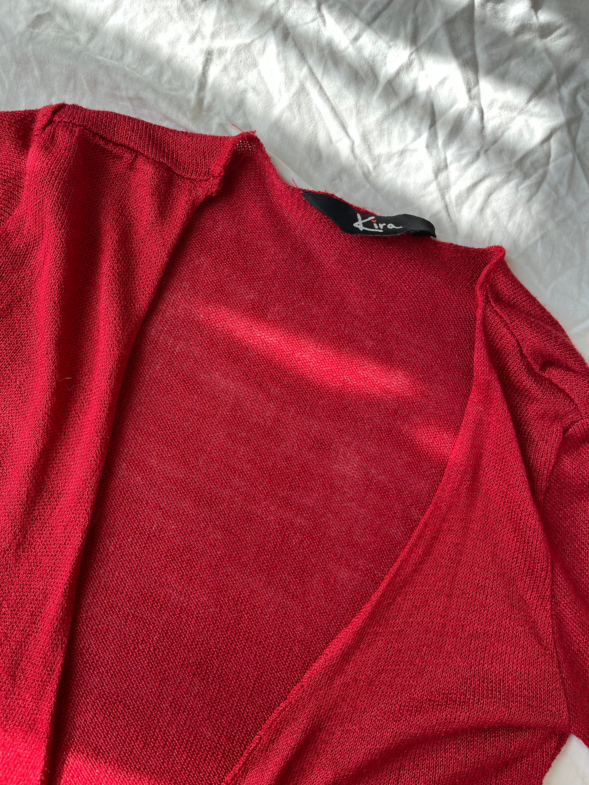 2000s red micro mesh cardigan! Lovely lettuce hem on this and can be worn open or tied at the front.