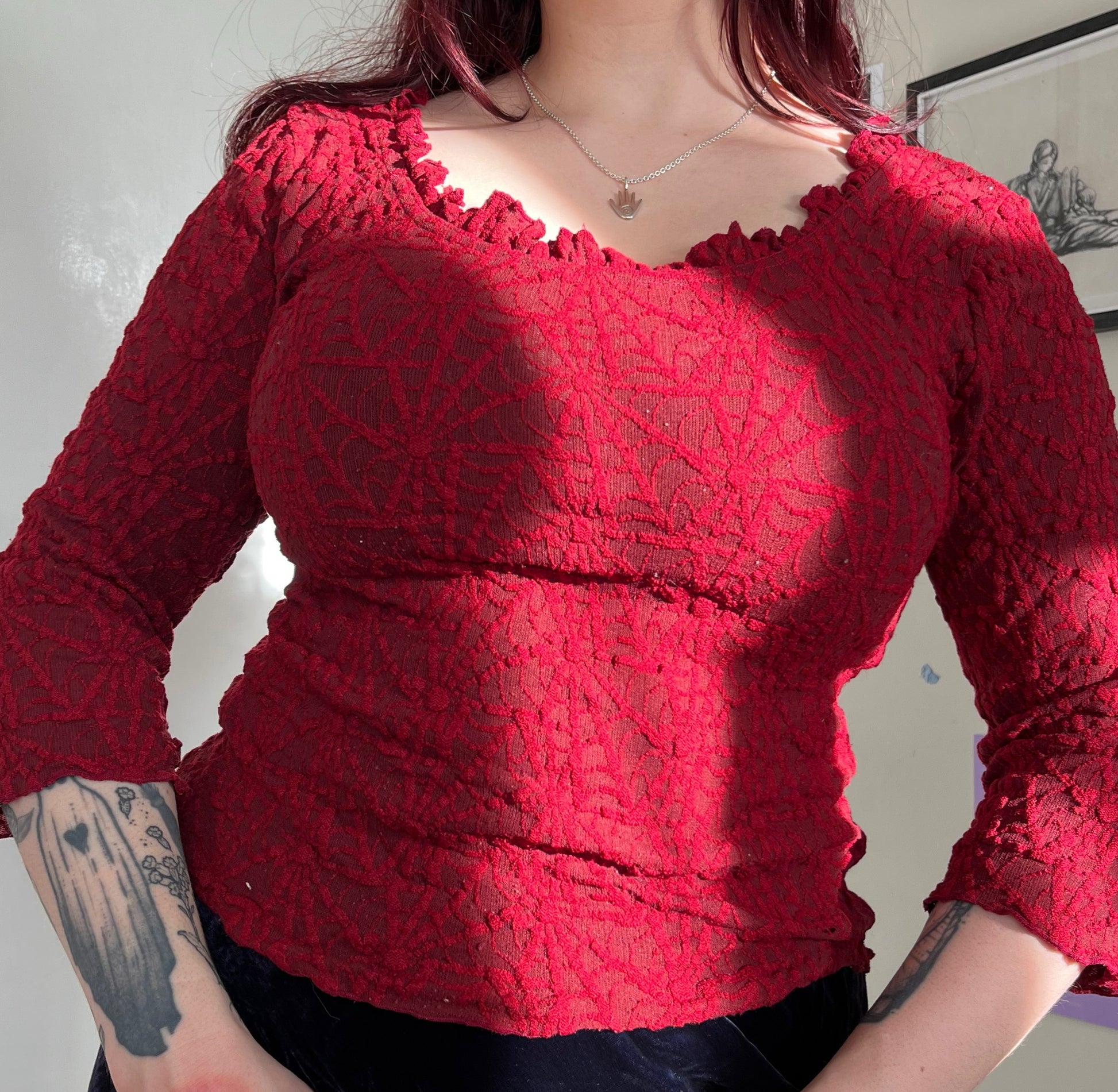 2000s red patterned top by Orsay! Stretchy top with 3/4 length sleeves.