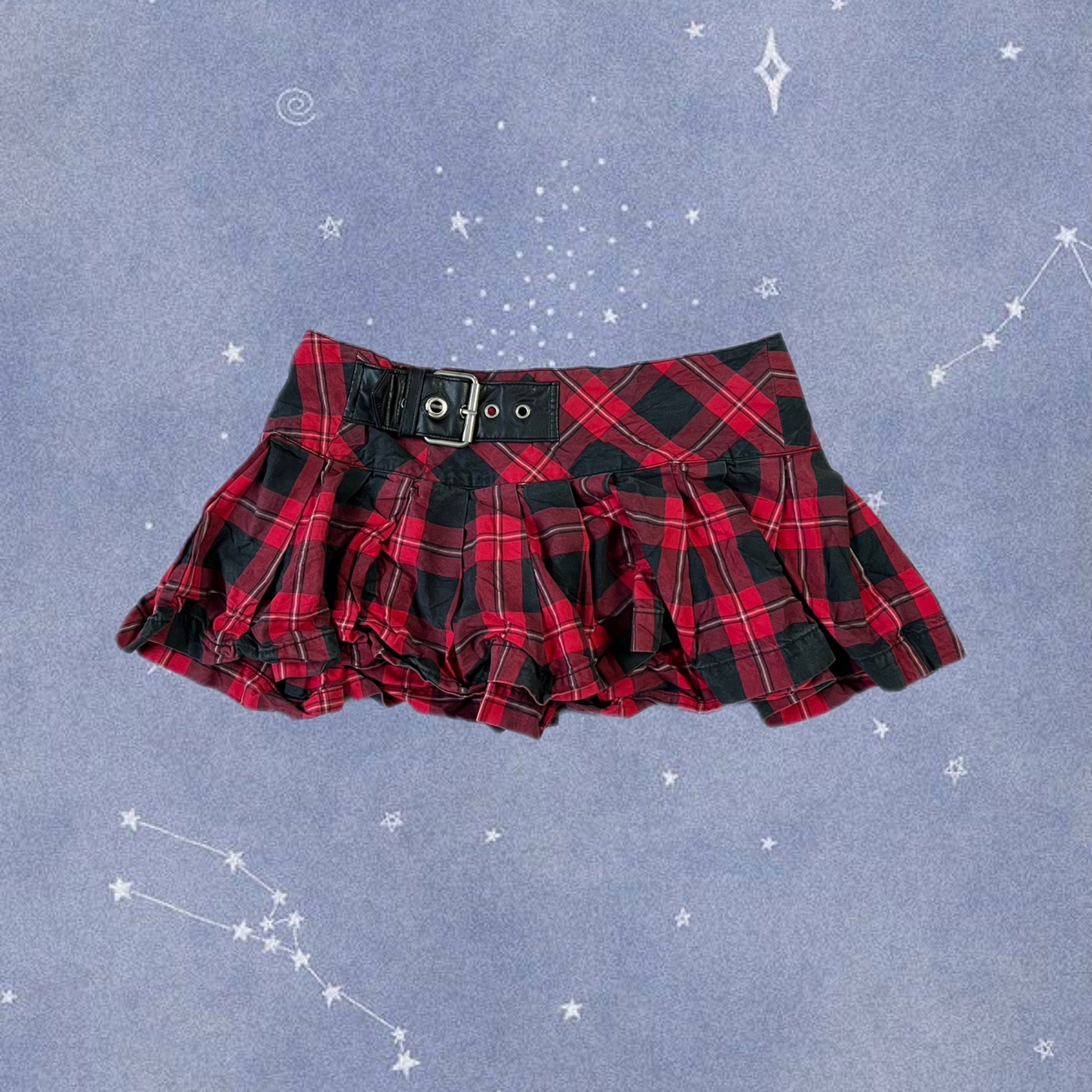 Super cute 2000s red and black plaid mini skirt! This has a belt design and is low waisted.