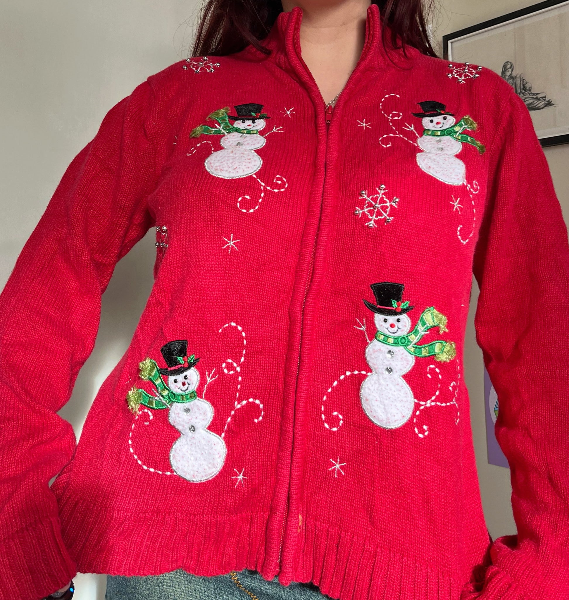 1990s red zip up front cardigan! Features a snowman design on the front.