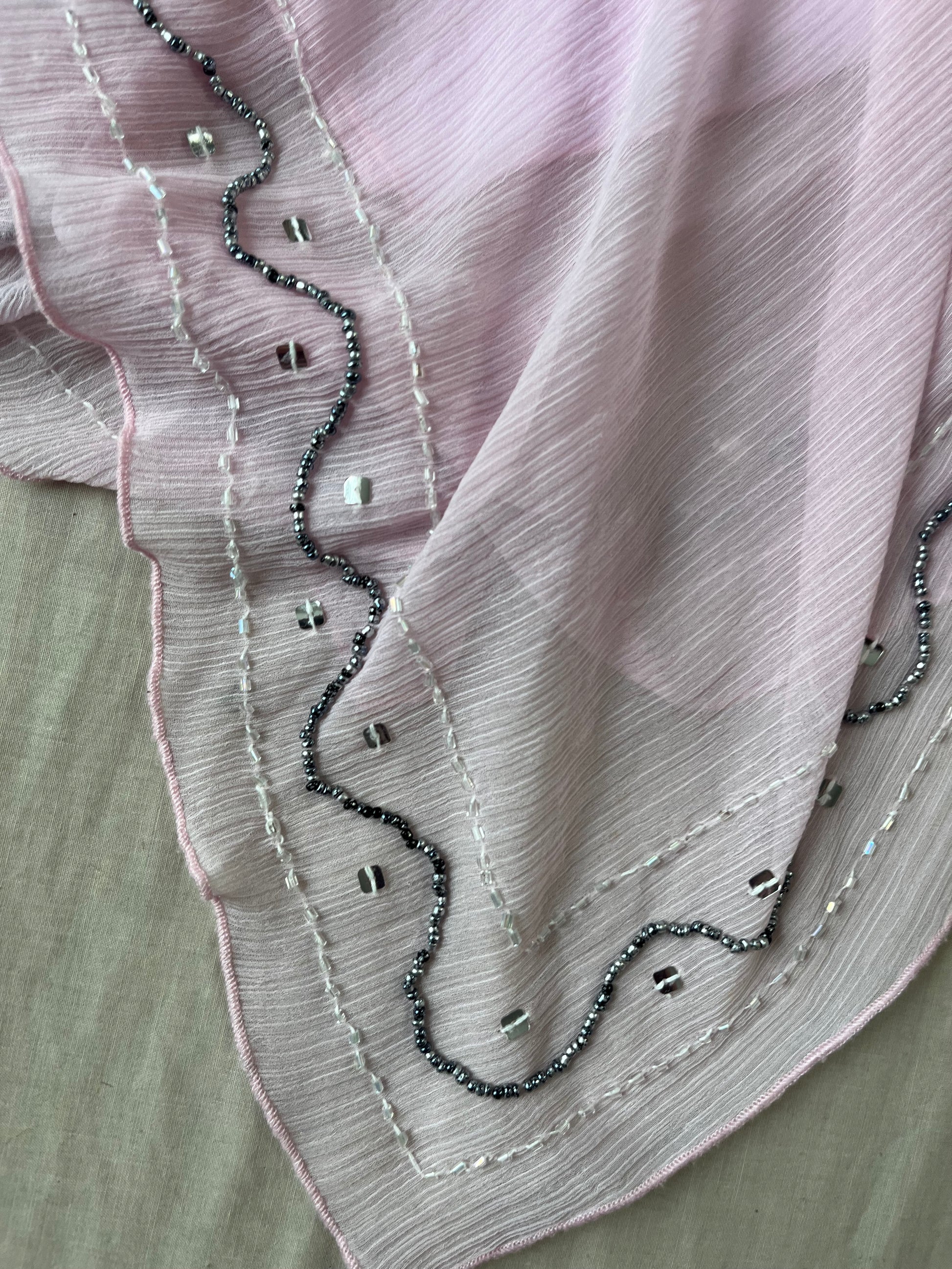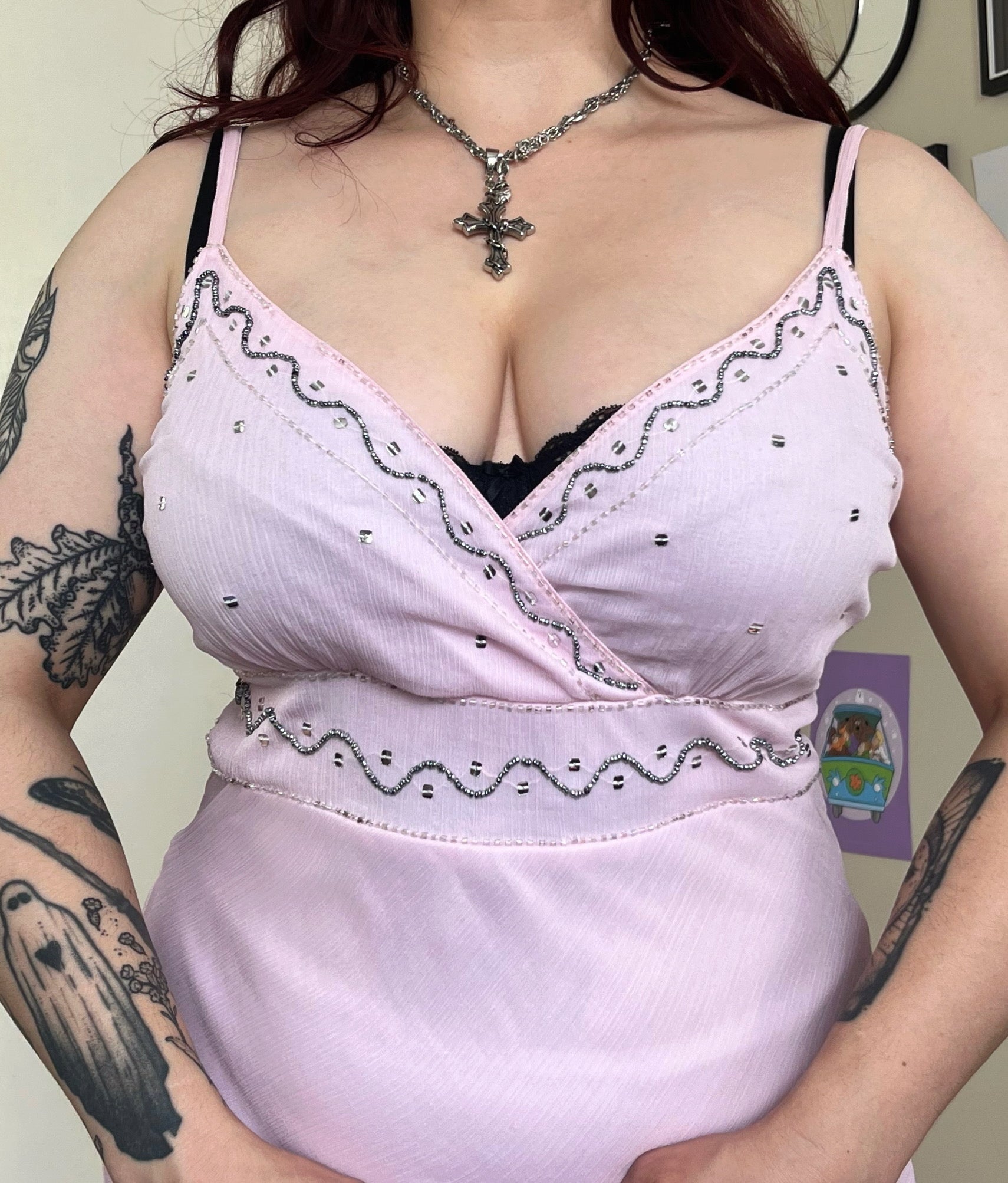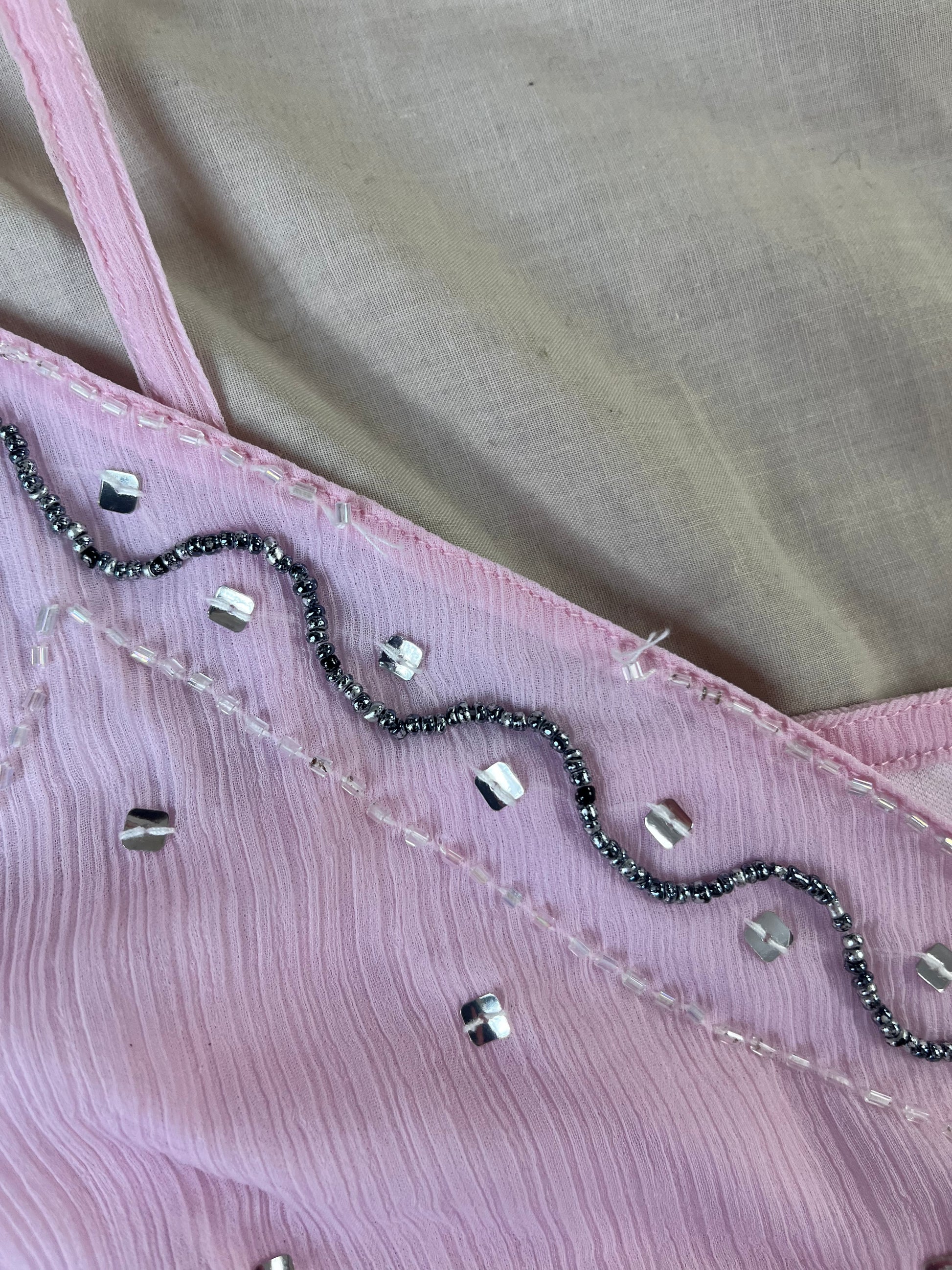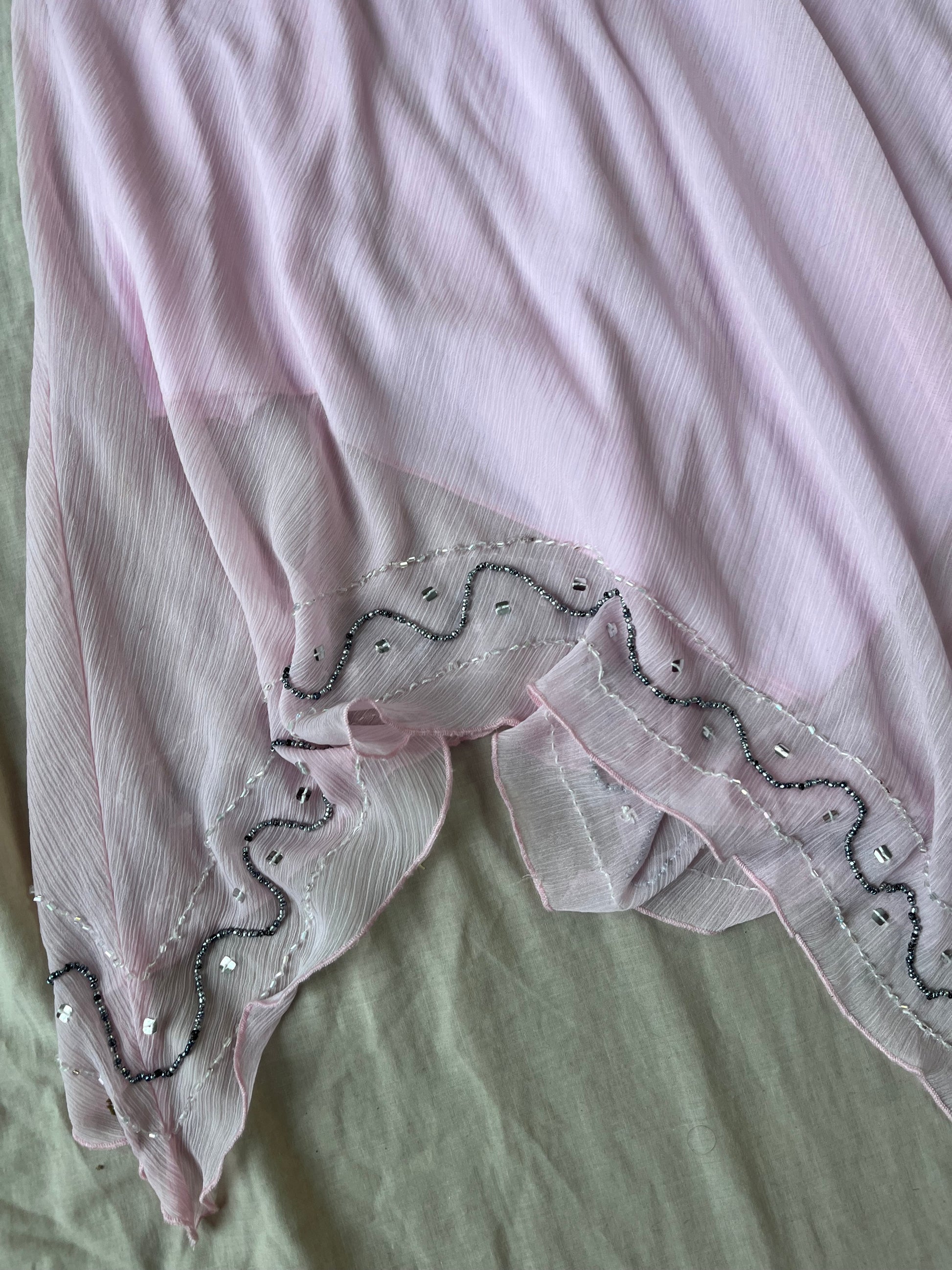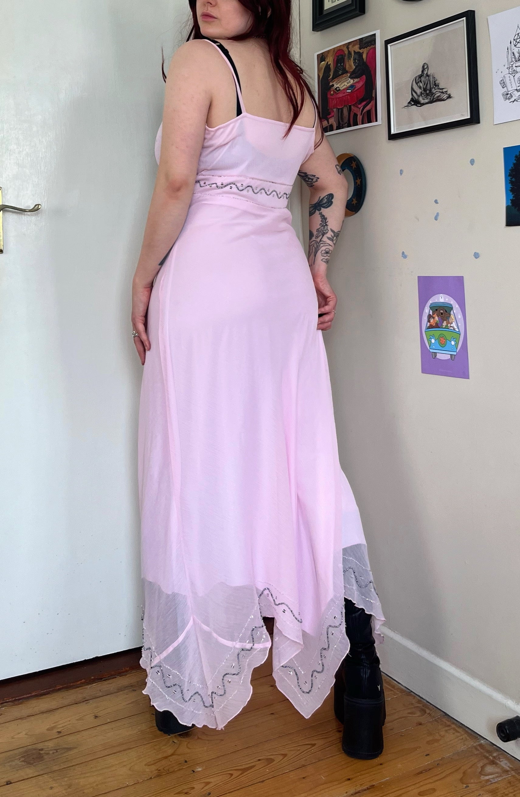 Gorgeous 1990s/2000s pink mesh dress! Asymmetrical hem with a beaded design. * Missing a part of the beading on the hem near the collar, reflected in price. See last photo.