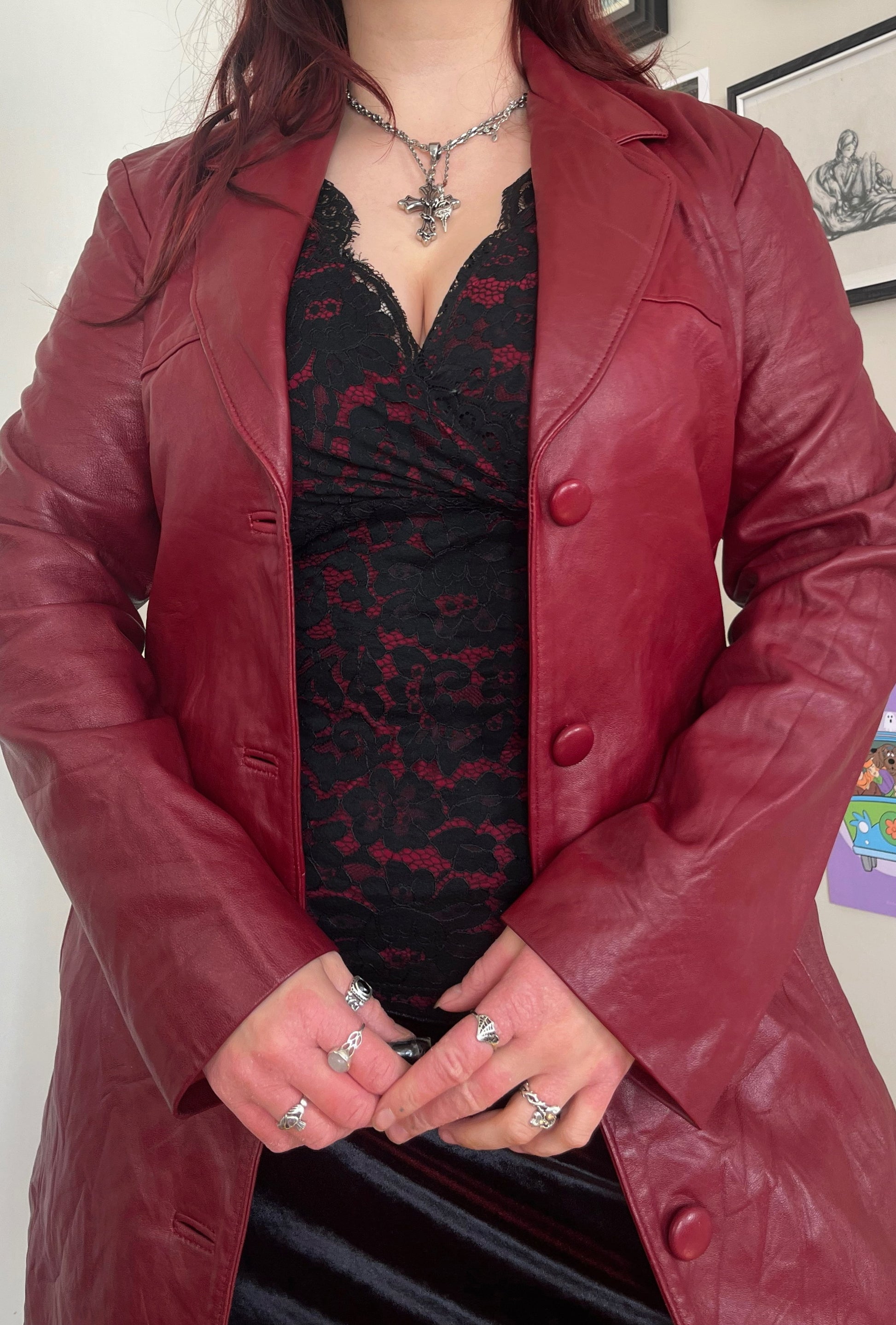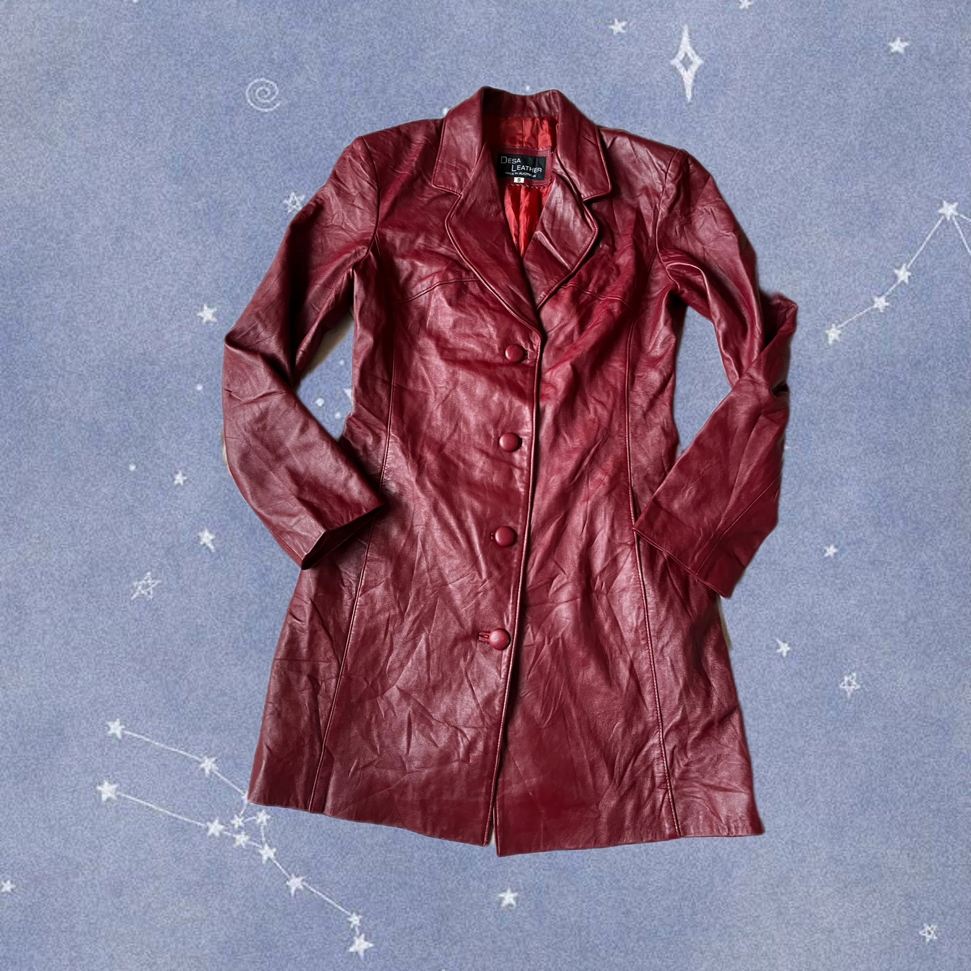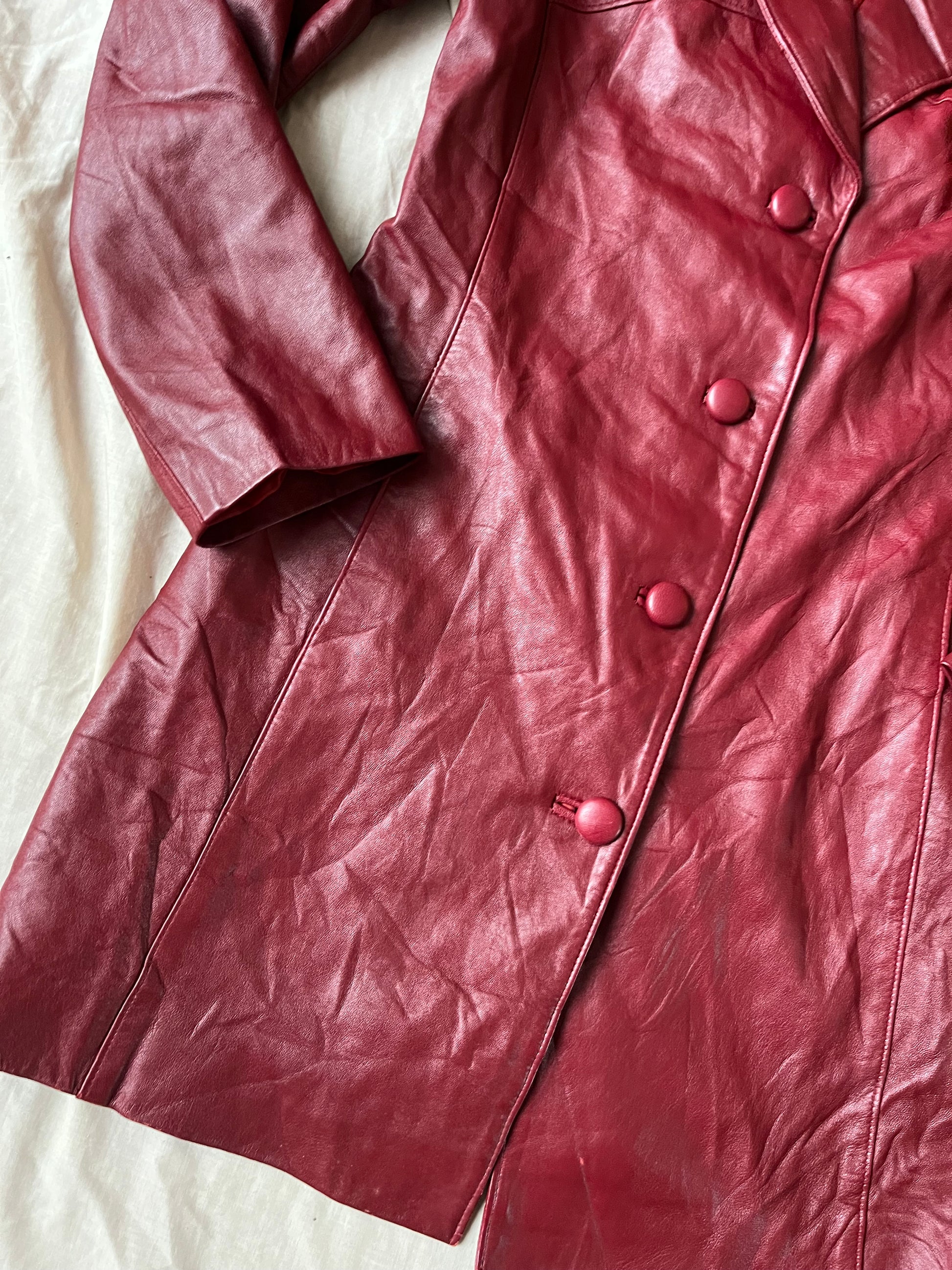 1990s red leather button up front trench coat! Gorgeous flattering fit and made of 100% real leather.