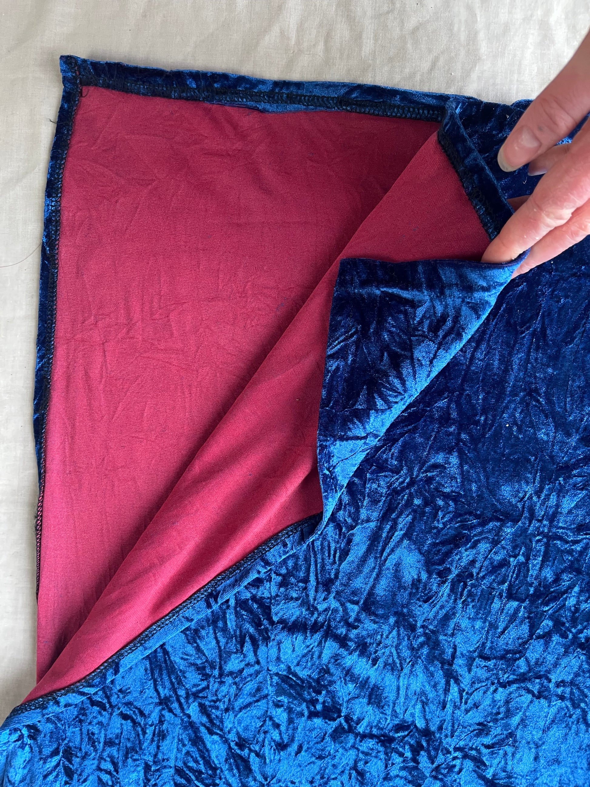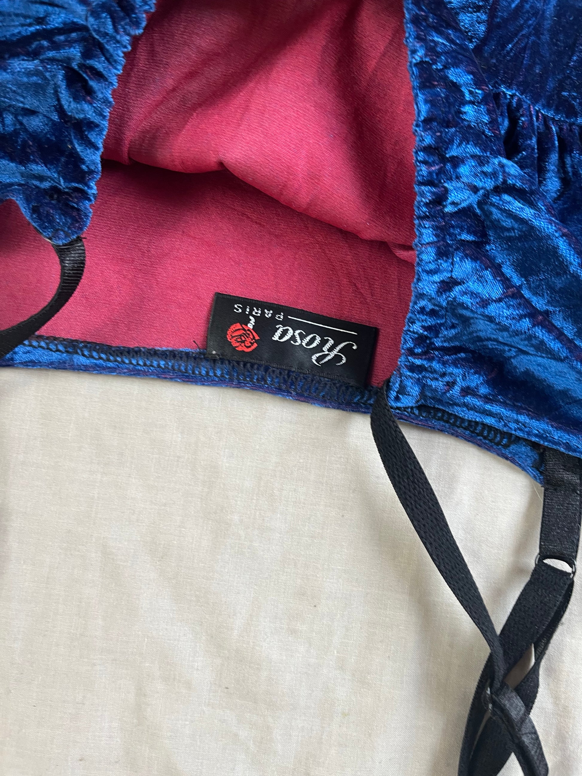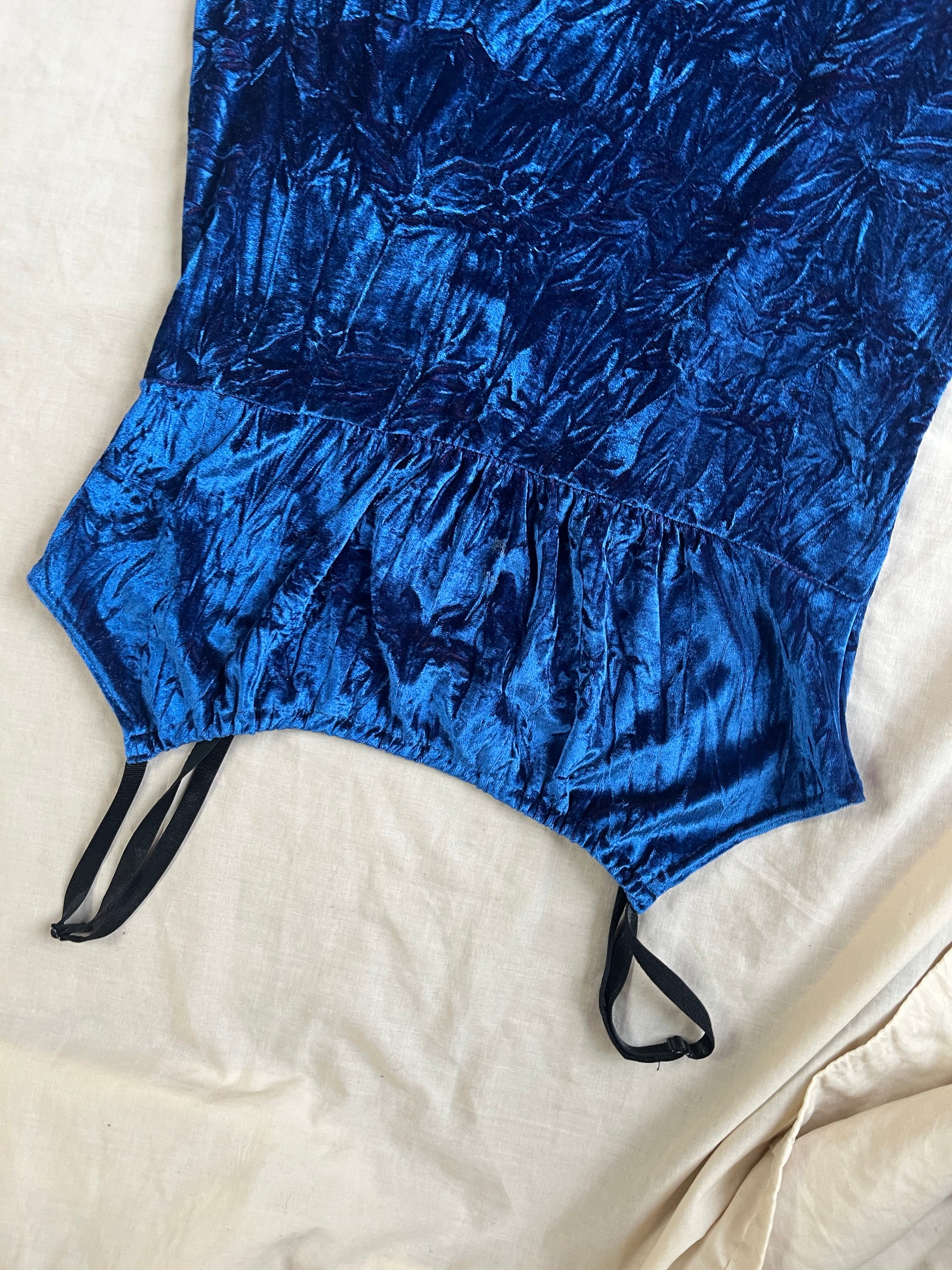 Beautiful 1990s blue velvet dress with red hues to it! Stretchy fit with a leg slit and adjustable shoulder straps.