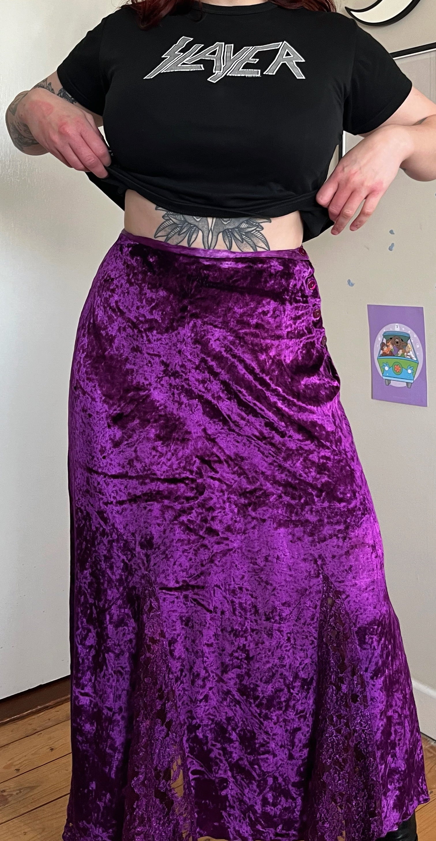 Gorgeous 1990s purple velvet skirt! Has buttons on the side and an asymmetrical hem.