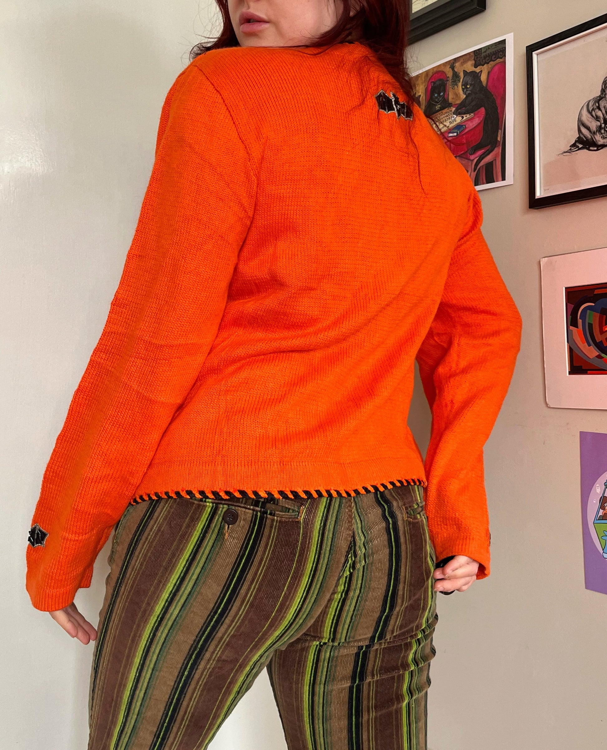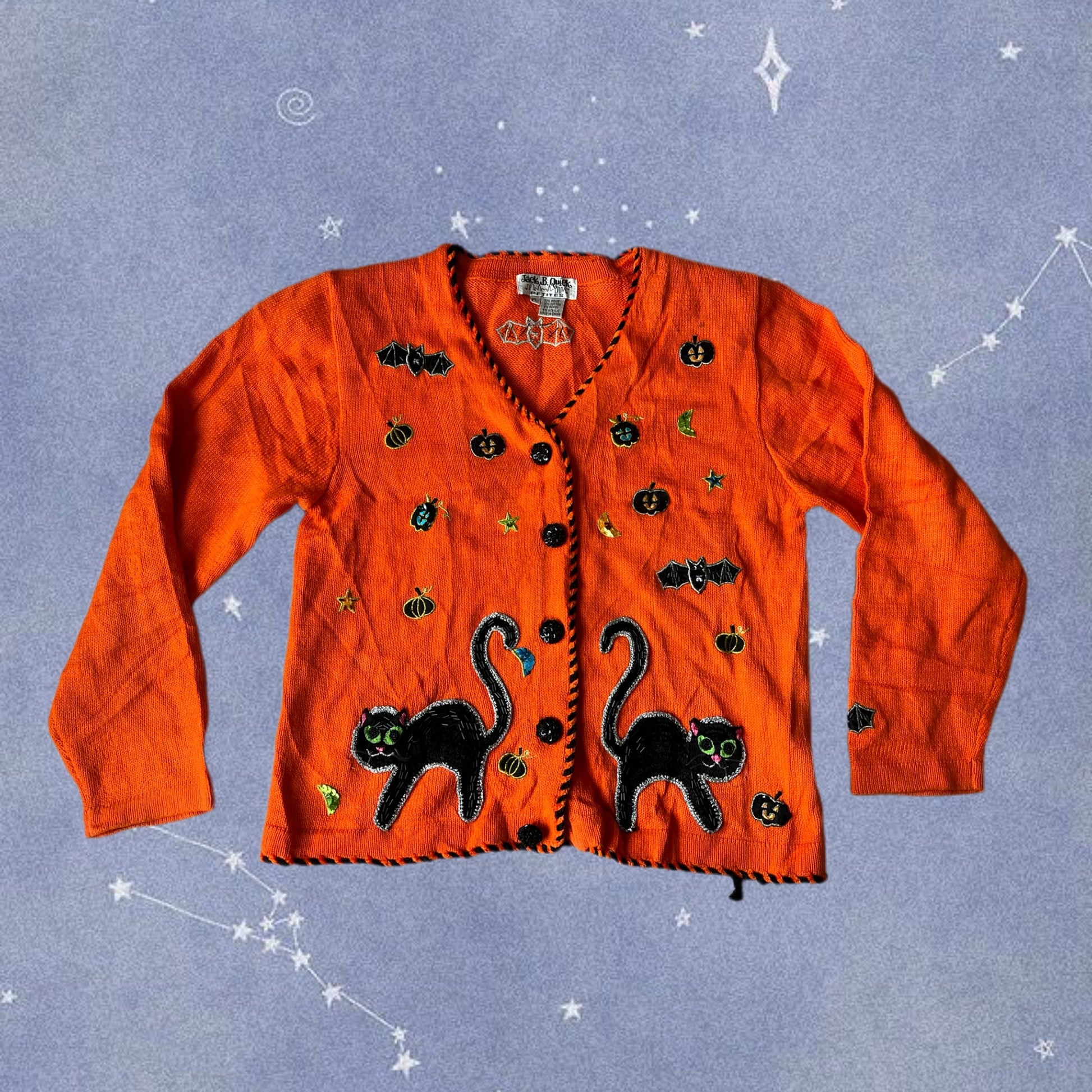 1990s Halloween button up front cardigan! Has an amazing design of 2 black cats, pumpkins and bats! Labelled M, fits true to size.
