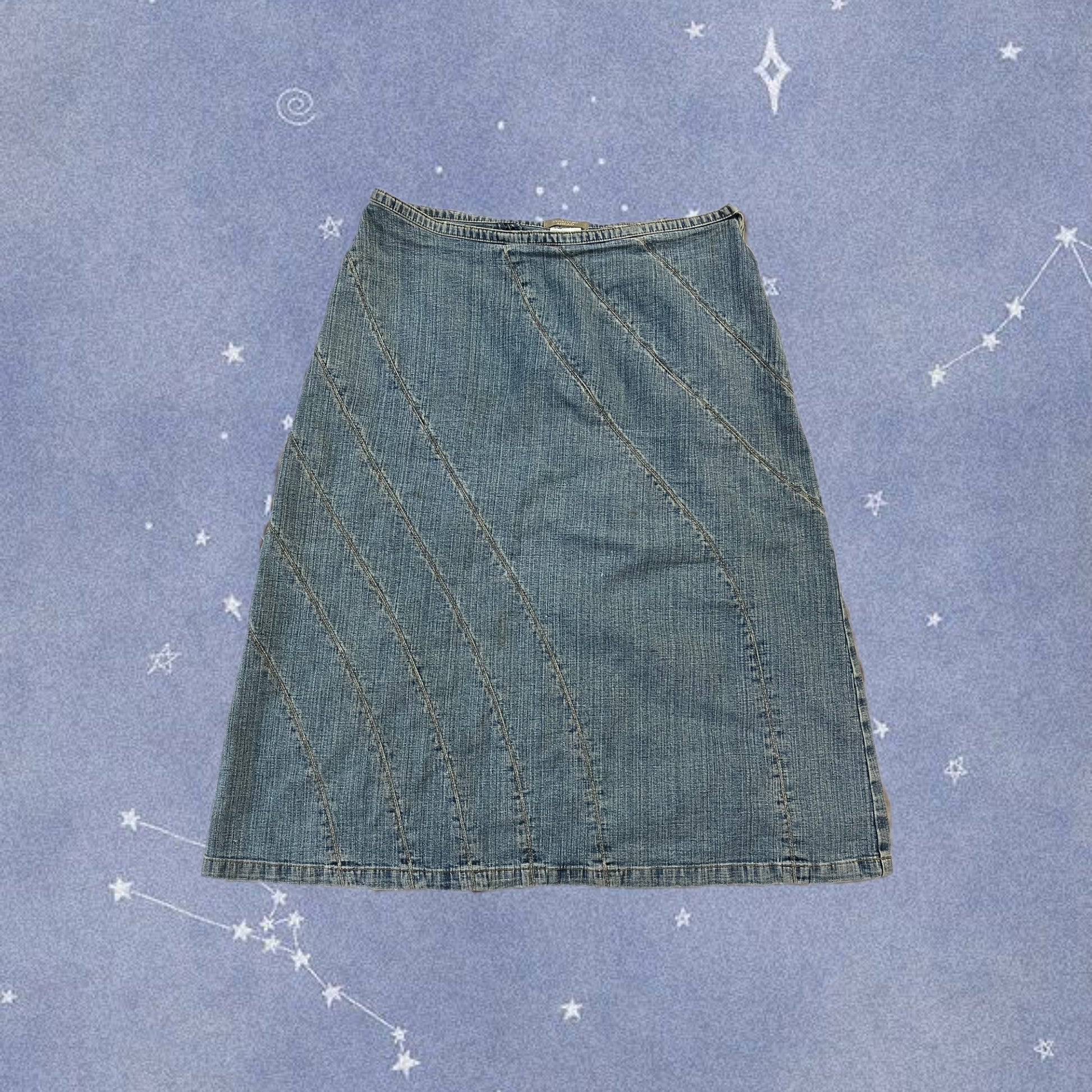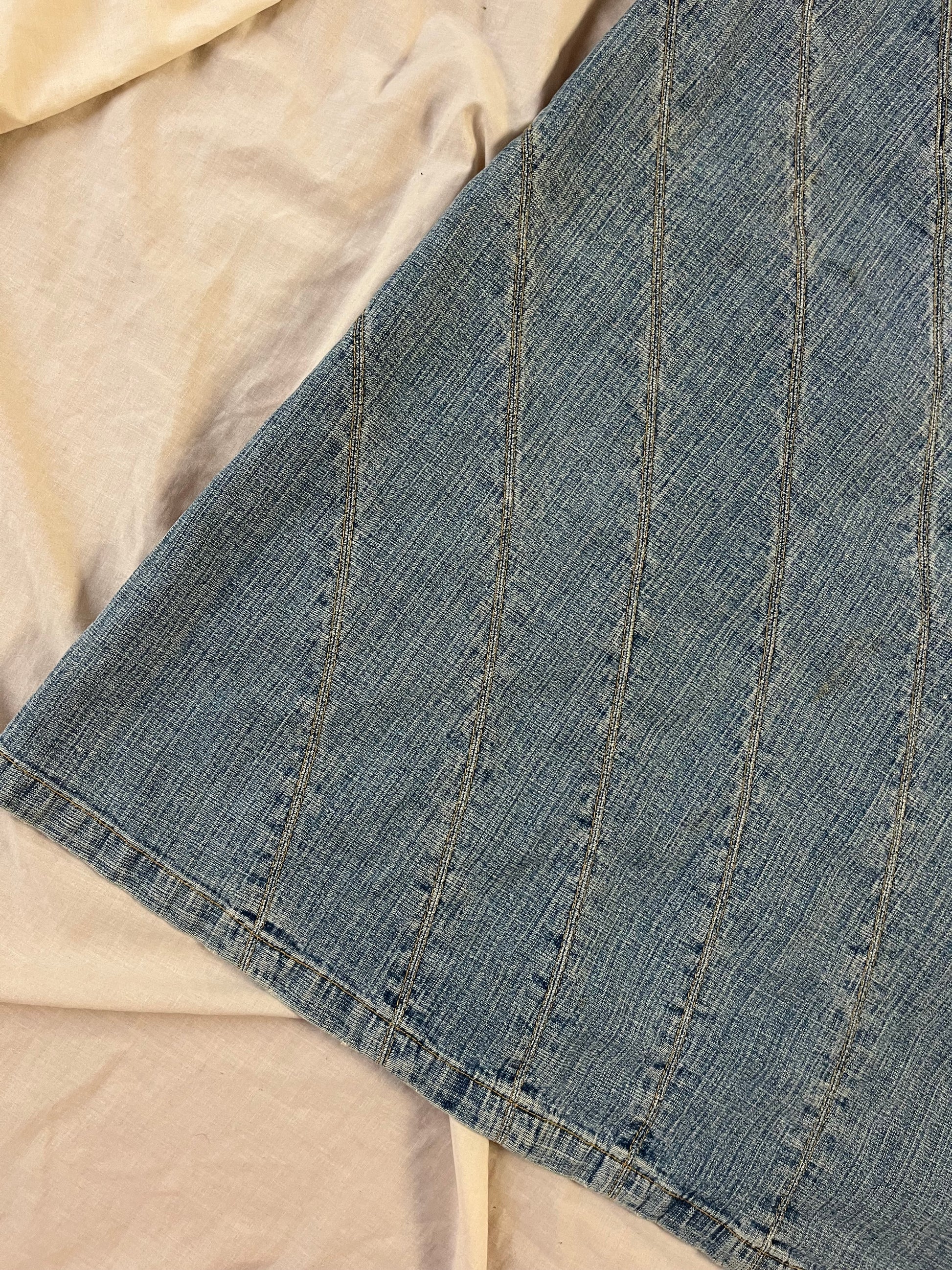 1990s tiered denim maxi skirt! Zips up on the side and has a maxi length fit.
