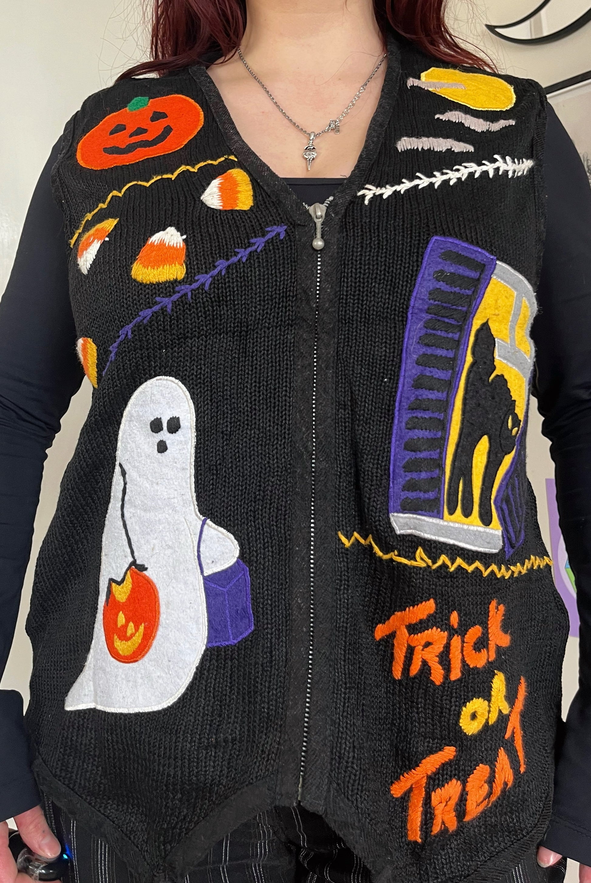 1990s Halloween zip up front sweater vest! Has a design of a cat in a window, a trick or treating ghost and more! Labelled L, fits like M/L.