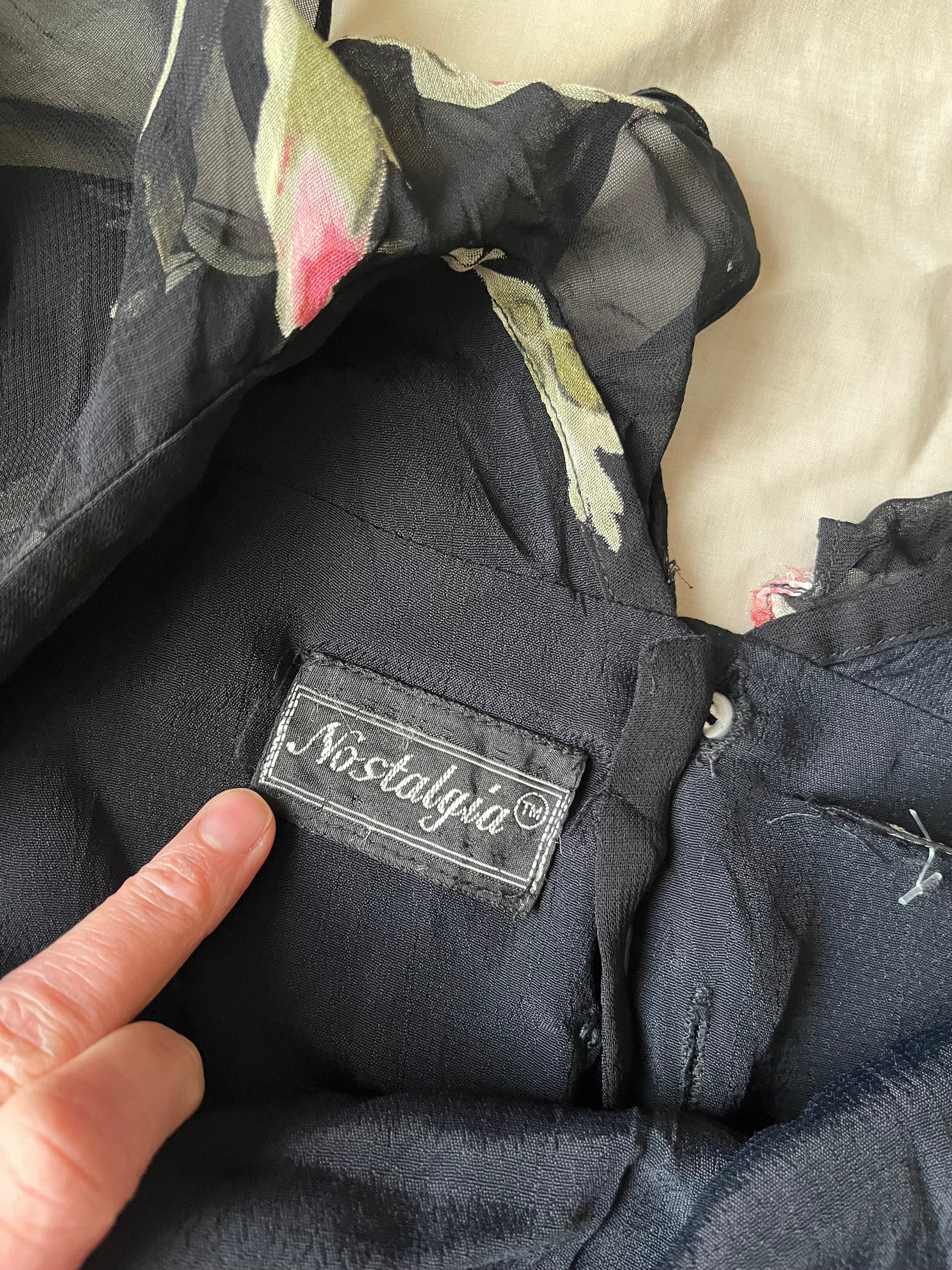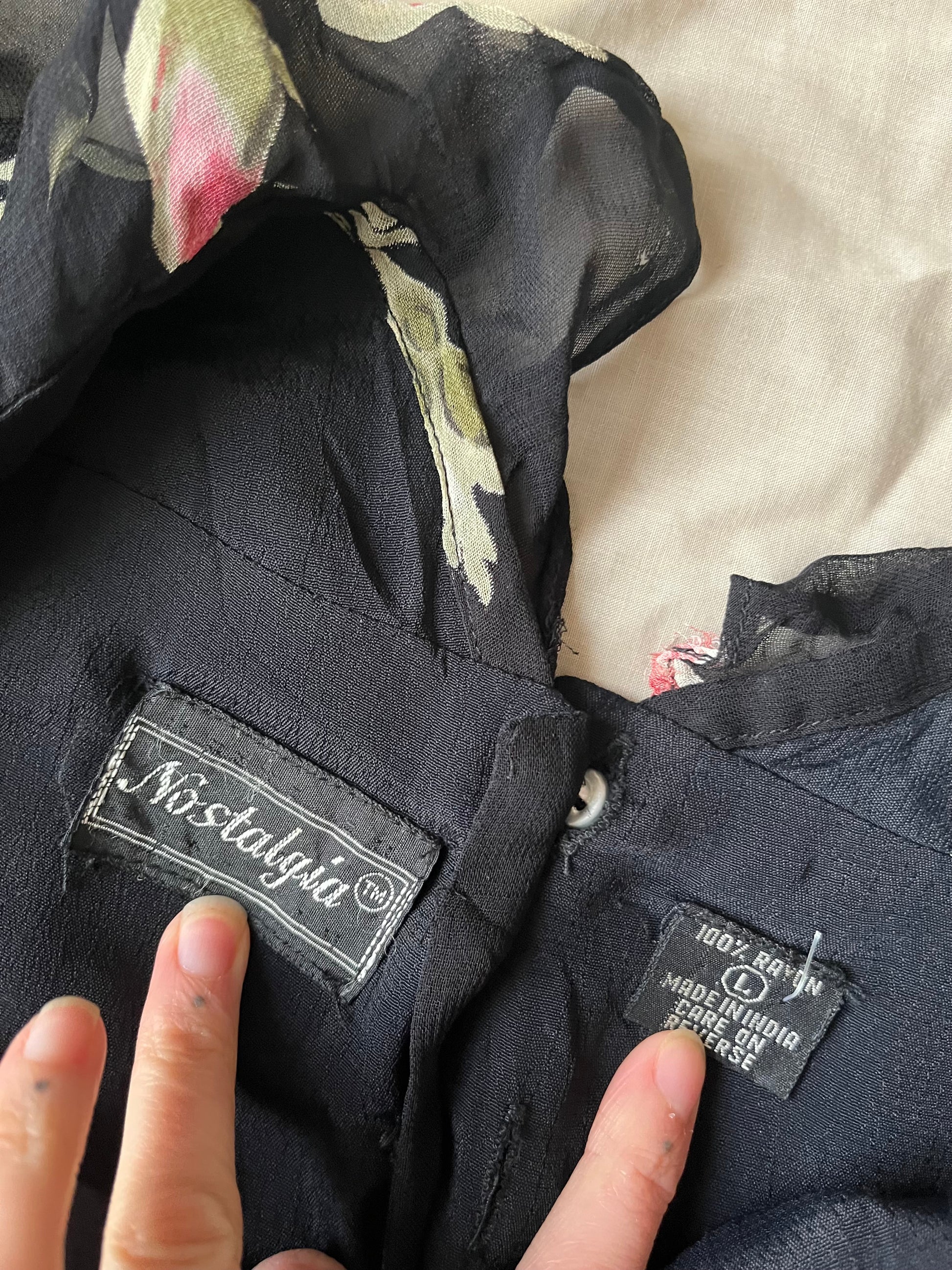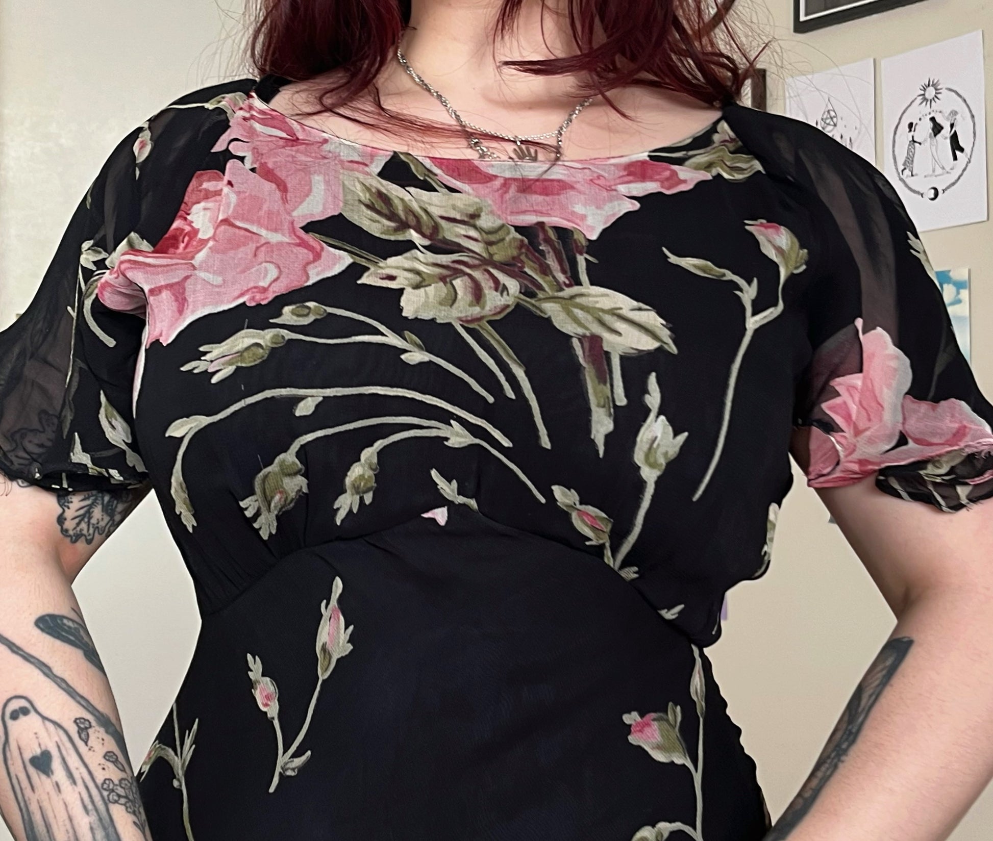 Gorgeous 1990s black floral mesh maxi dress! This has buttons on the back for easy wear, mesh sleeves and a flattering fit.