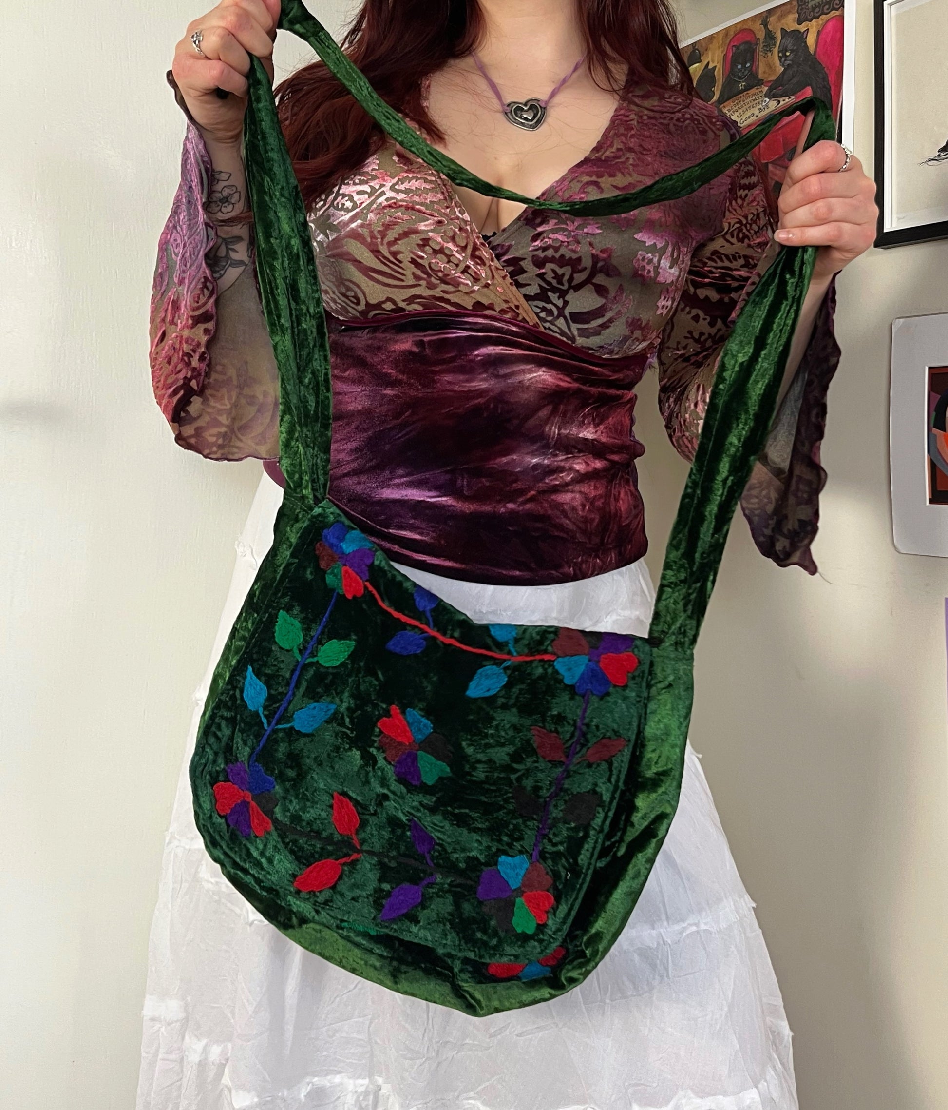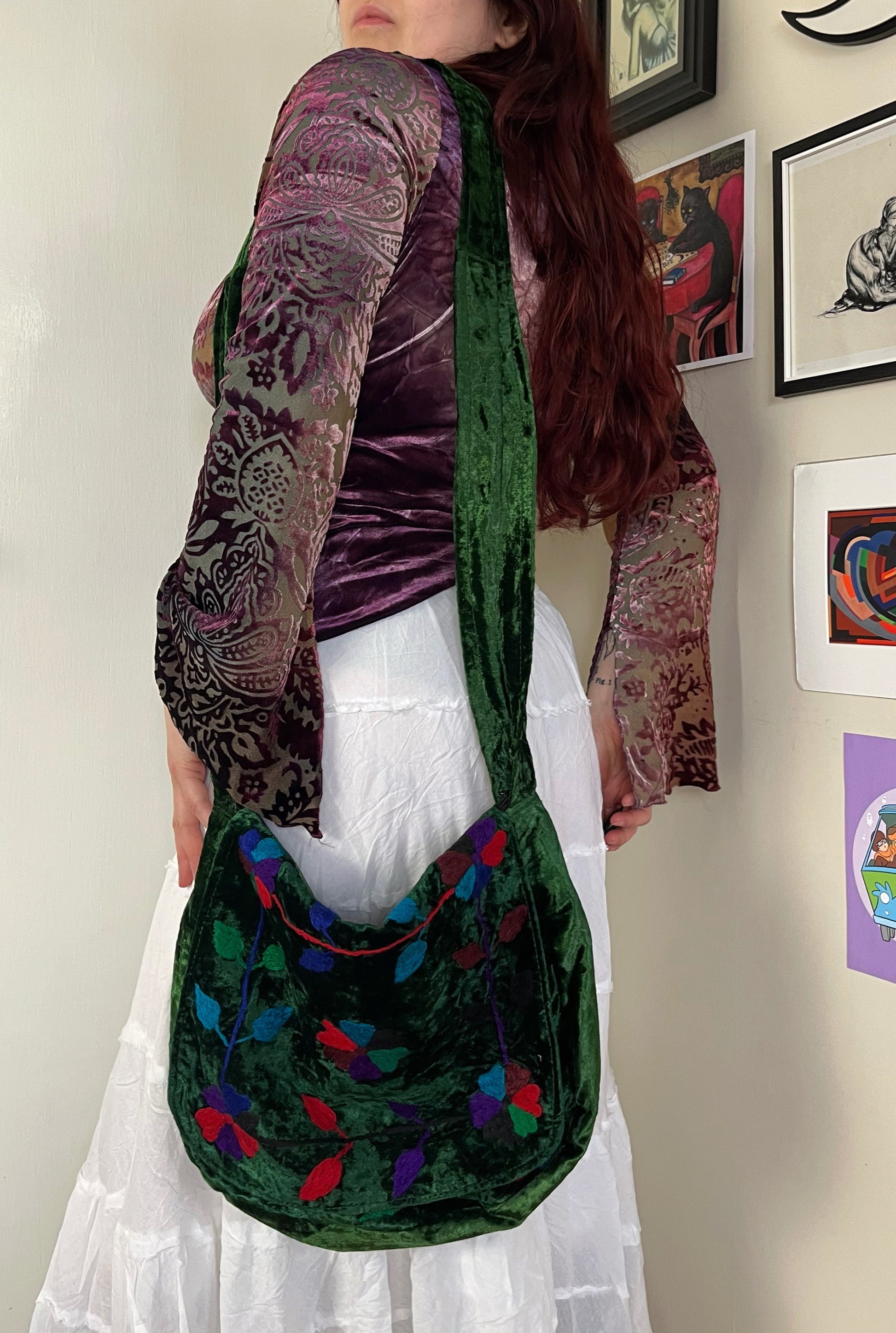 2000s green velvet bag! Boho style with a long strap and embroidery on the front. In perfect vintage condition.