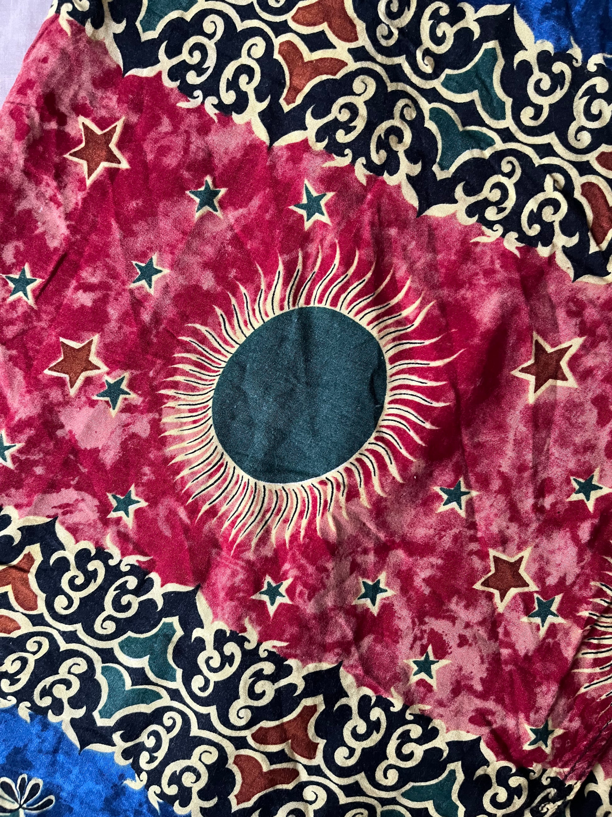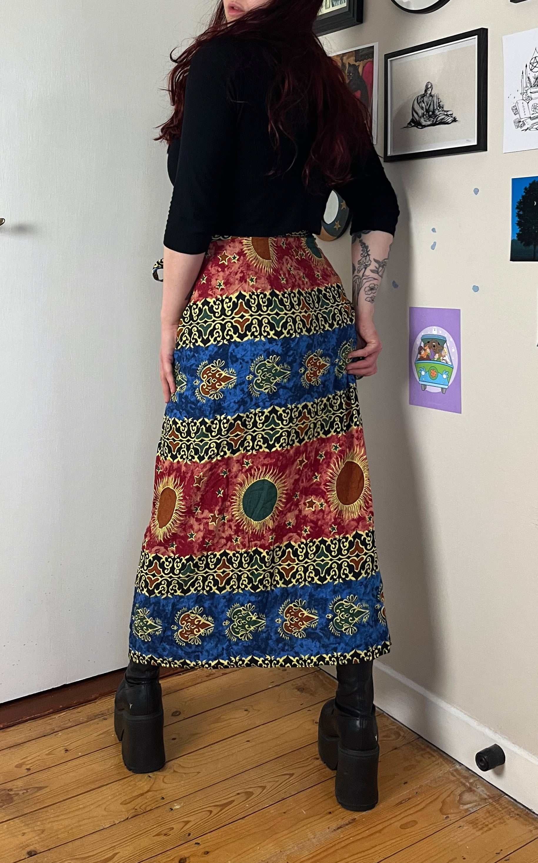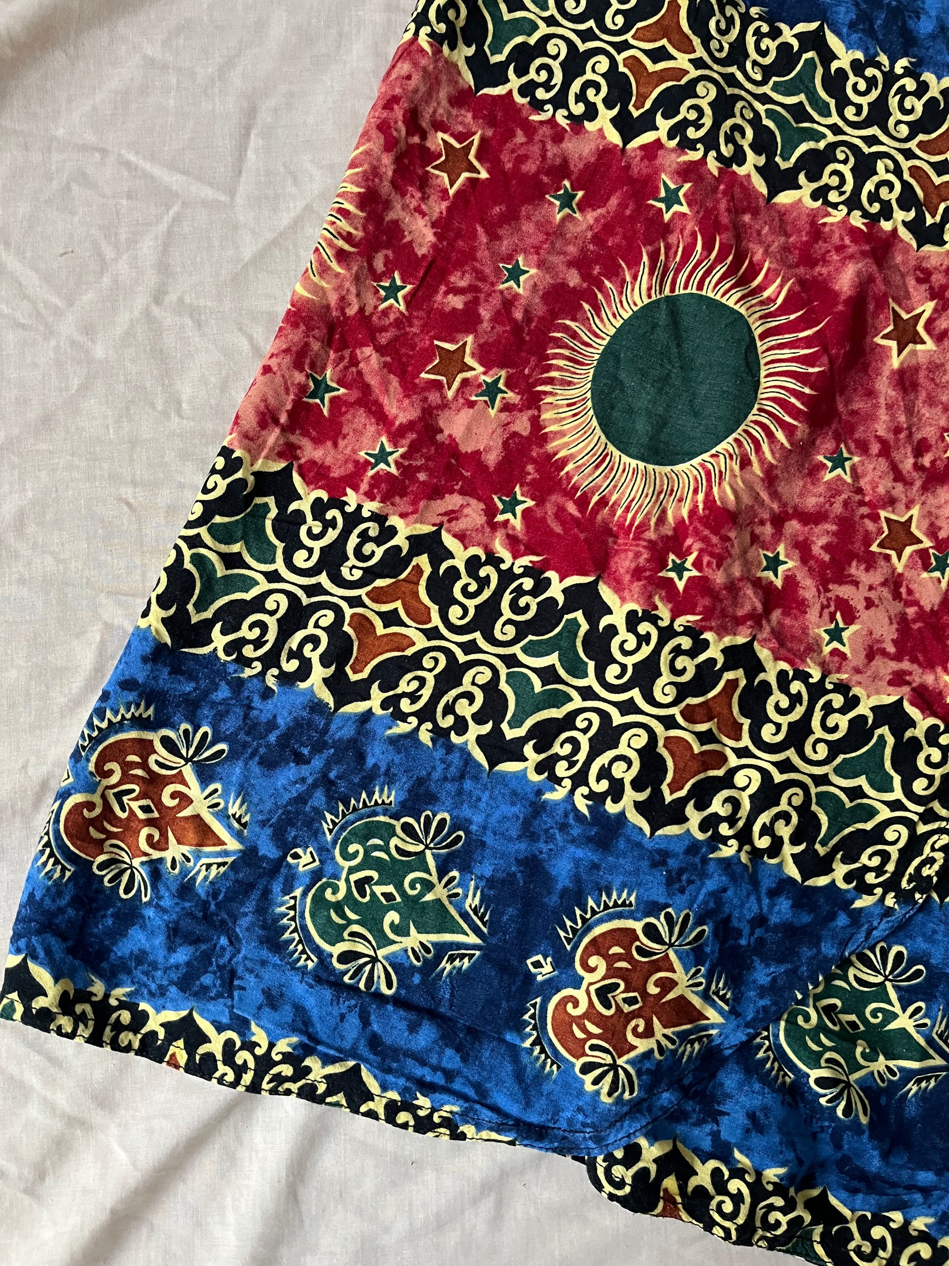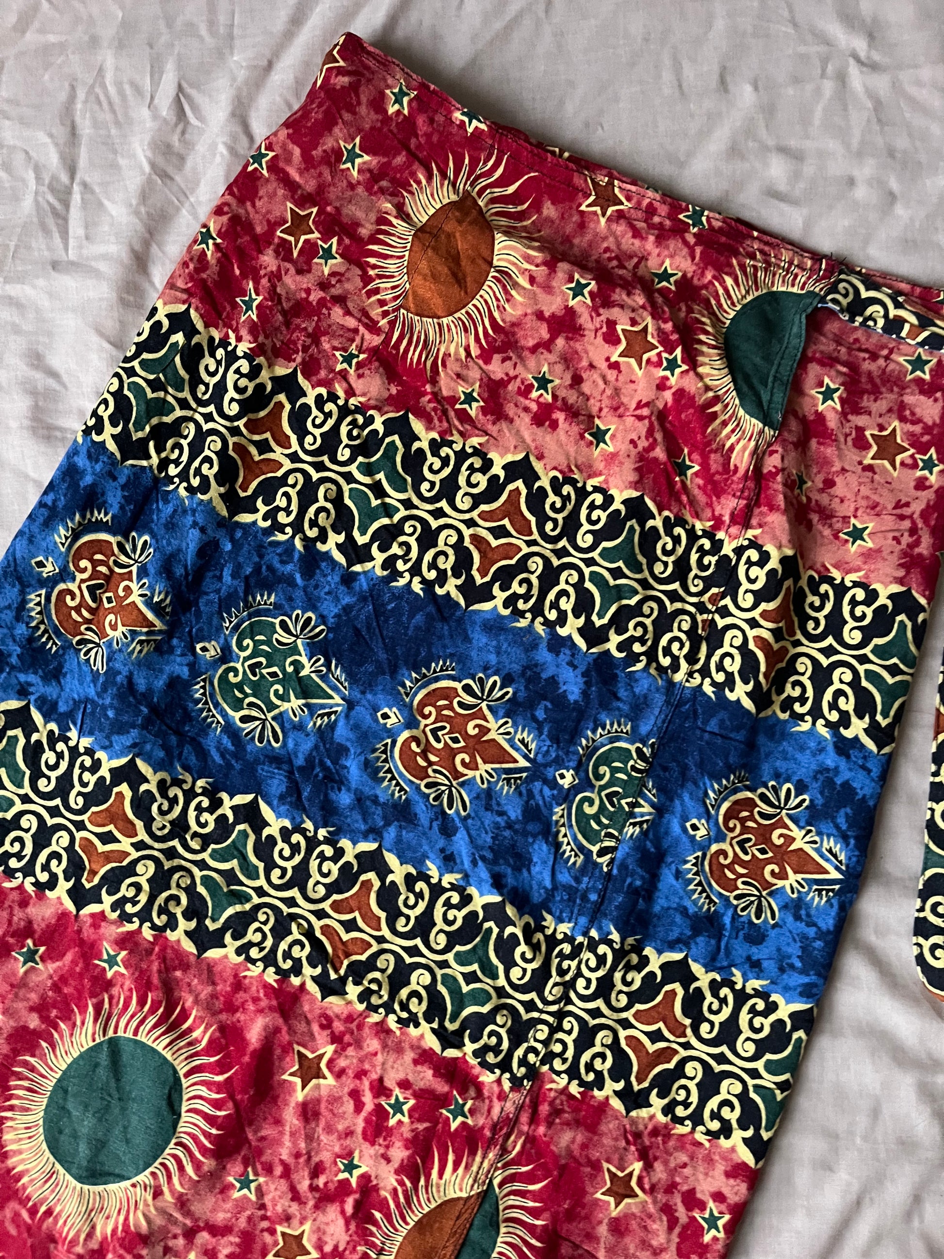 1990s boho whimsigoth wrap skirt! Tie waist with a sun design on it. Adjustable waist.