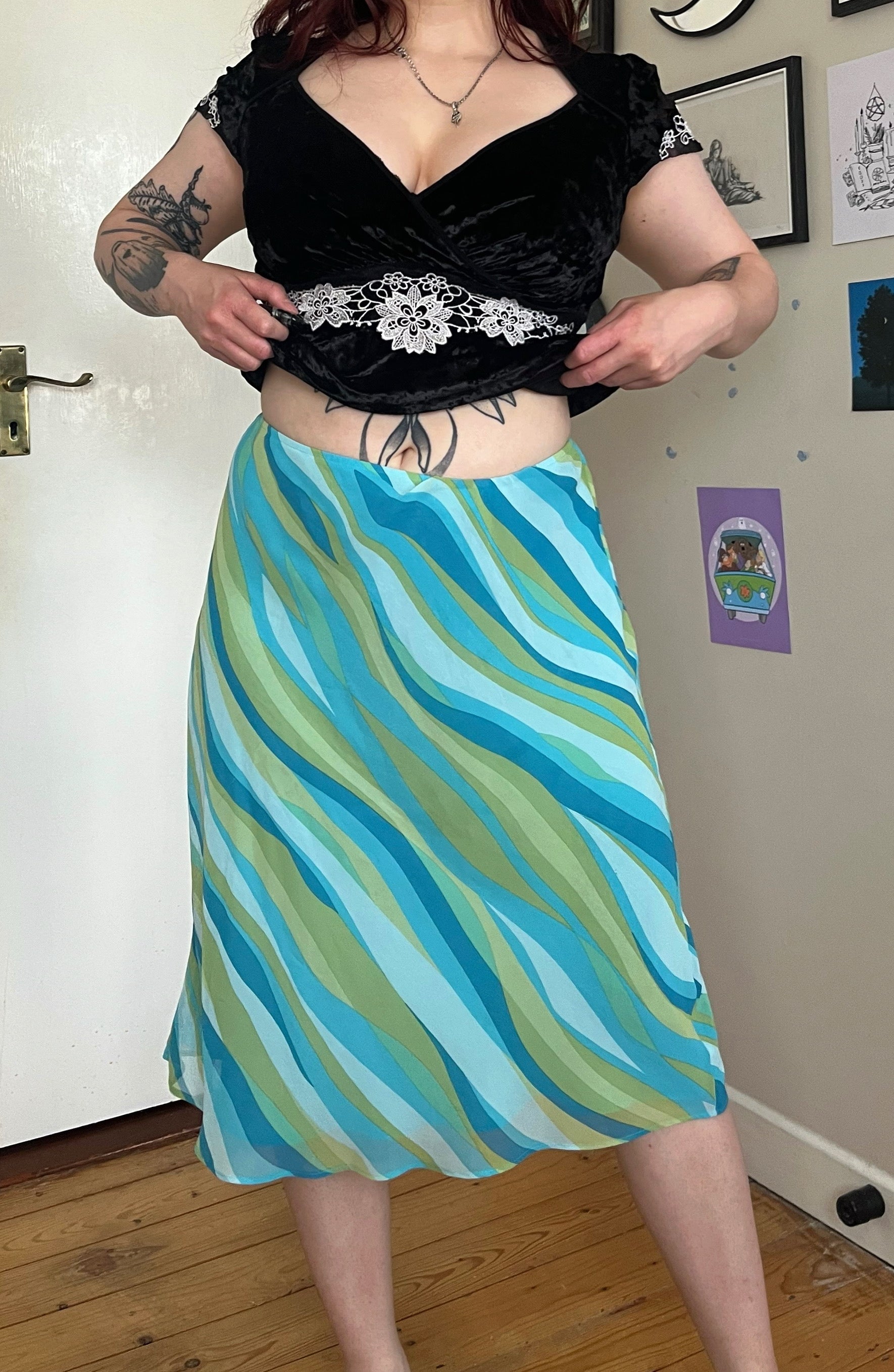 Amazing 2000s stripy blue and green mesh midi skirt! Stretchy waist. In perfect vintage condition and would best fit UK 12-16 as the waist can stretch.
