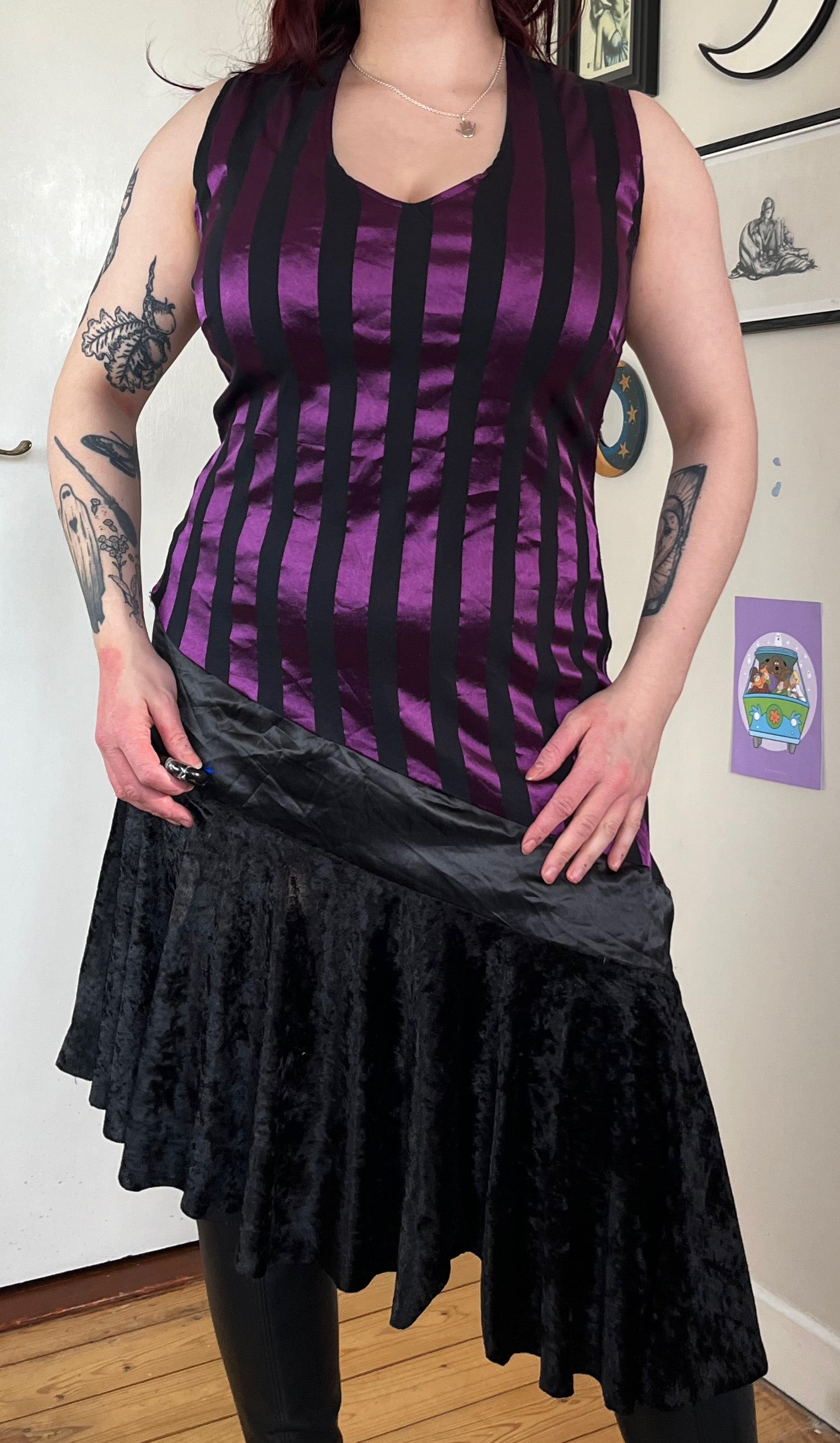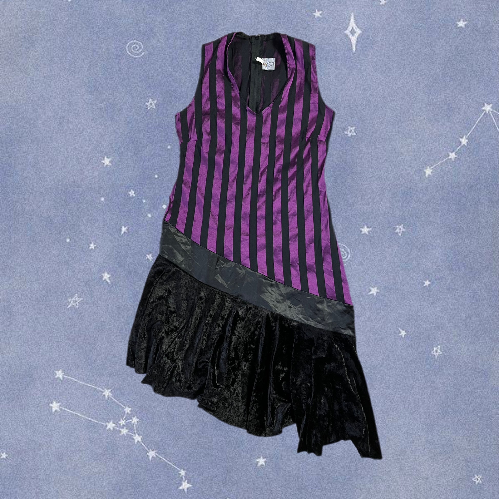 Funky 2000s purple and black dress! this has a striped design with a velvet hem.