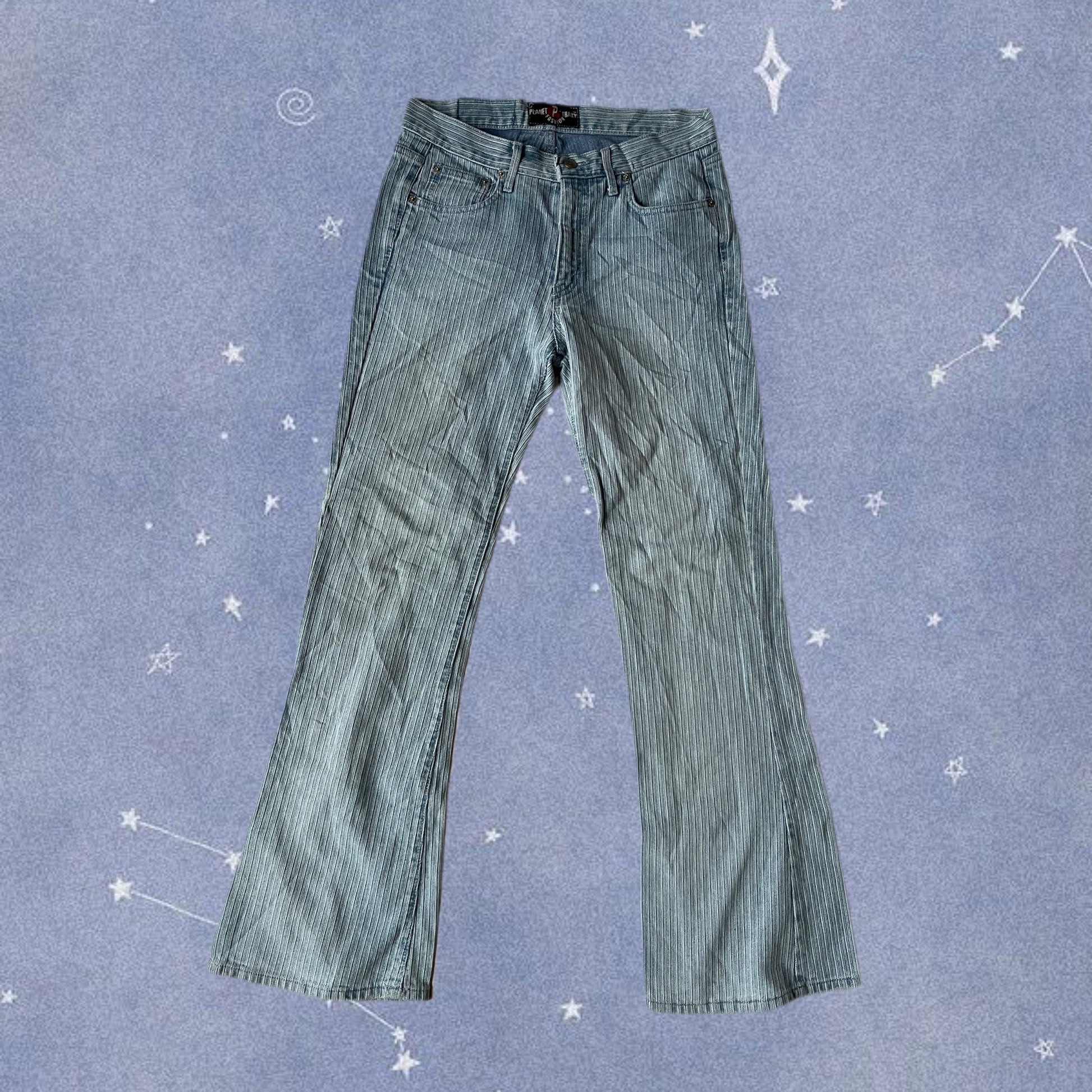 Amazing 1997 light wash striped jeans! These have a slight flare to them and a mid rise waist. Super flattering!