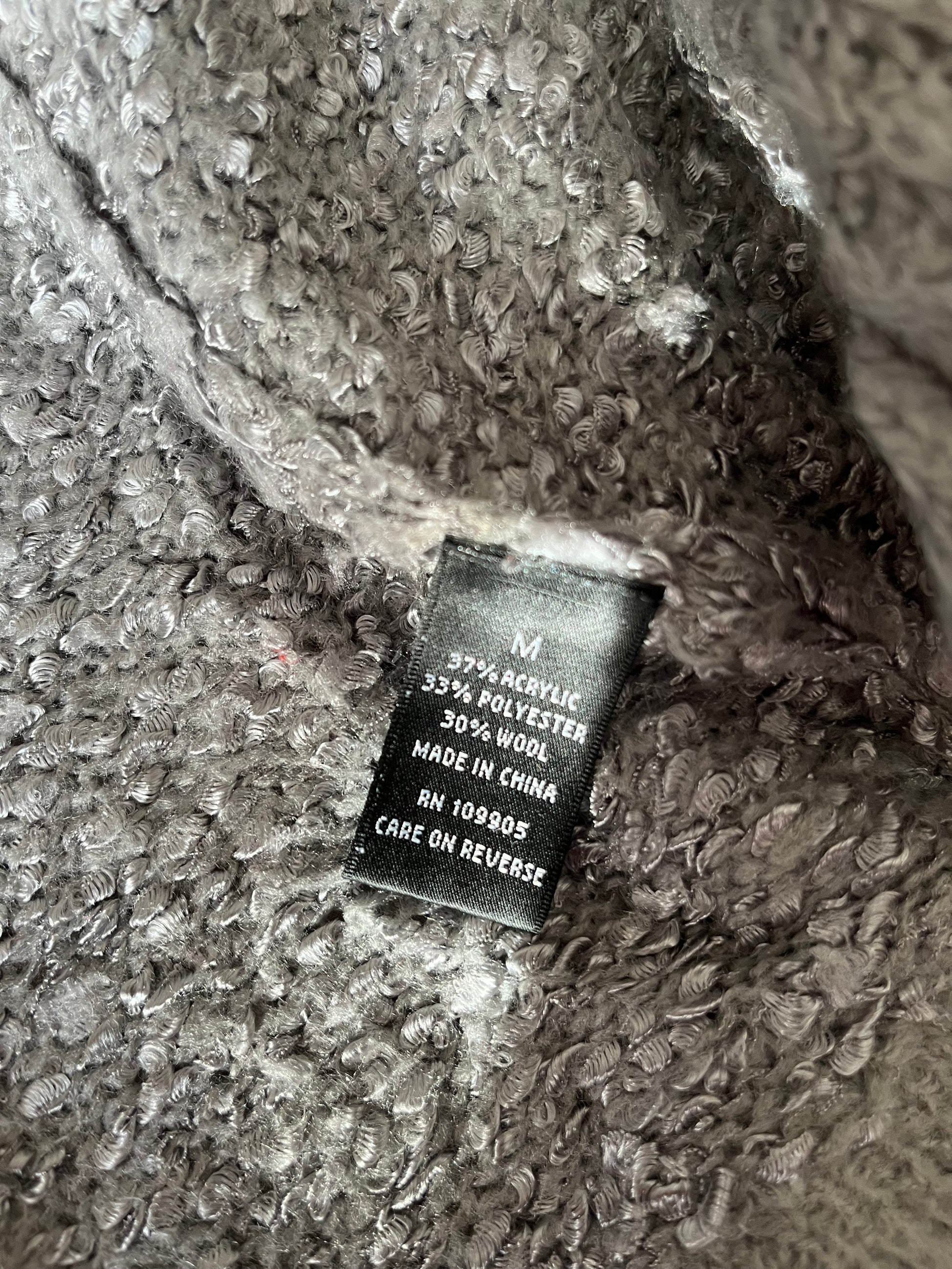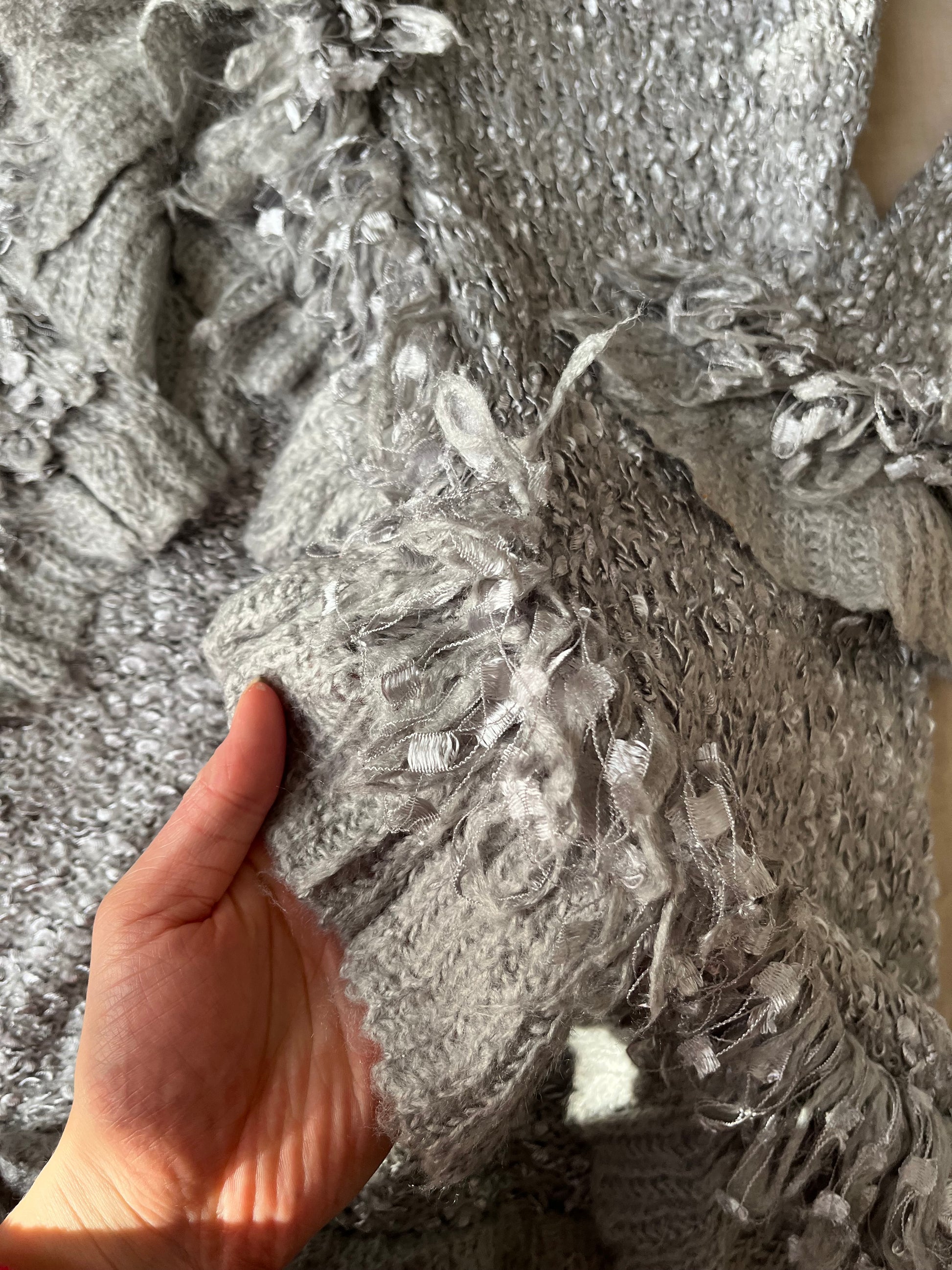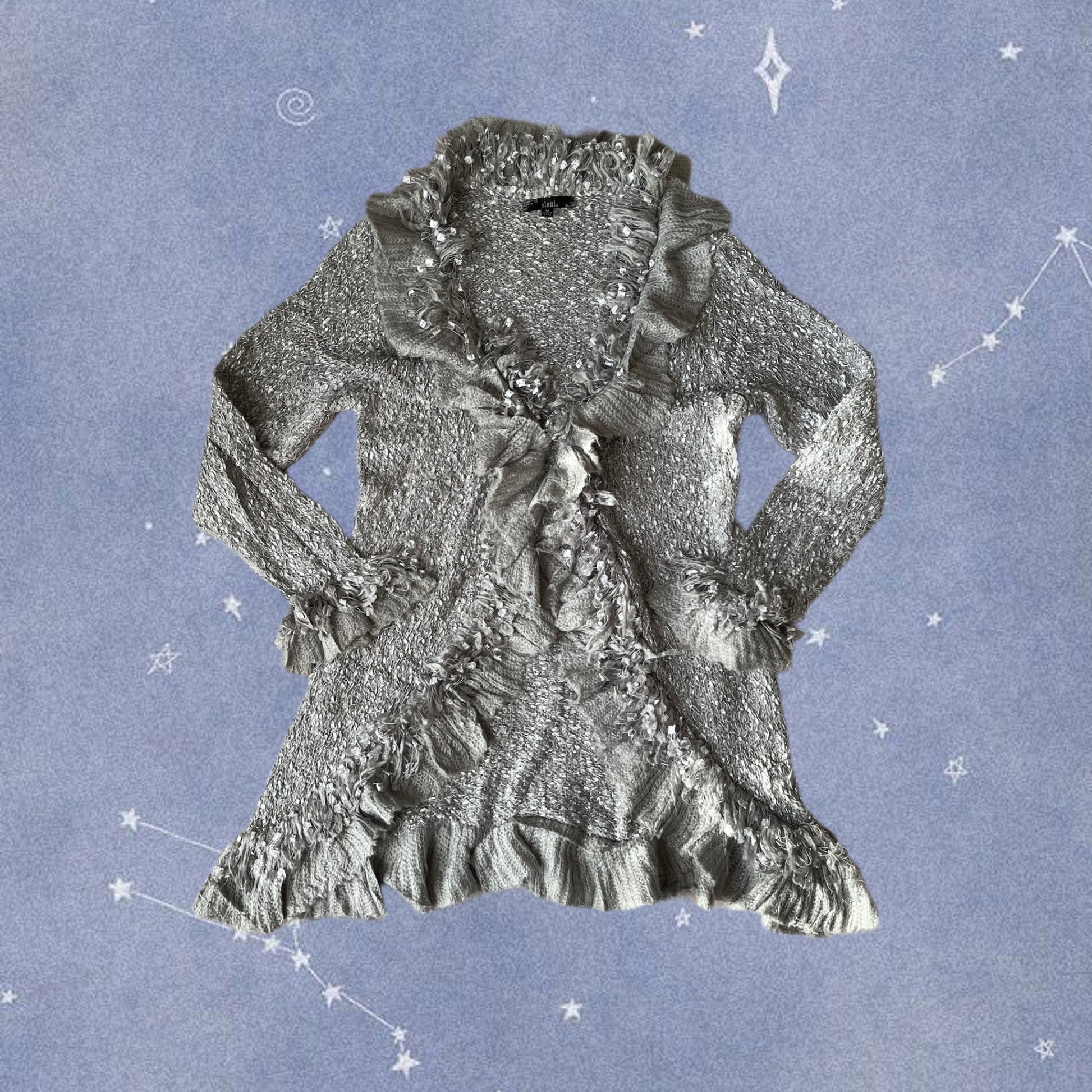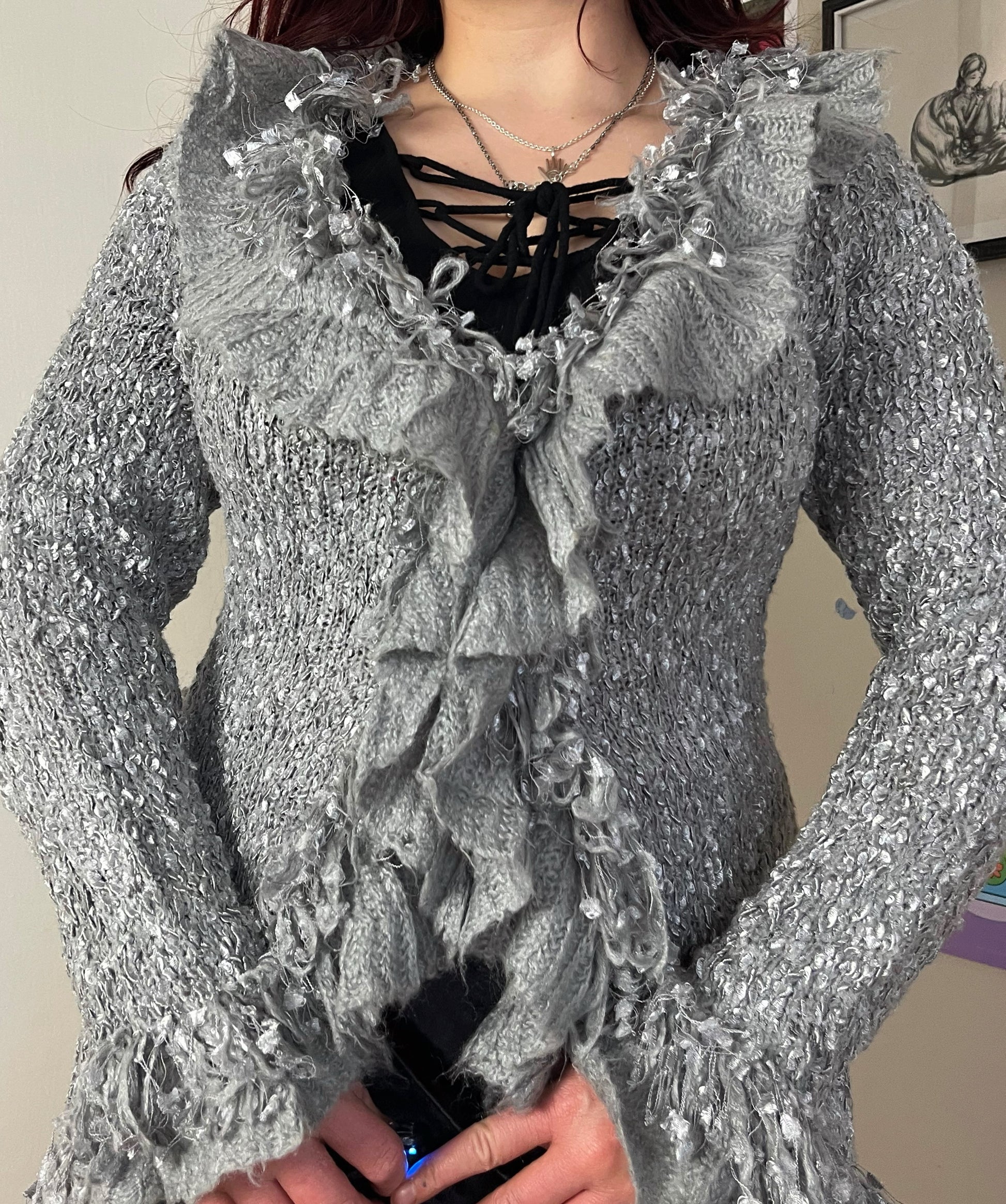 Amazing 1990s silver whimsigoth afghan style cardigan! Tie front with a ruffle trim