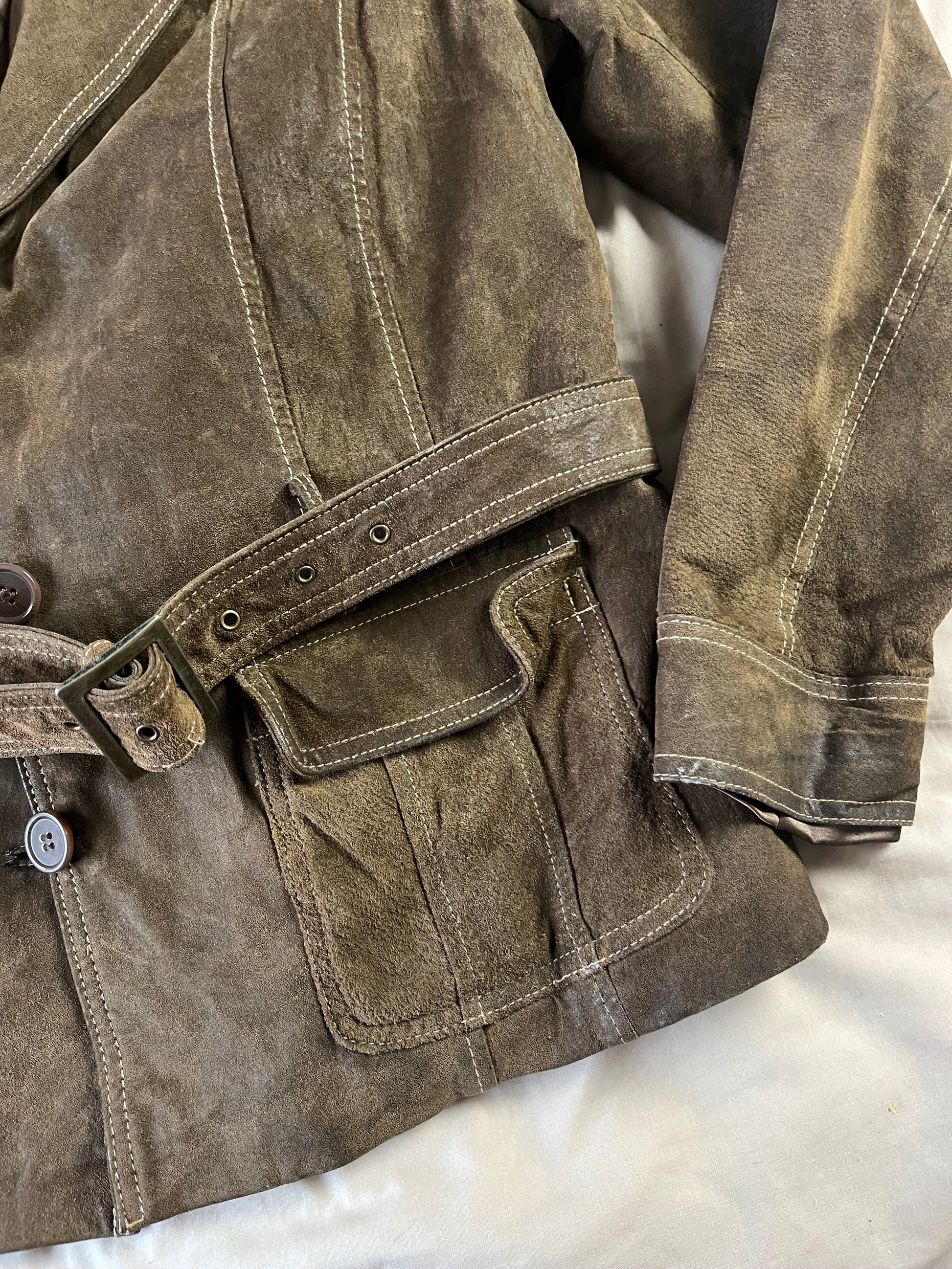 1990s brown suede button up front jacket! This has a belted waist for a flattering fit. Made from genuine suede.