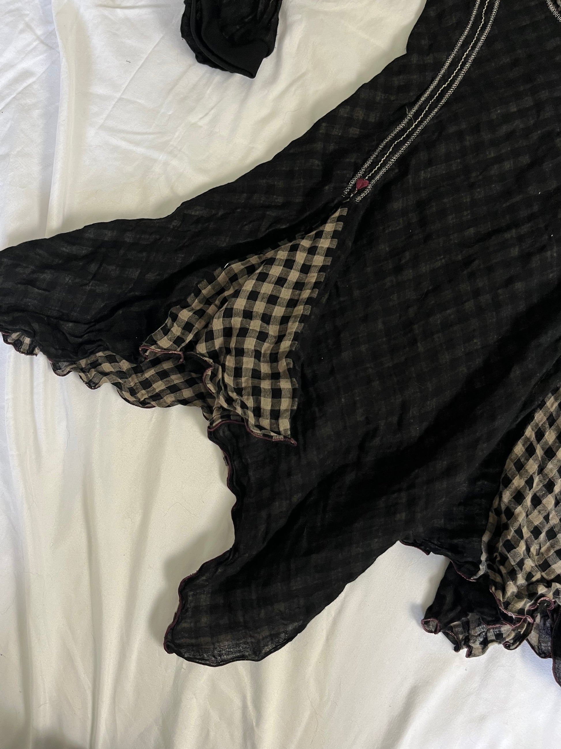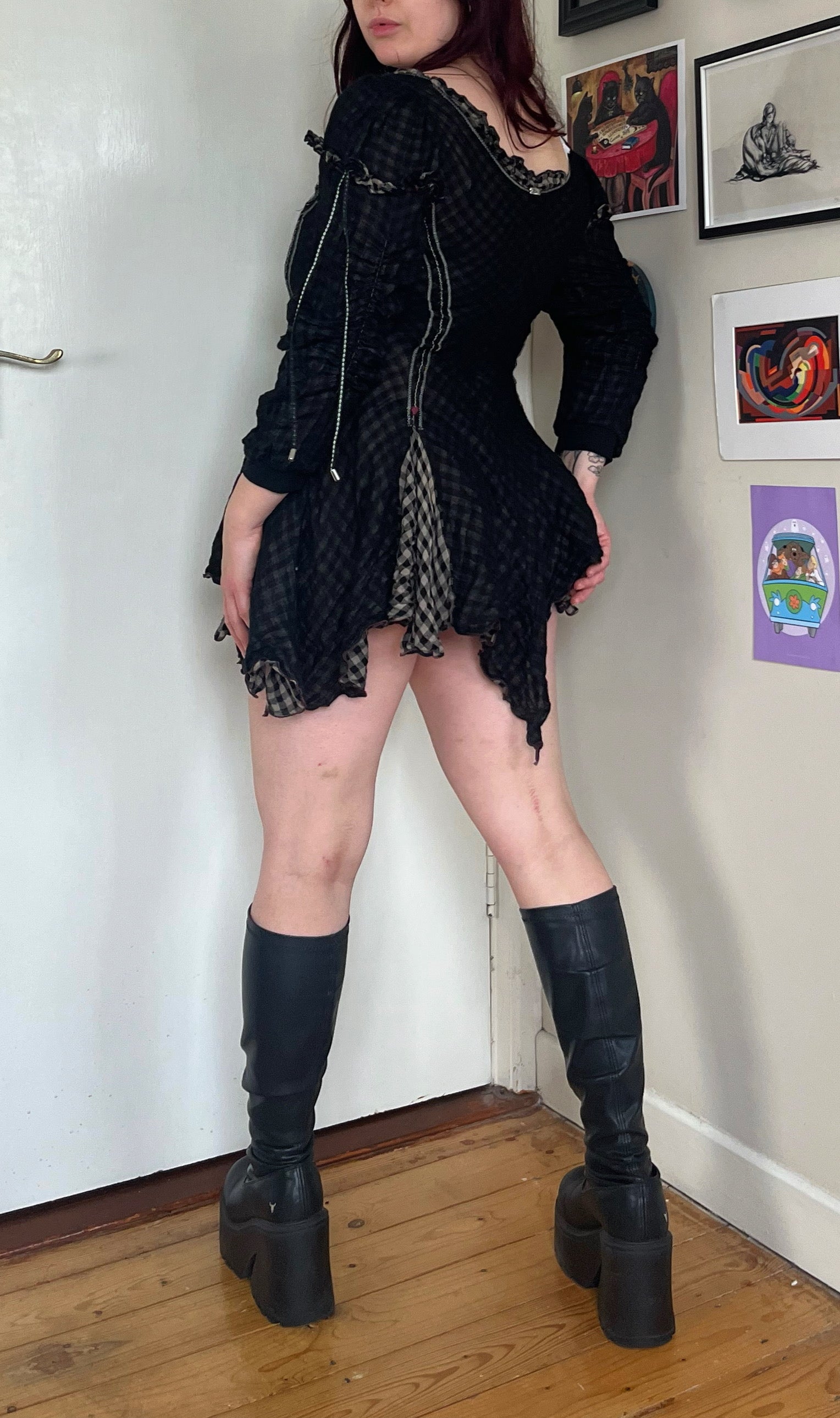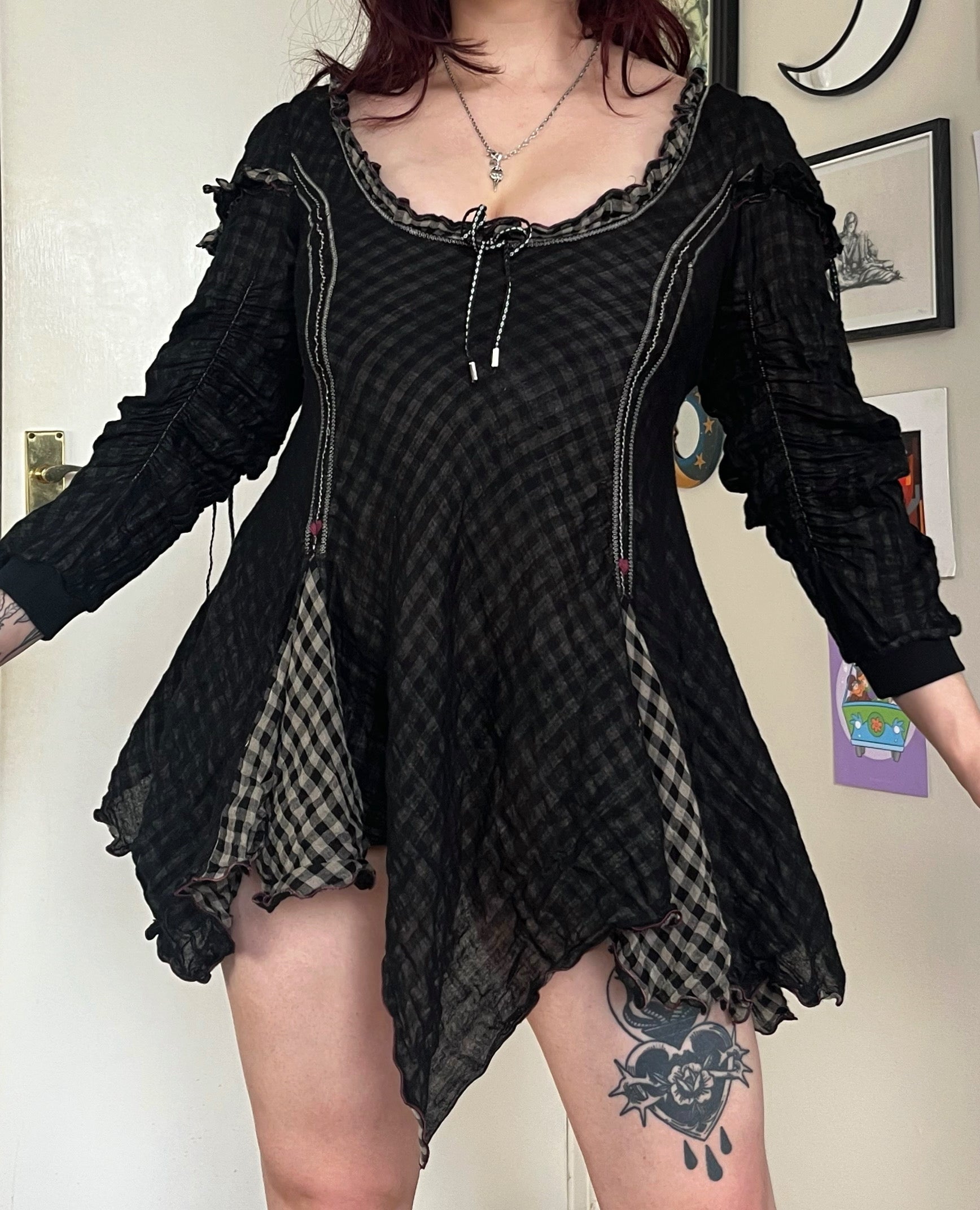 2000s black and white tartan mini dress! This has a stretchy fit with an asymmetrical hem. Very short so would work best as a layering piece.