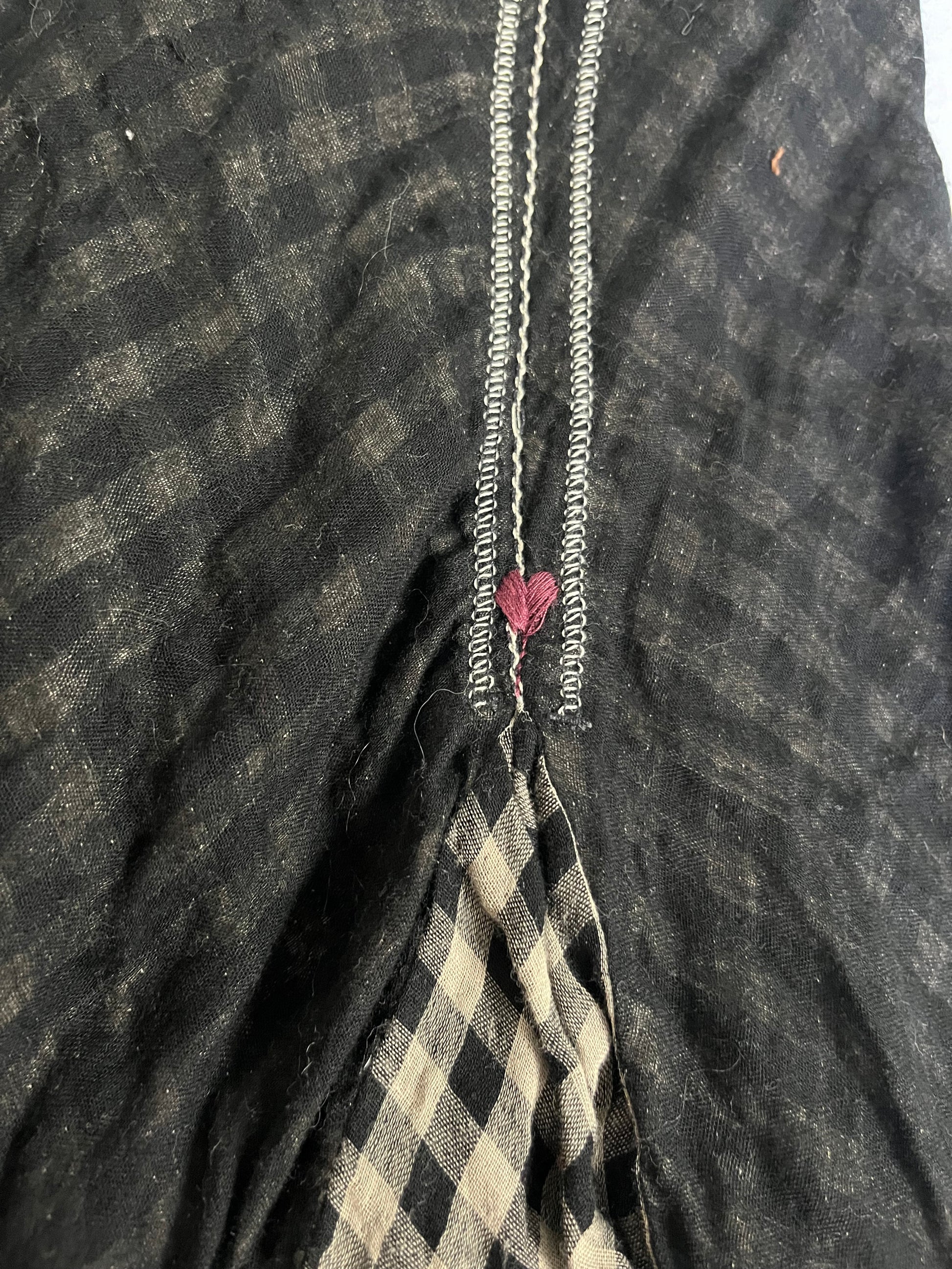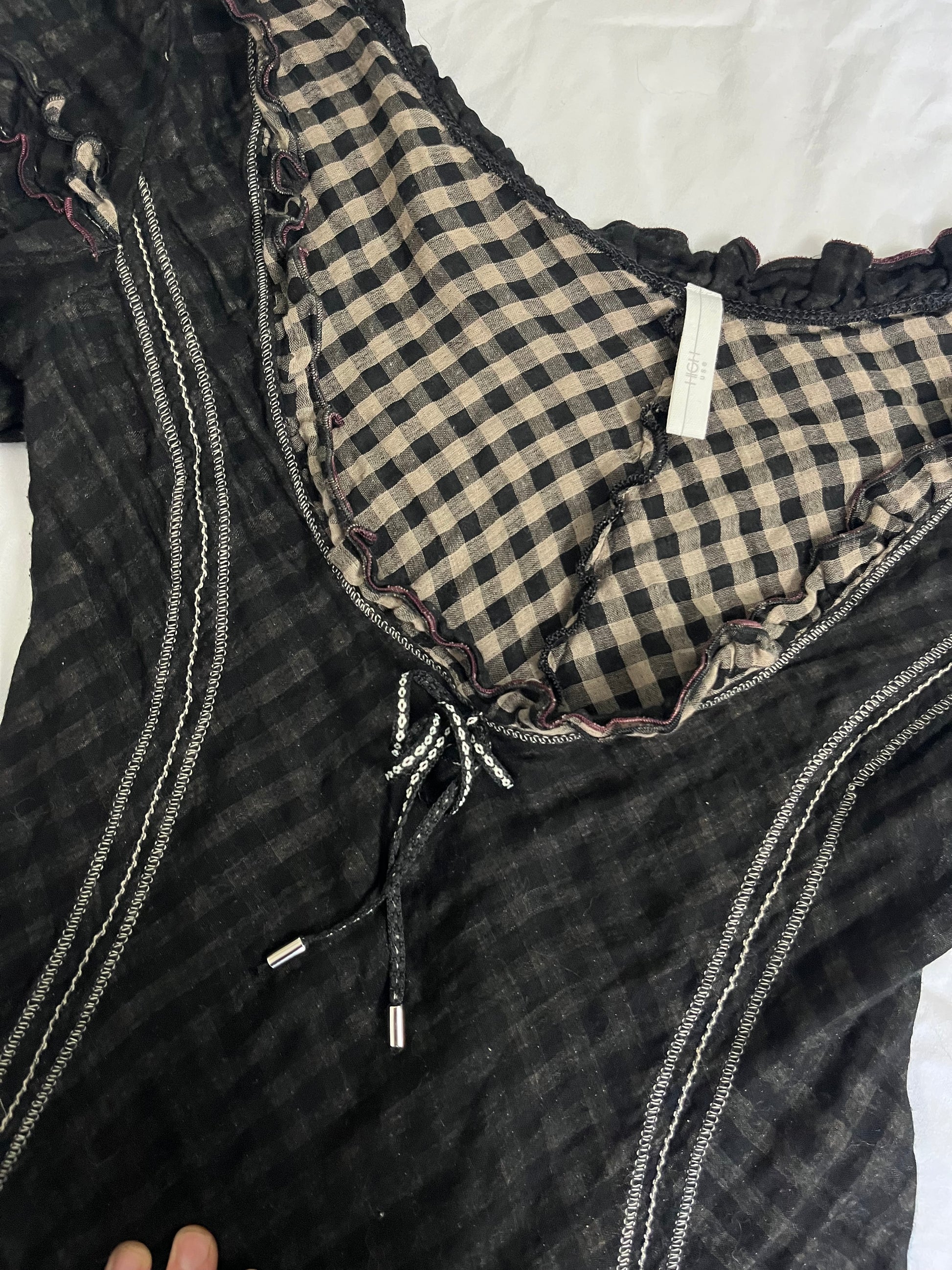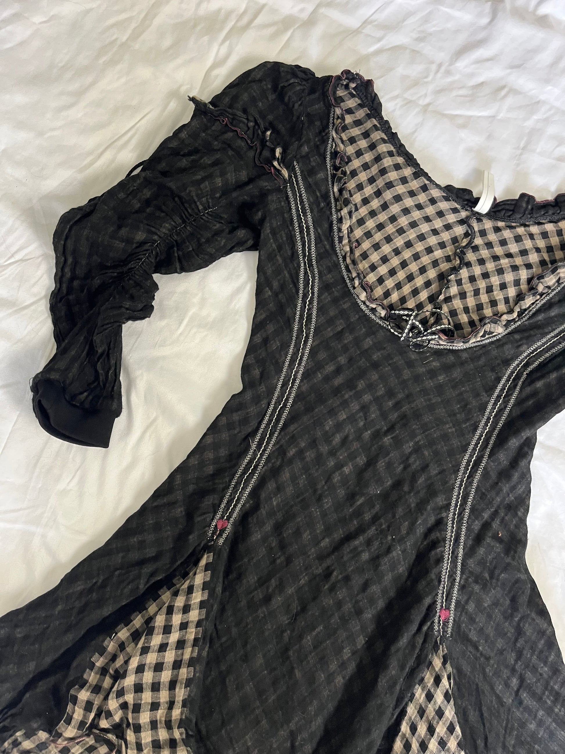 2000s black and white tartan mini dress! This has a stretchy fit with an asymmetrical hem. Very short so would work best as a layering piece.
