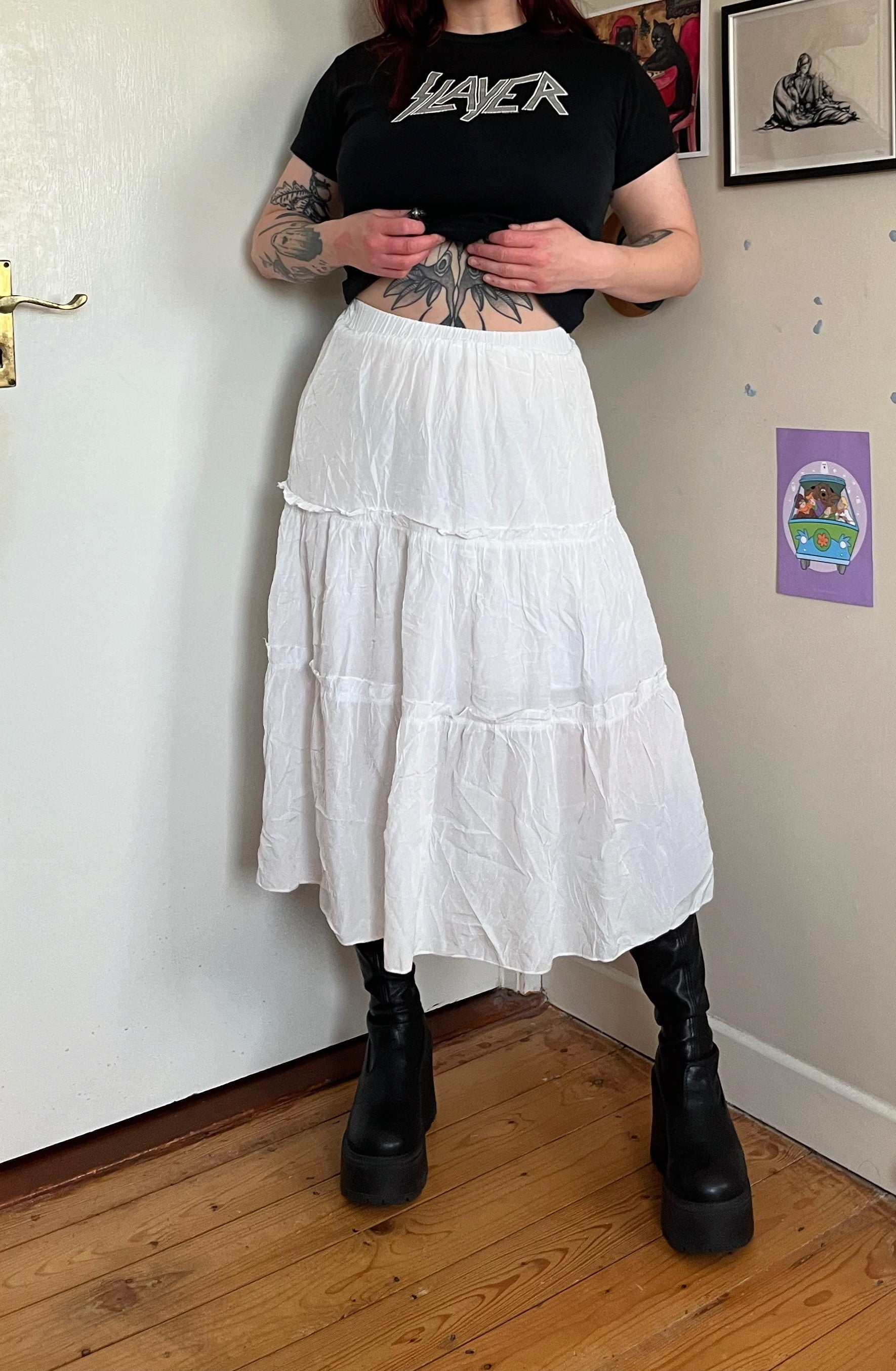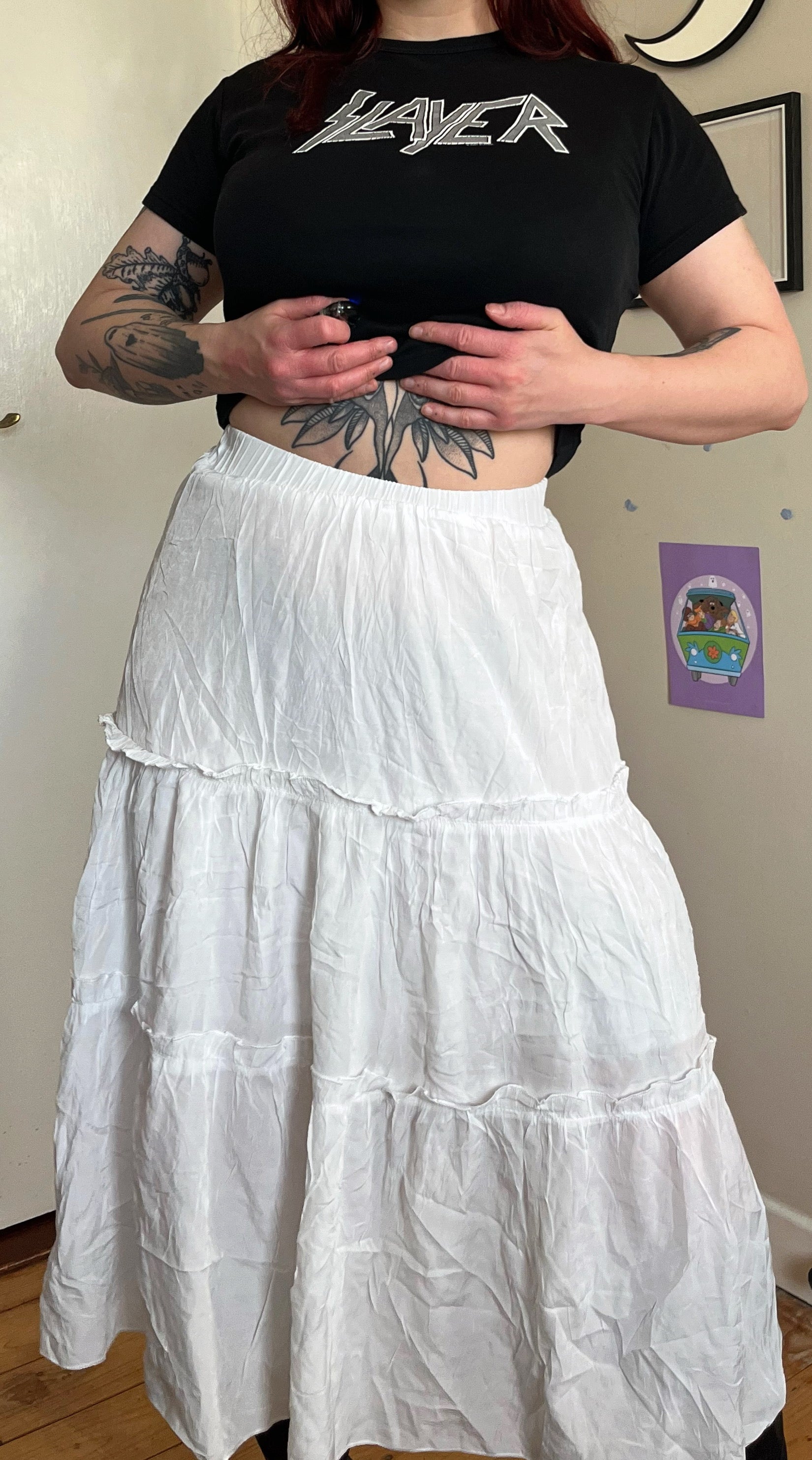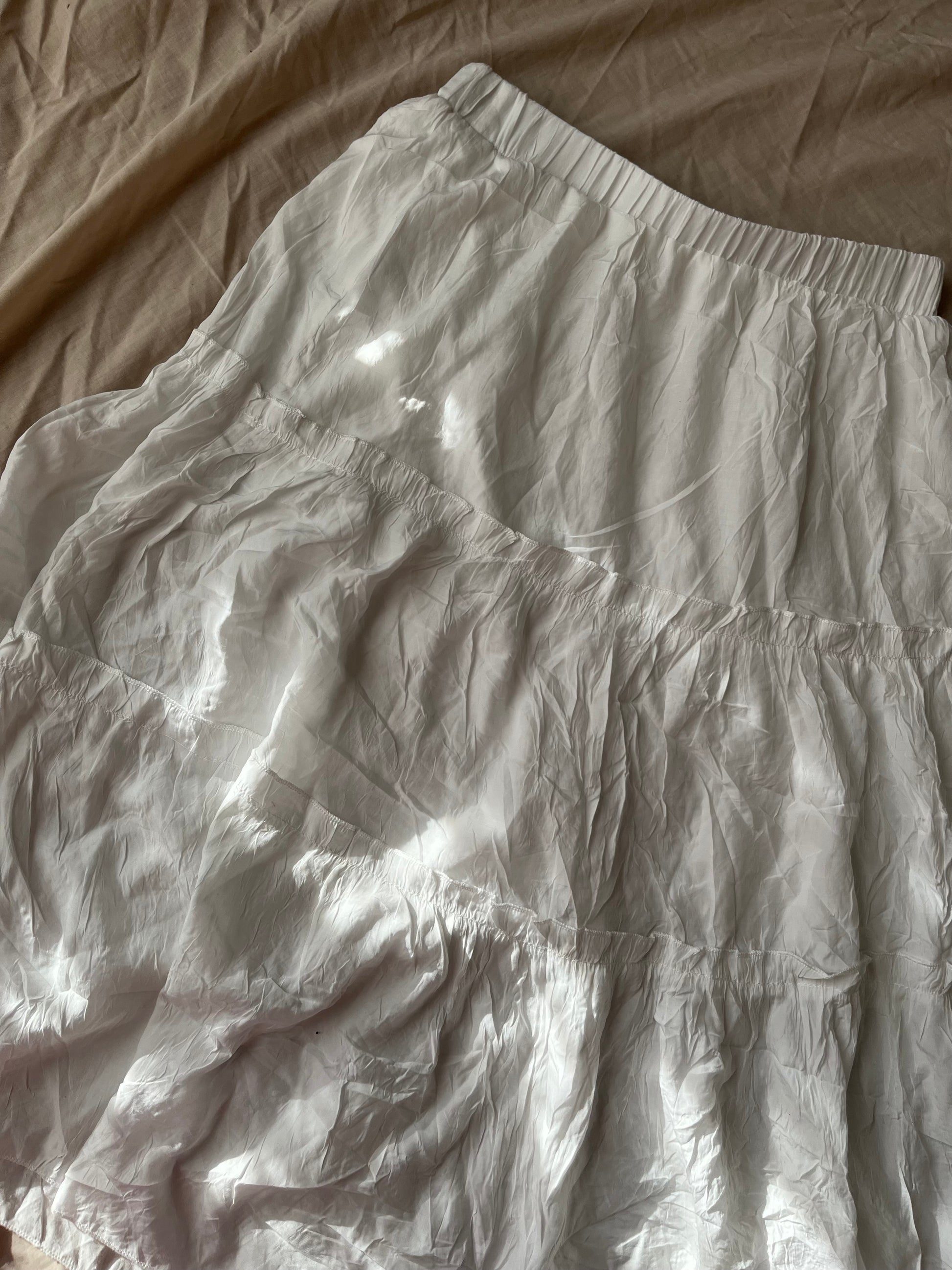 White tiered midi skirt with a stretchy waist! Unsure of age of this as theres no tags, but its a nice soft material. Reflected in price.