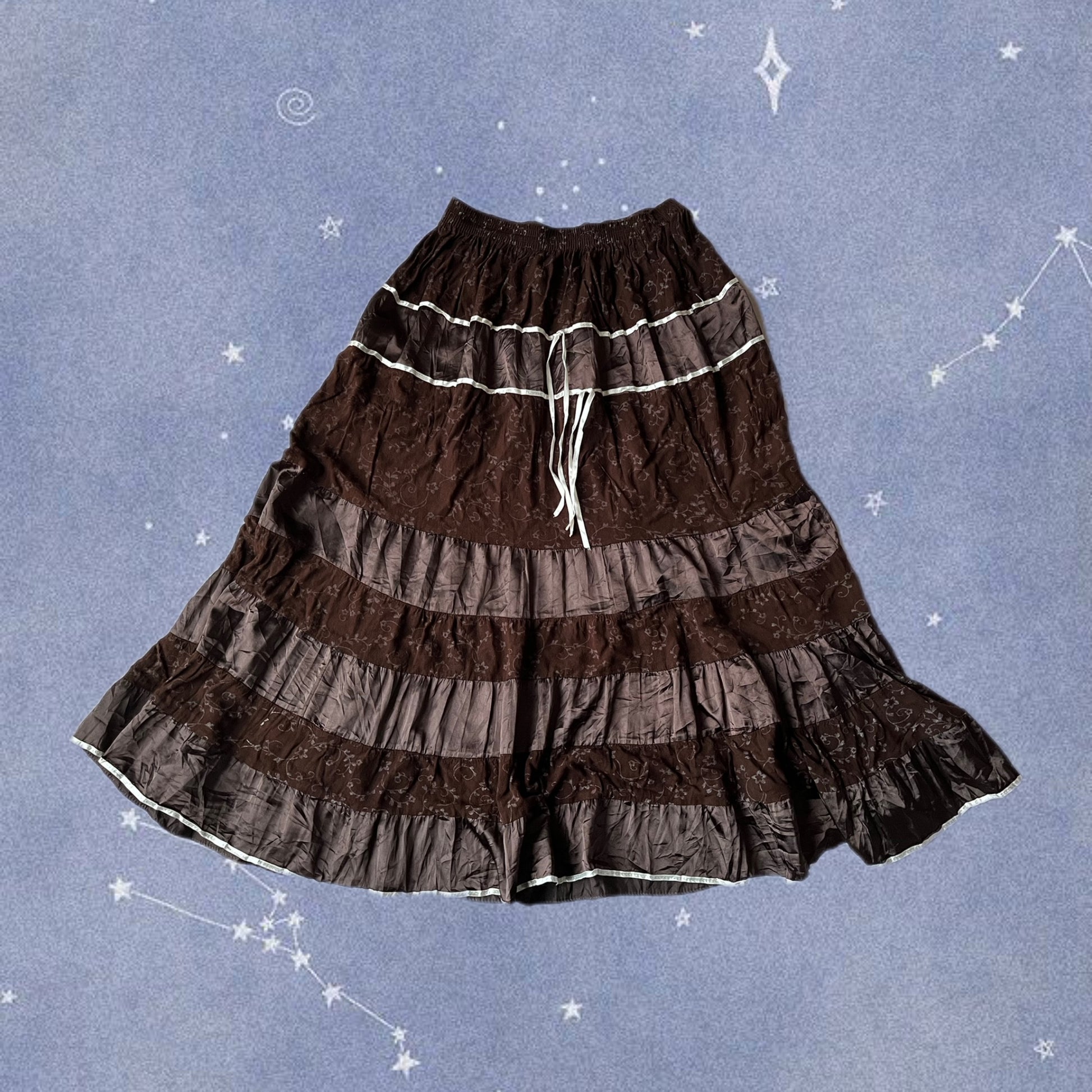 Beautiful 90s brown tiered skirt! This has a tiered shape and floral details. Stretchy waist.