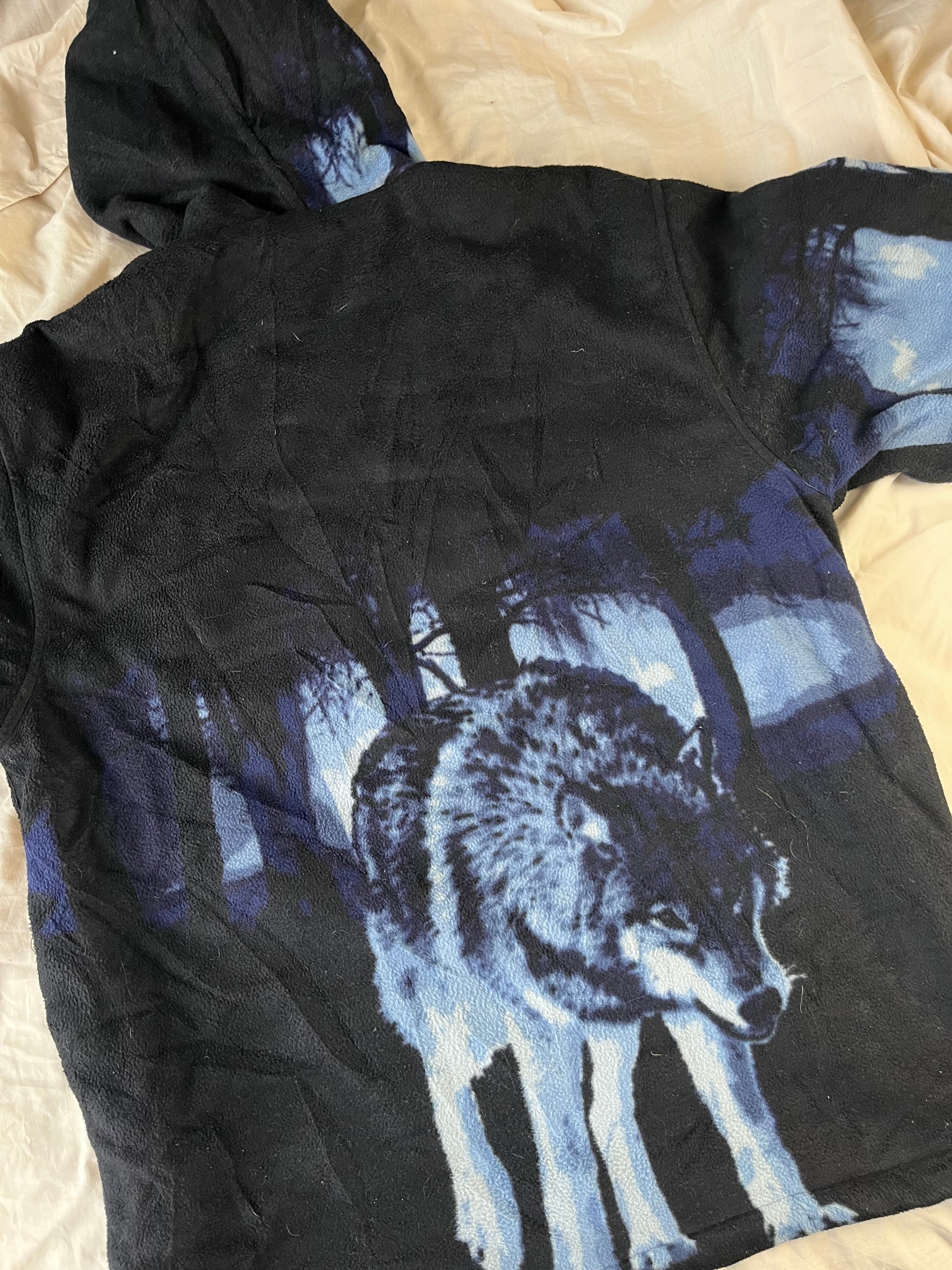 Amazing 1990s fleece jacket! Zip up front with an amazing wolf design on the front and back and a hood. In perfect vintage condition and would best fit UK 6-22 depending on desired fit, best fit UK 16-22.