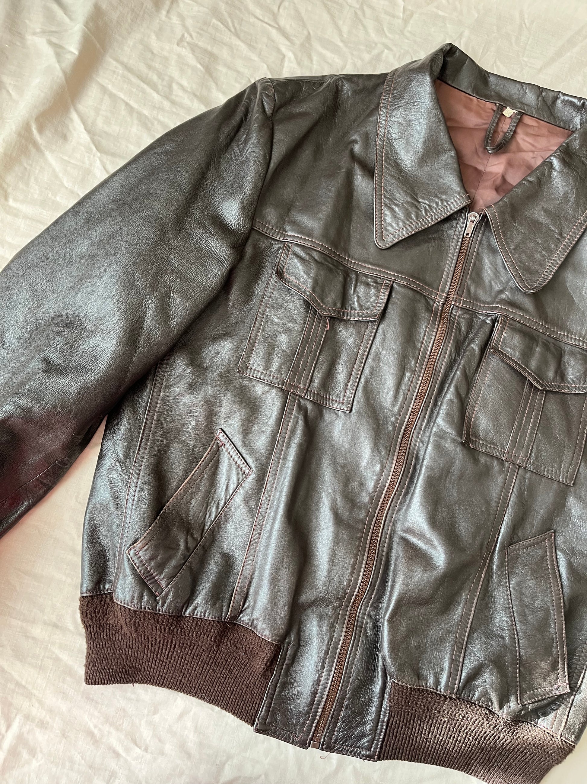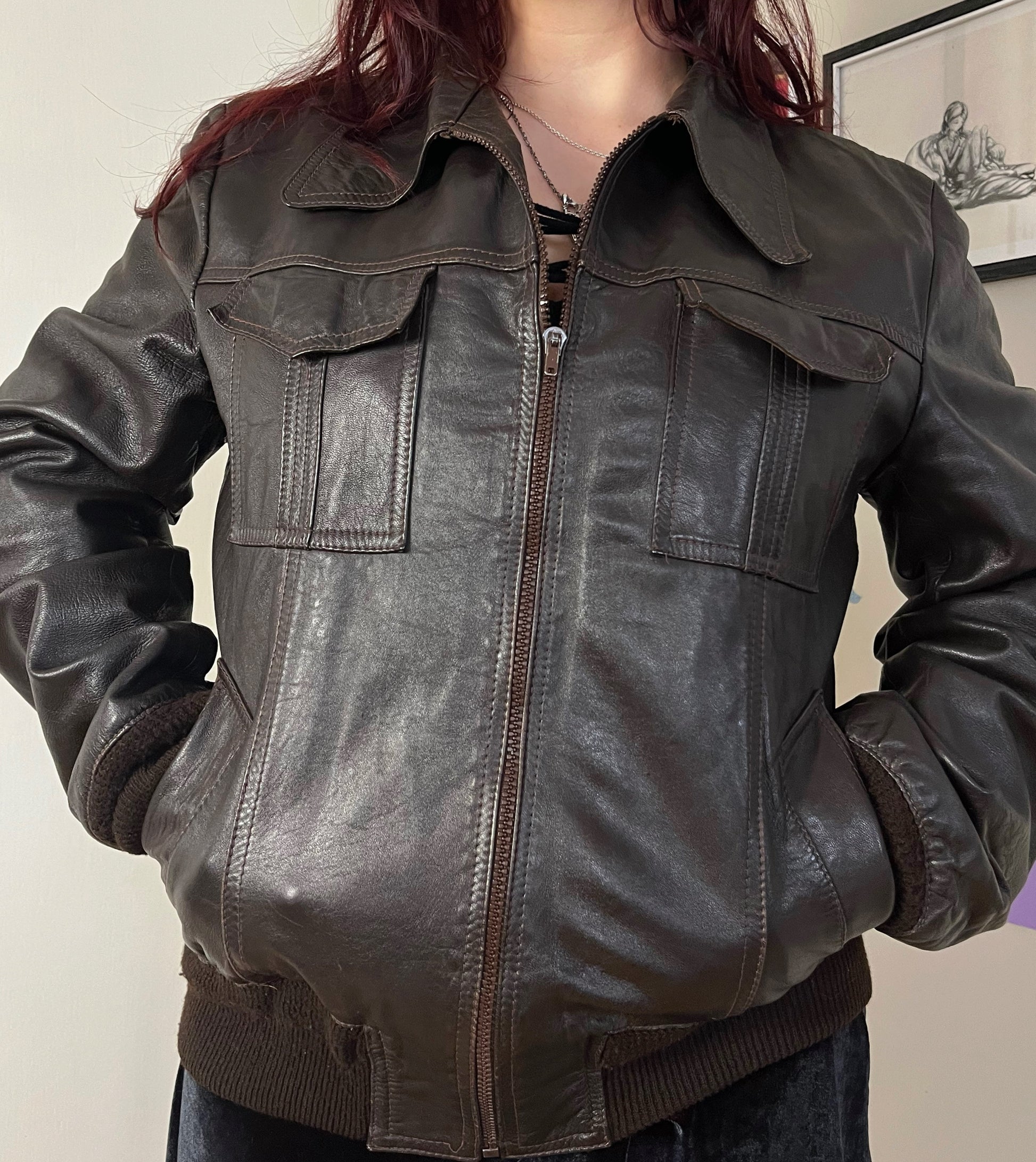 Gorgeous 1990s brown leather jacket! Oversized fit and zips up on the front. Can fit multiple sizes as its designed to be worn oversized. Genuine leather.