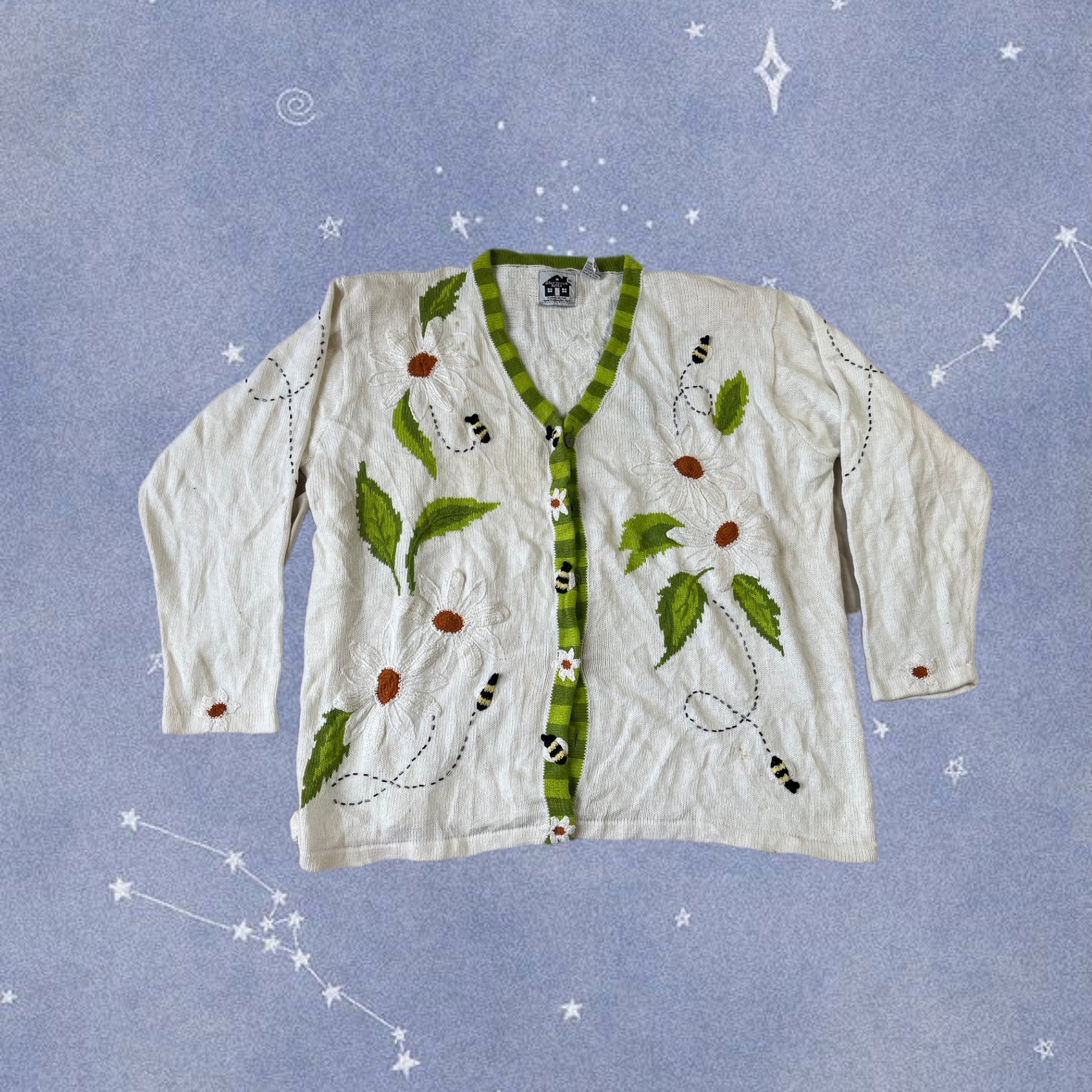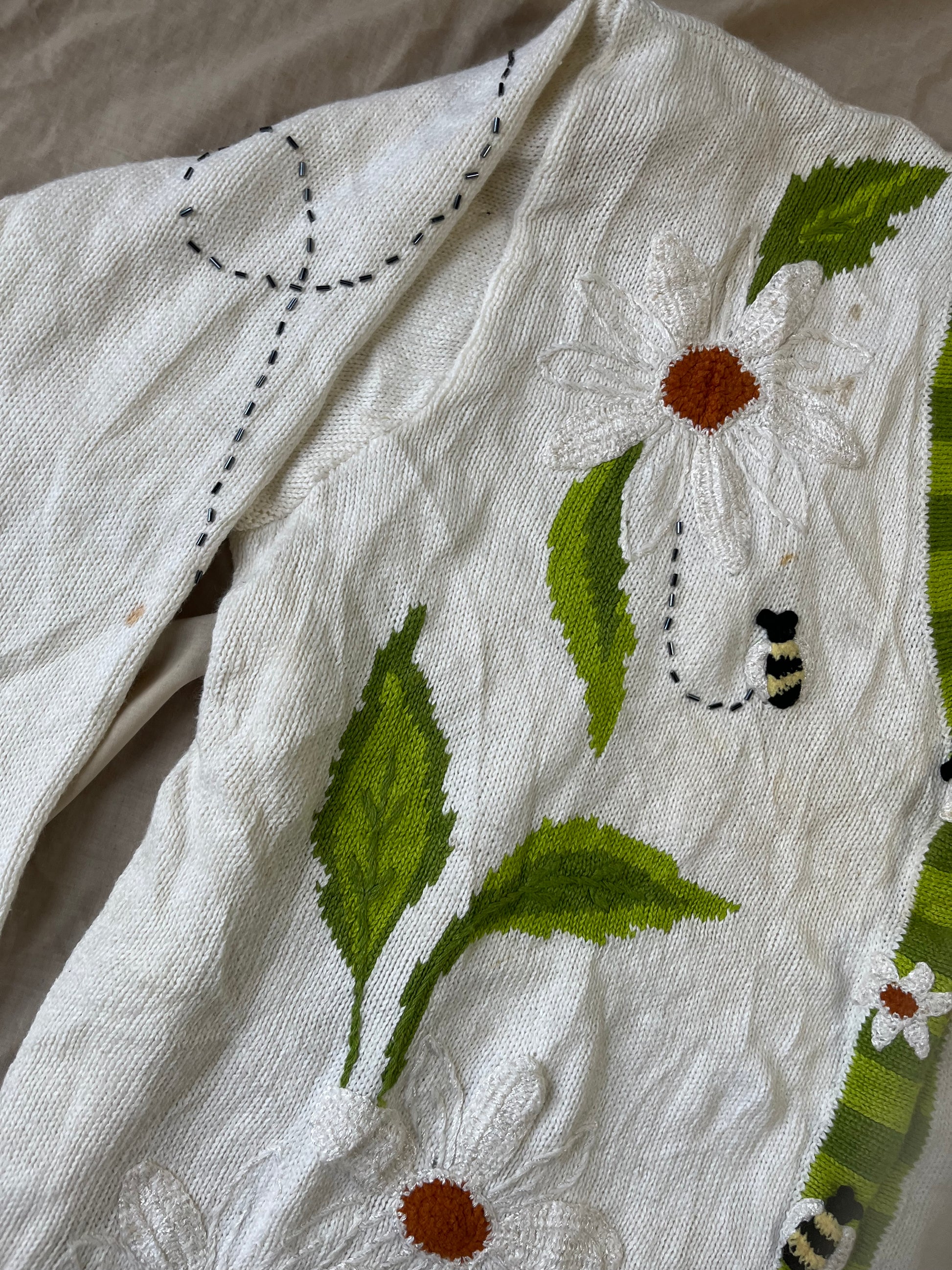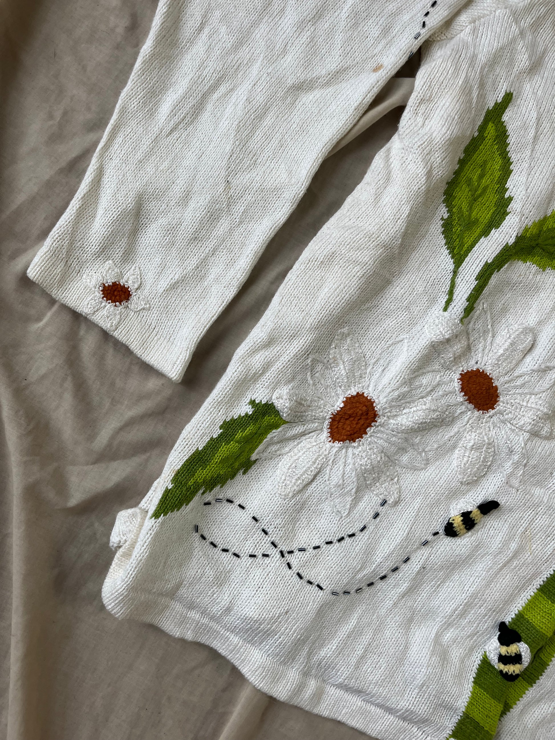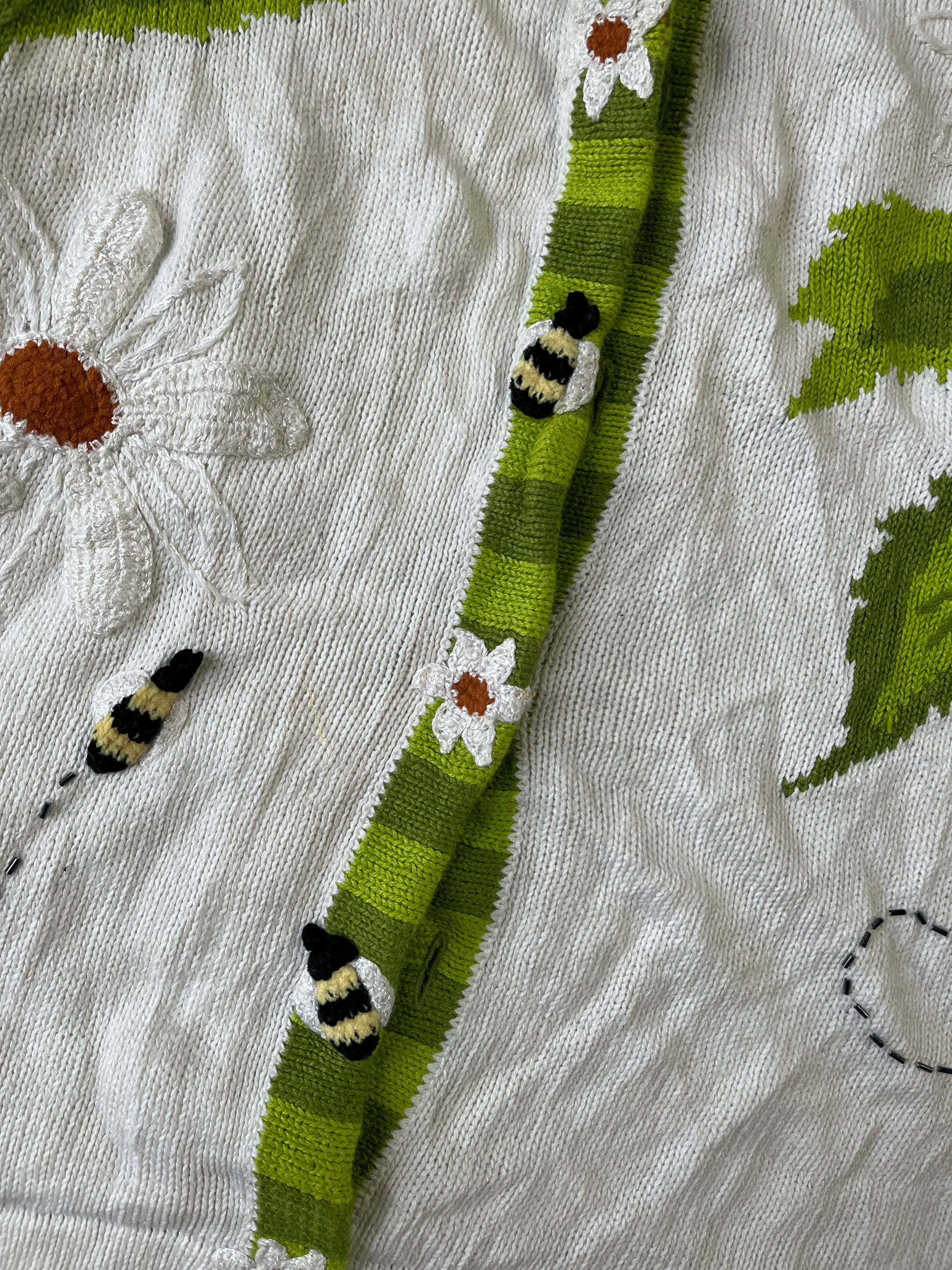 Amazing 1990s white cardigan with a daisies and bees design all over! This is a rare and much sought after piece. Made from ramie and cotton.