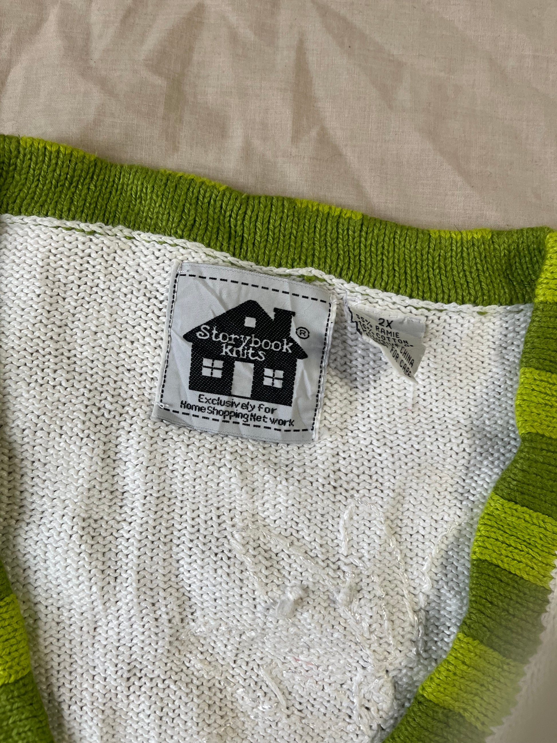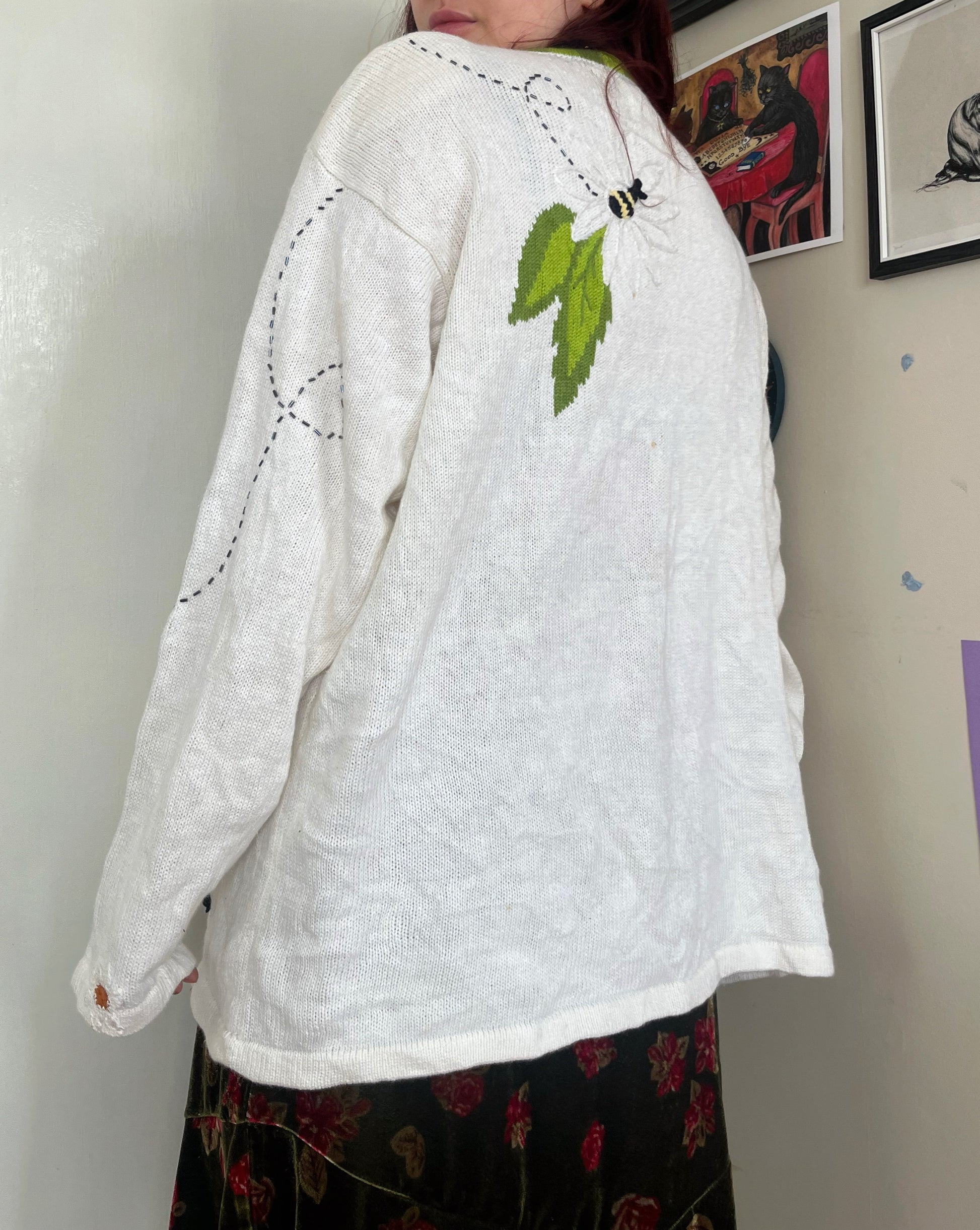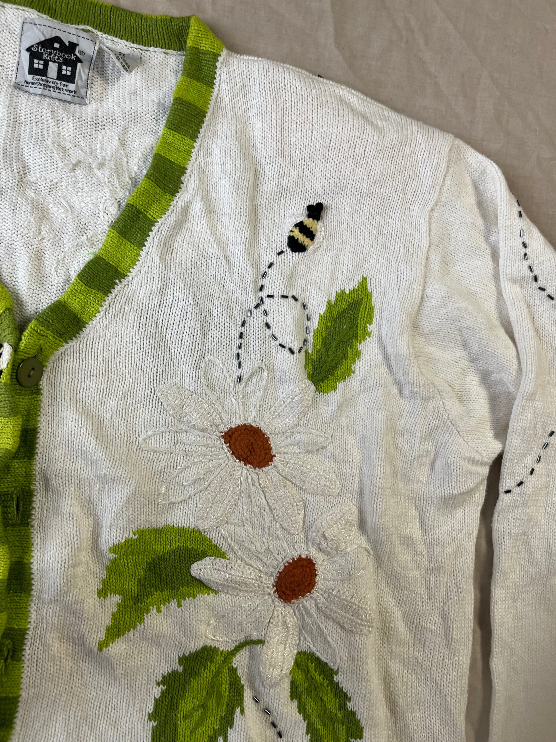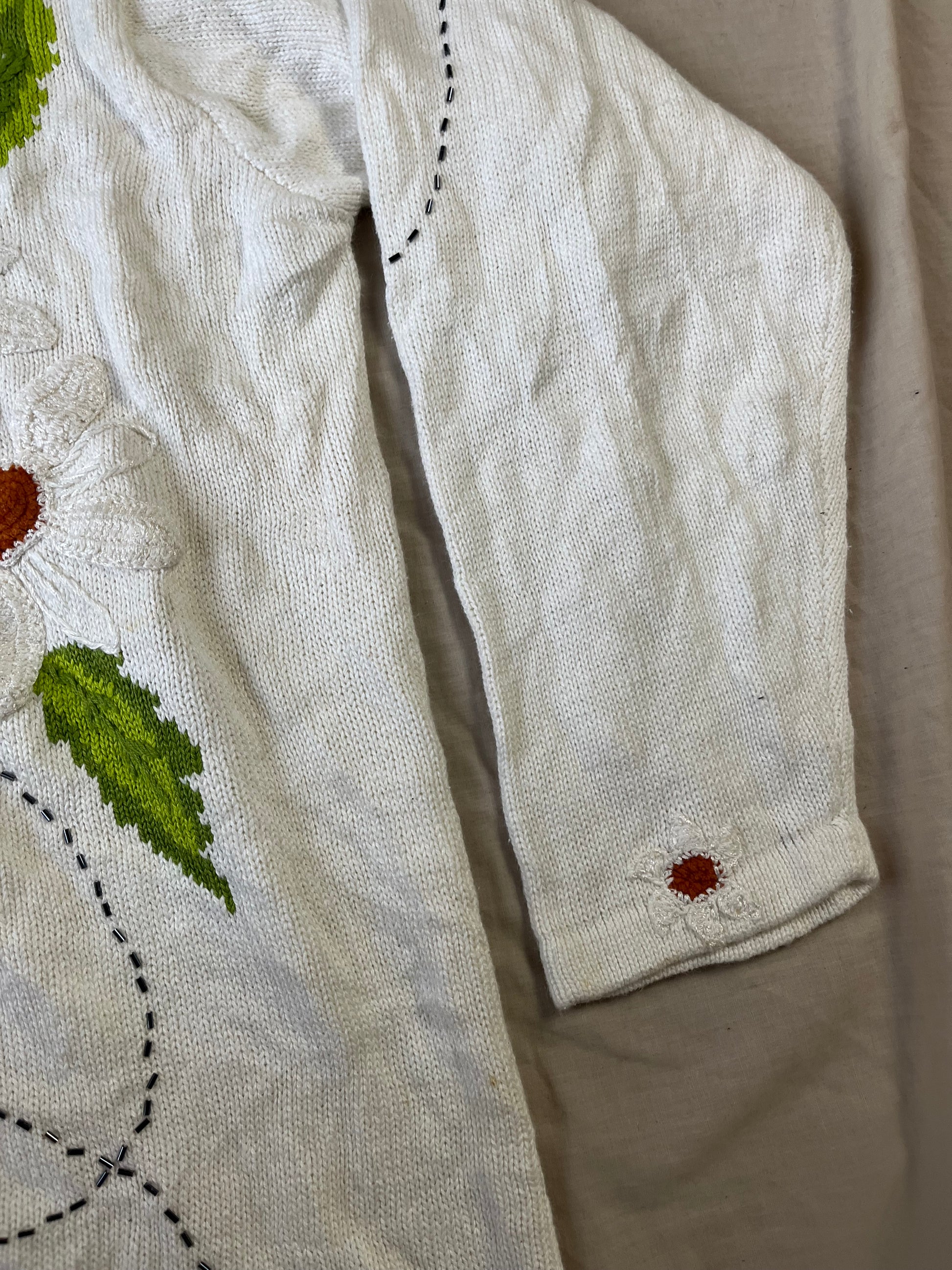 Amazing 1990s white cardigan with a daisies and bees design all over! This is a rare and much sought after piece. Made from ramie and cotton.
