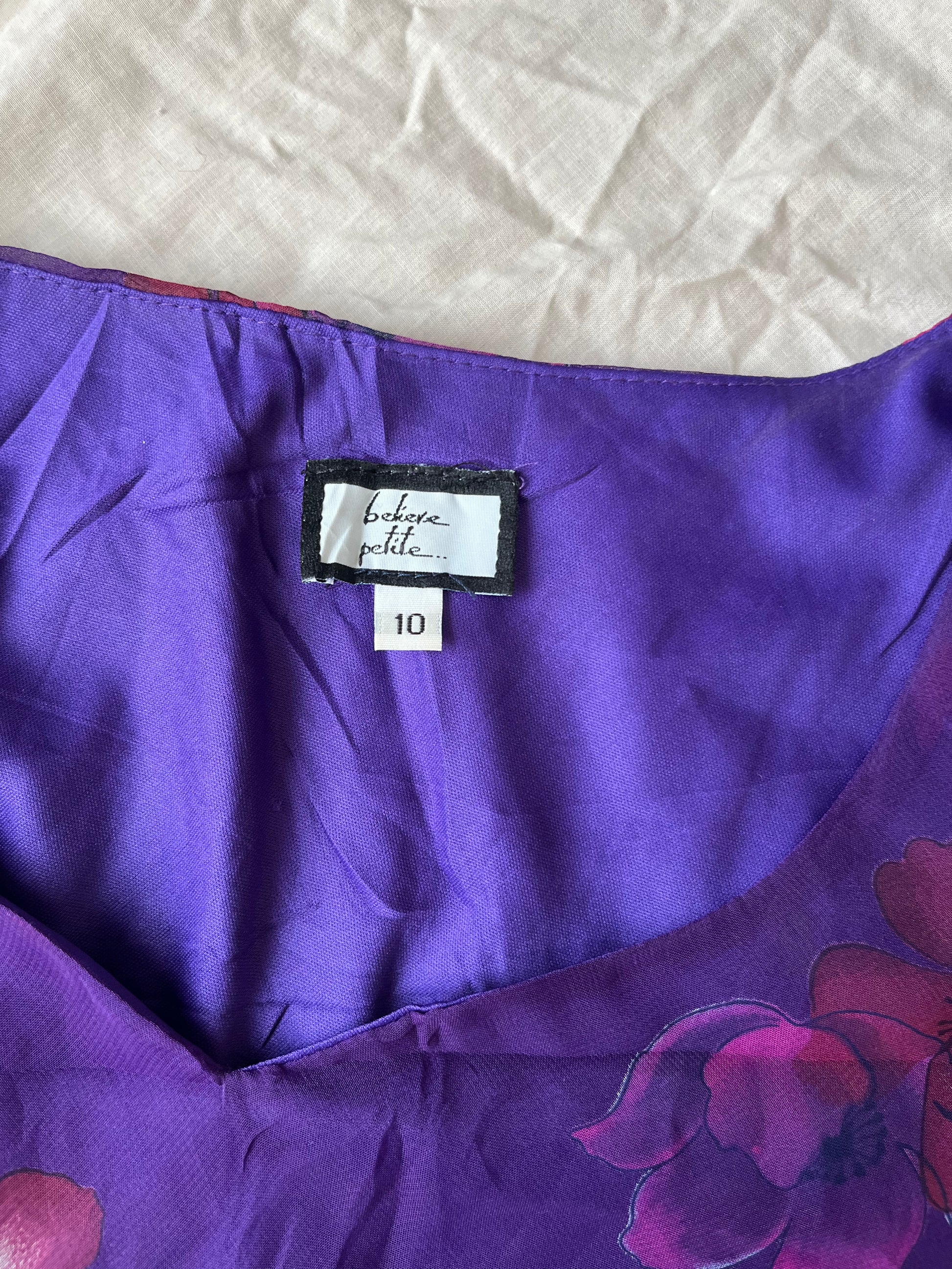 Gorgeous 2000s purple floral dress! This has an asymmetrical hem and a loose fit.