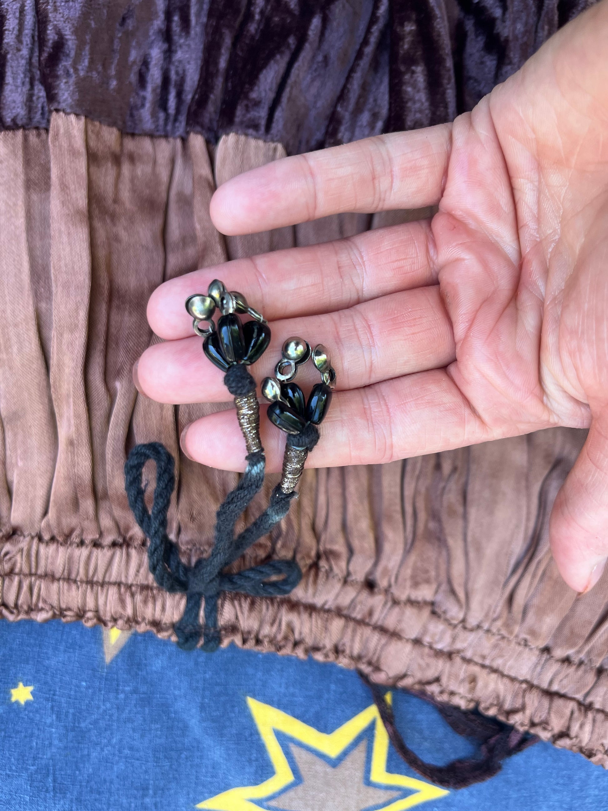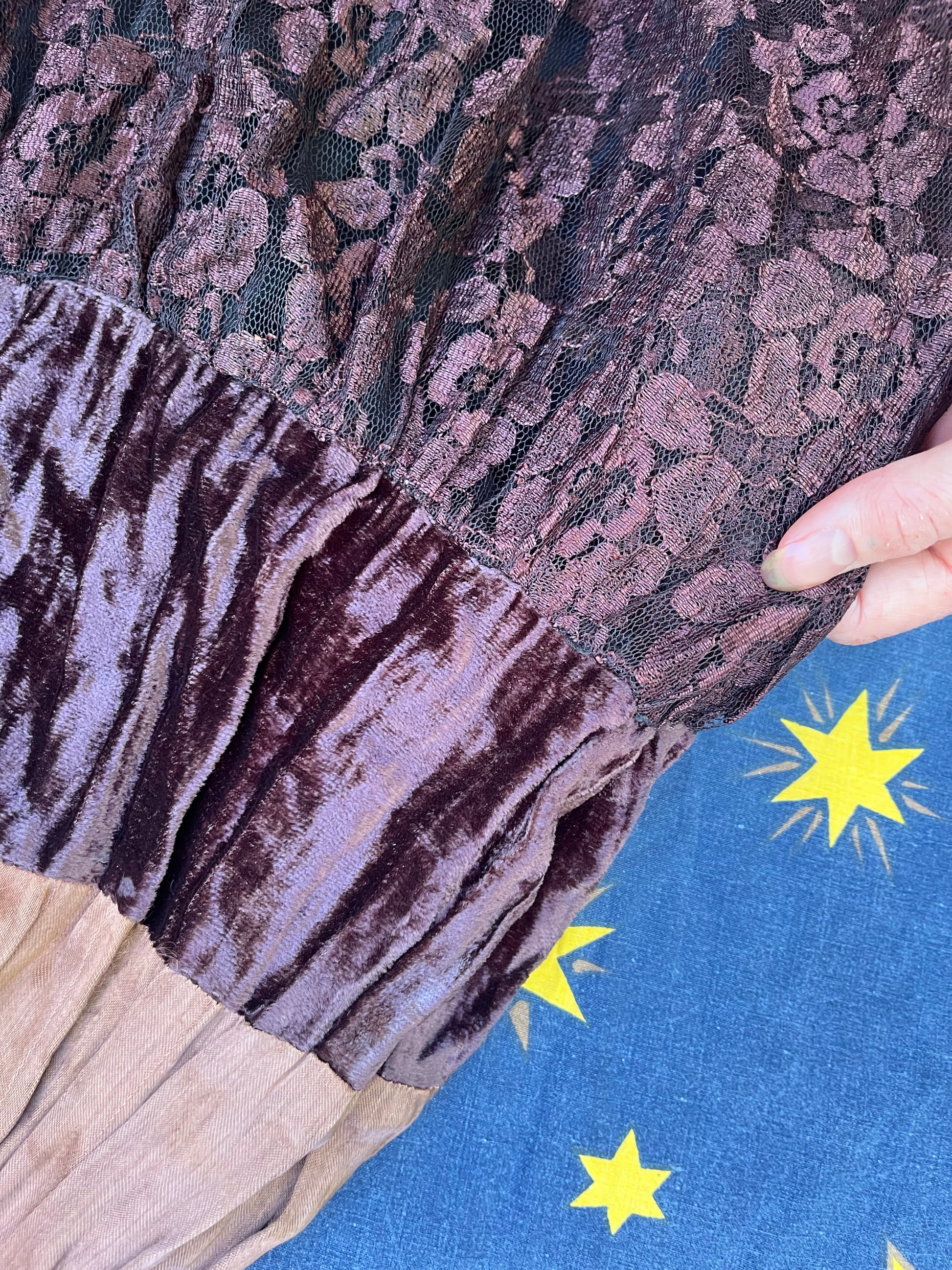 Whimsigoth 90s brown long skirt with a tiered velvet and lace design! Stretchy waist. In perfect vintage condition and would best fit UK 6-14 as the waist can stretch.