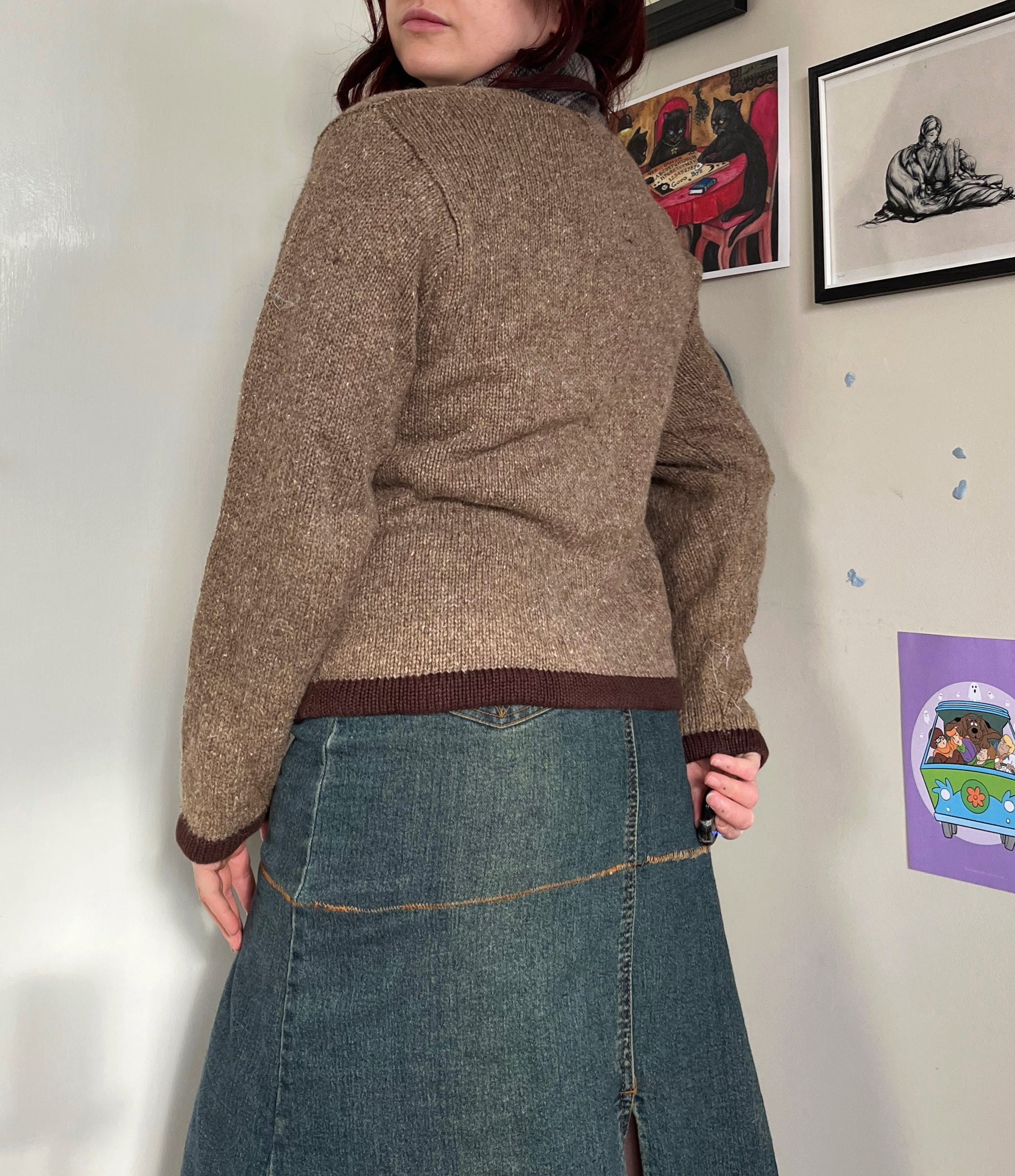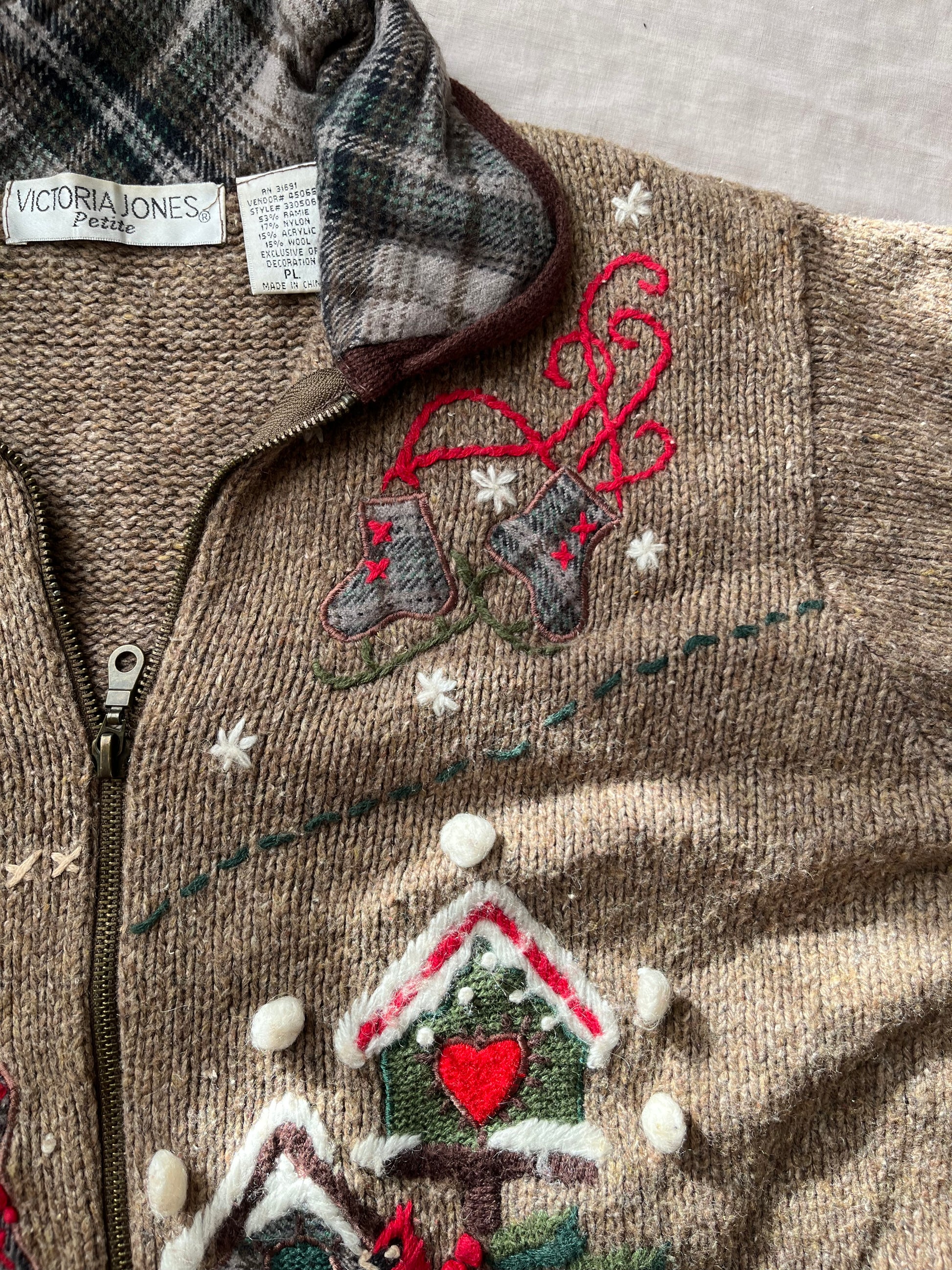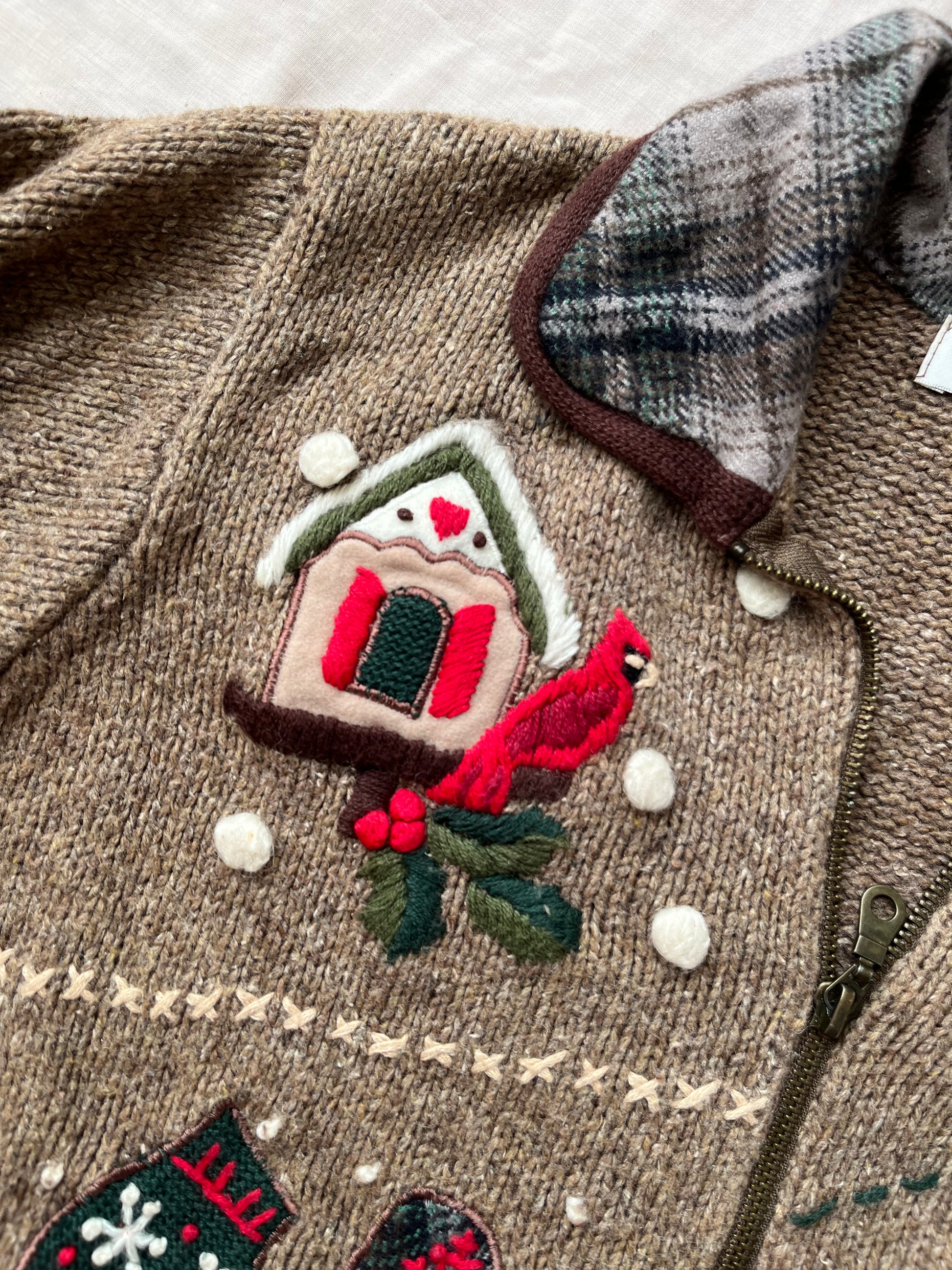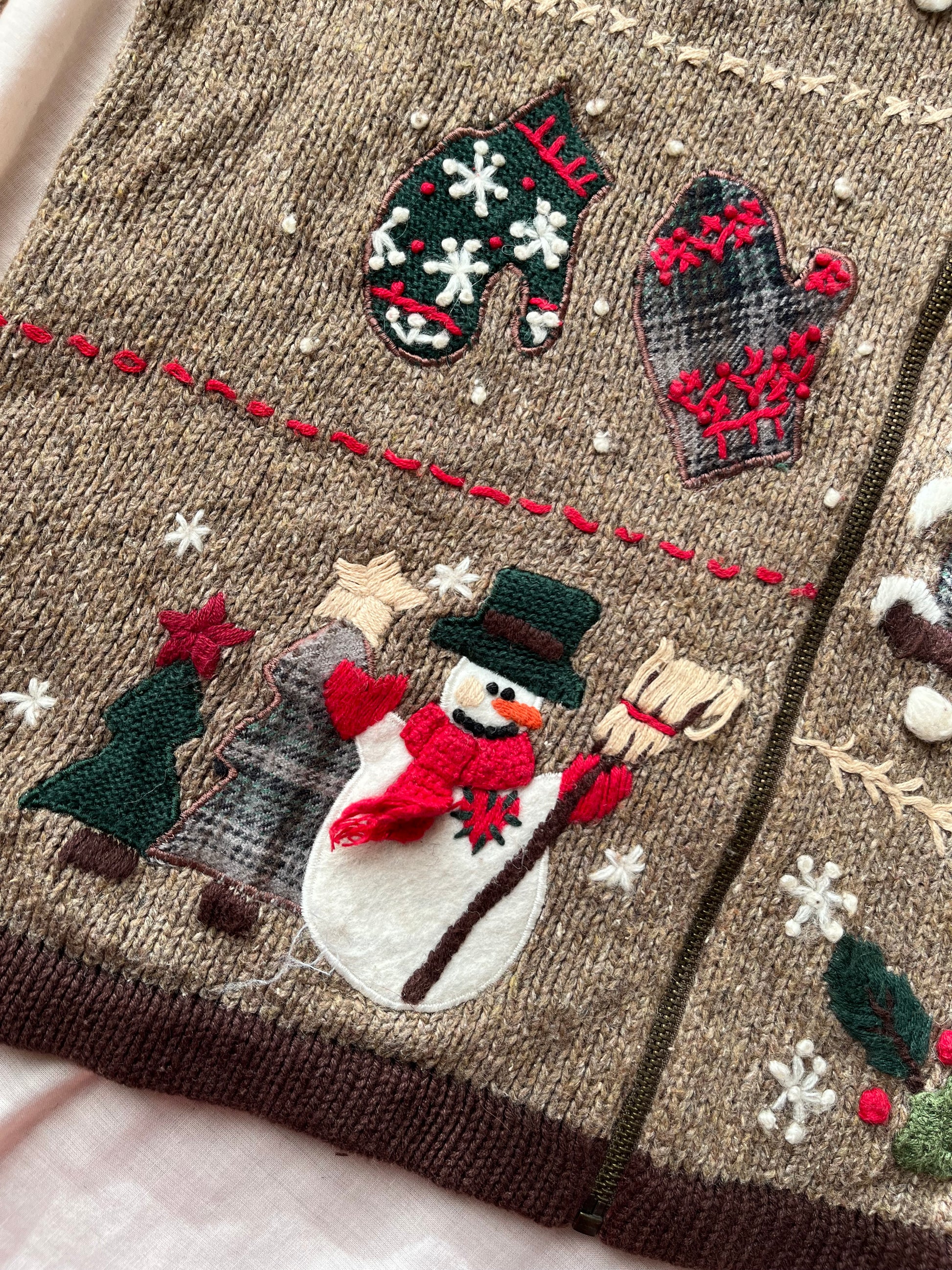 1990s brown festive cardigan! Features a zip up front and a design of winter scenes on the front.