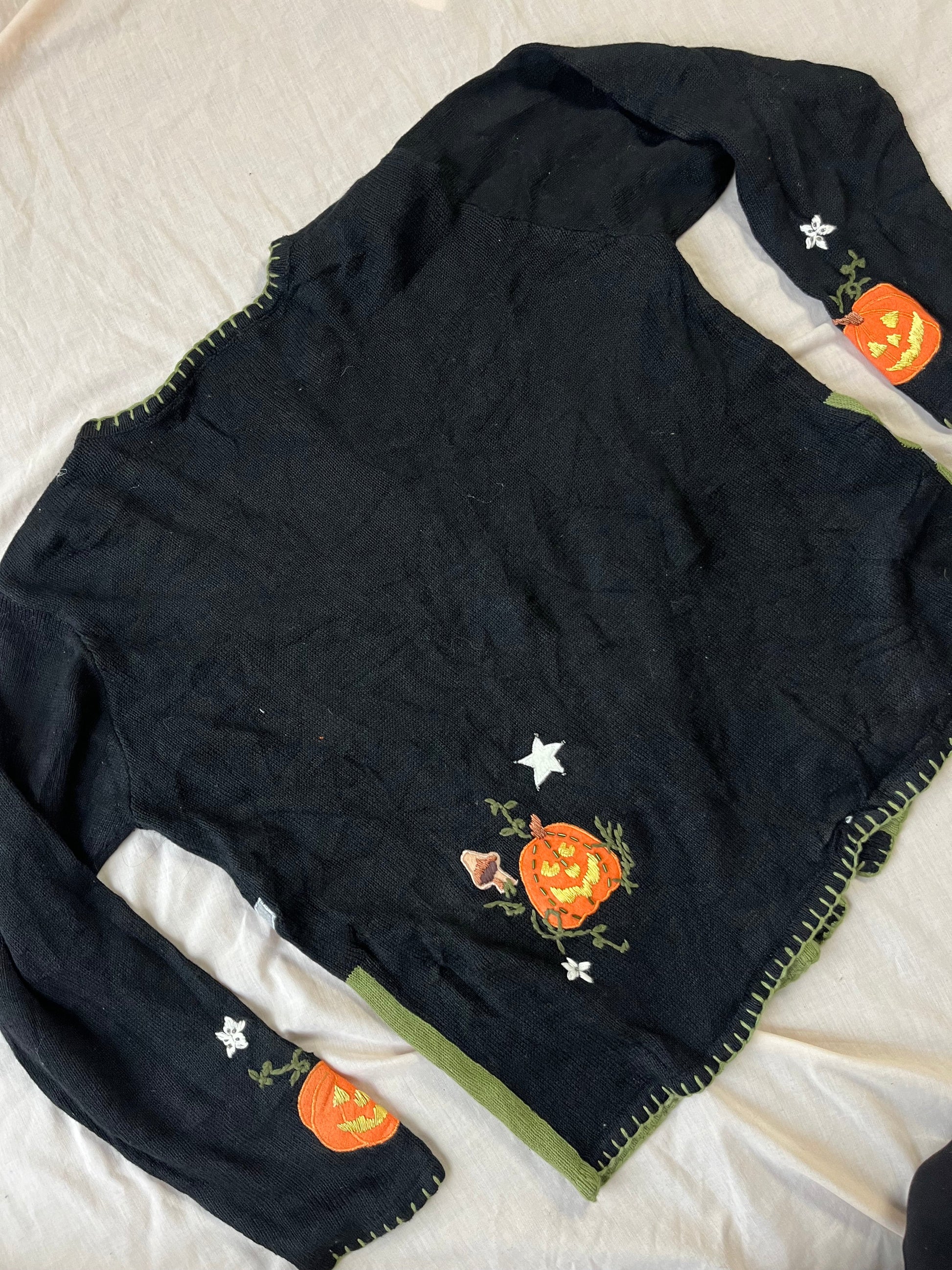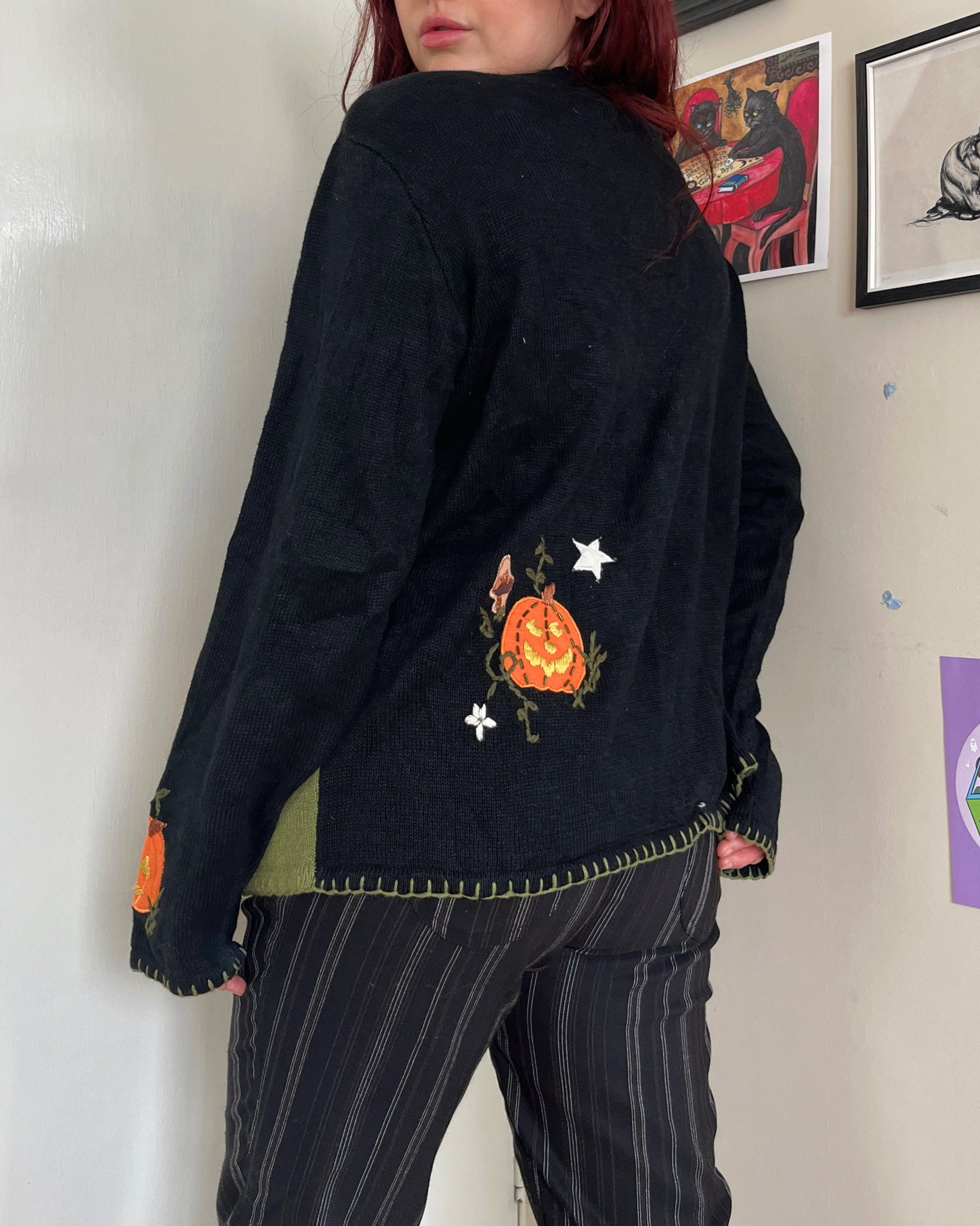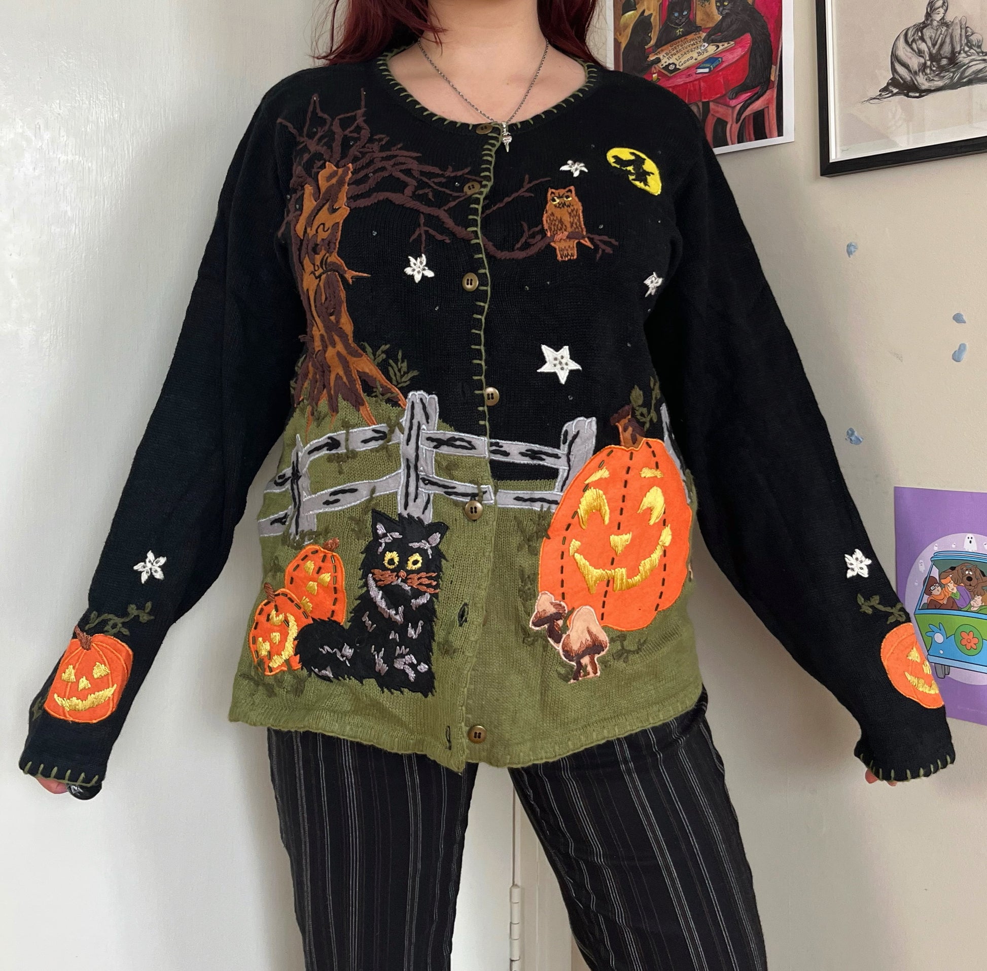 1990s Halloween button up front cardigan! Has a night scene of a black cat, trees, pumpkins and more on it!