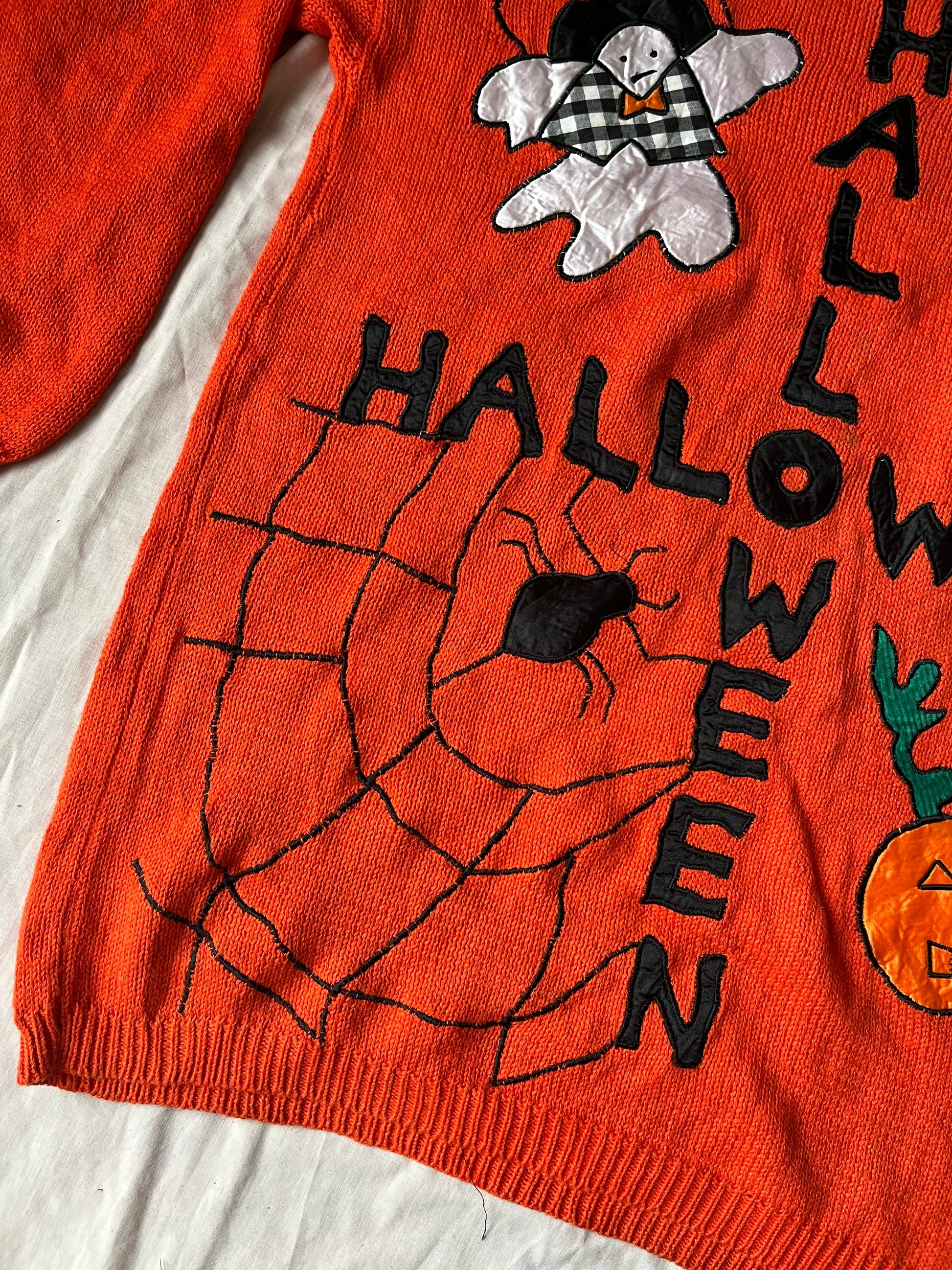 1990s Halloween jumper! Has an amazing design of a Halloween spell out across the chest, a witch on a broom, a pumpkin, ghost and spiderweb. Labelled M, fits like L.