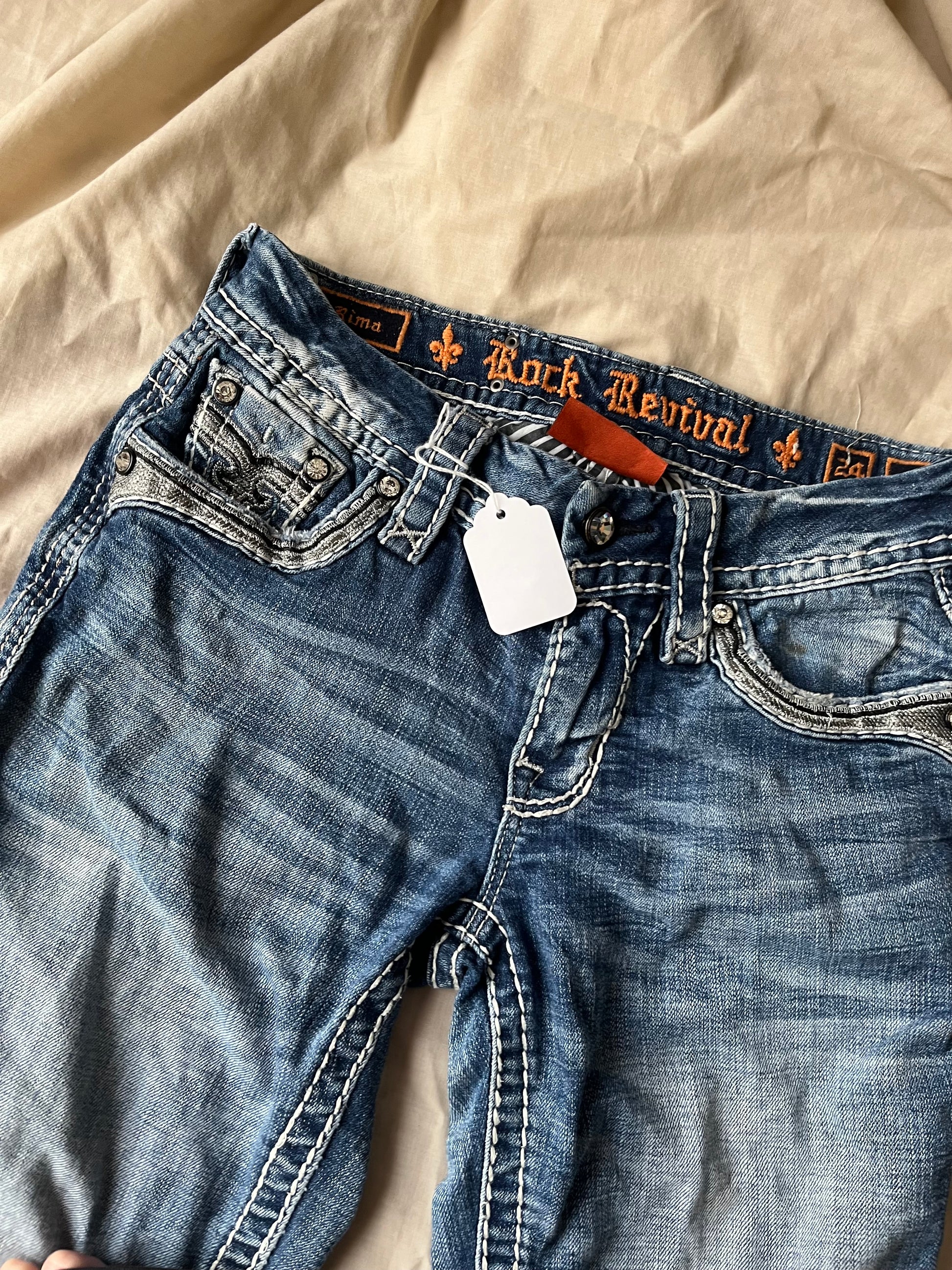 Amazing 2000s Rock Revival jeans with a straight leg! Has a flattering fit, cool design on the back pockets and low waist.